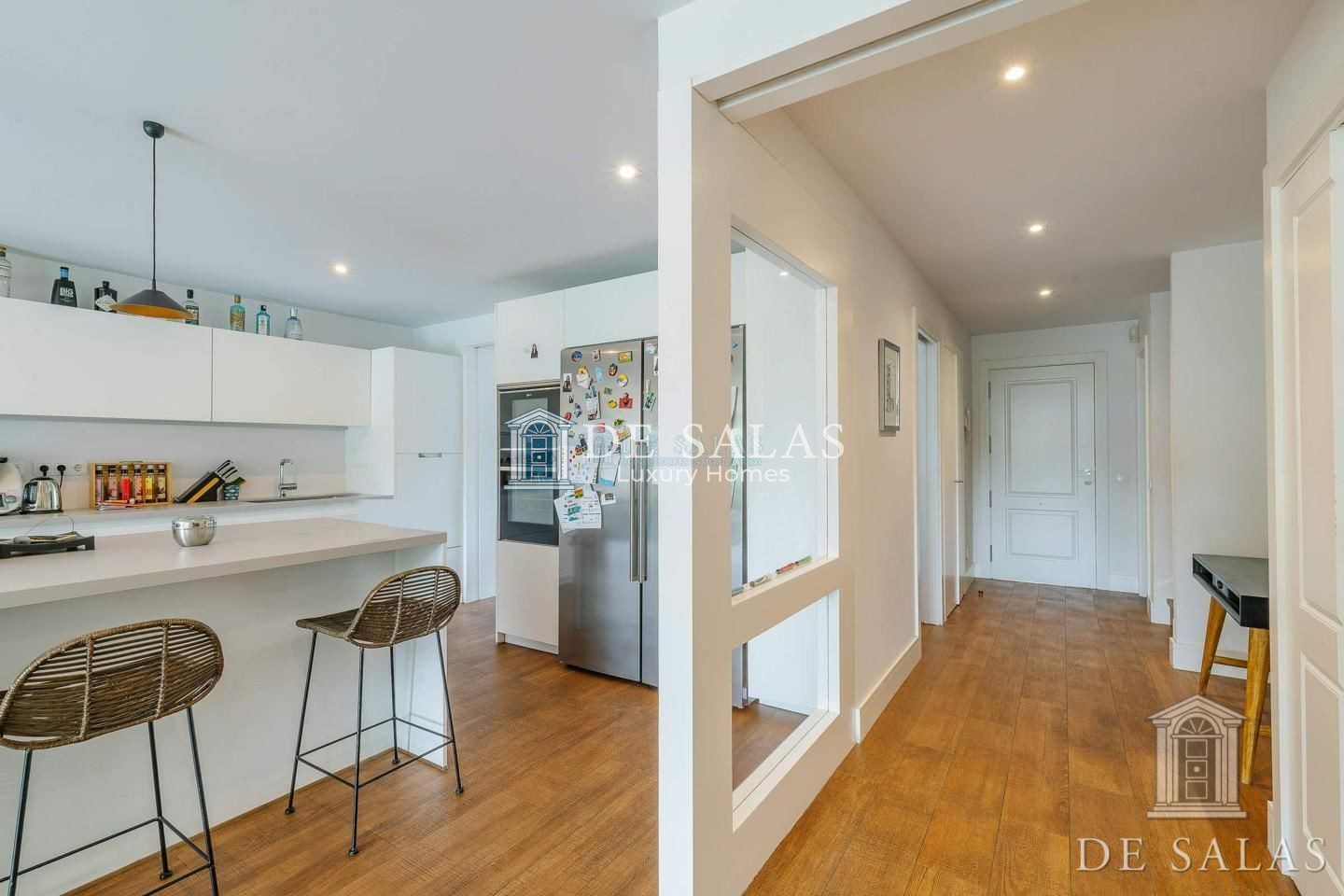 La cocina, con mobiliario blanco, electrodomésticos de primeras marcas y una estupenda isla central de la prestigiosa SANTOS, tiene una puerta acristalada encastrada por si prefieren independizarla del Salón-Comedor y a la vez no perder la magnífica sensación de amplitud que brindan los acertados cerramientos de cristal.