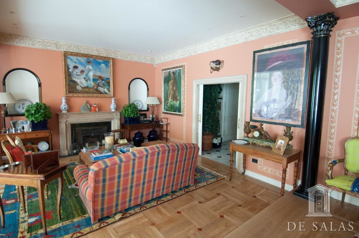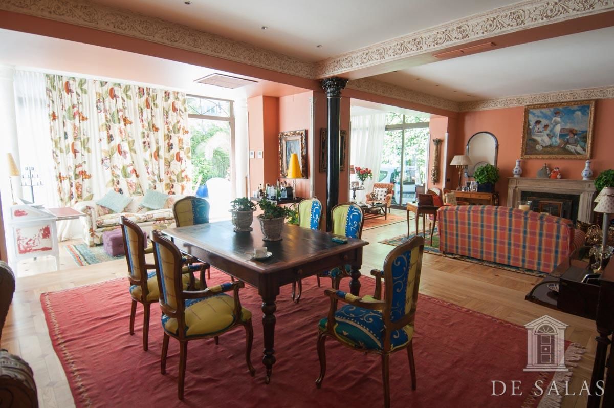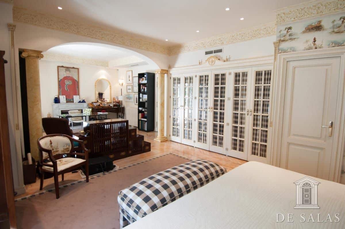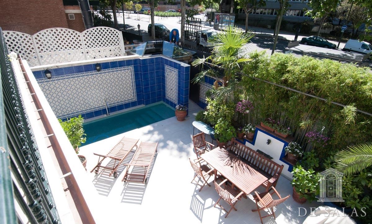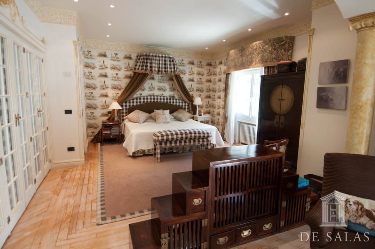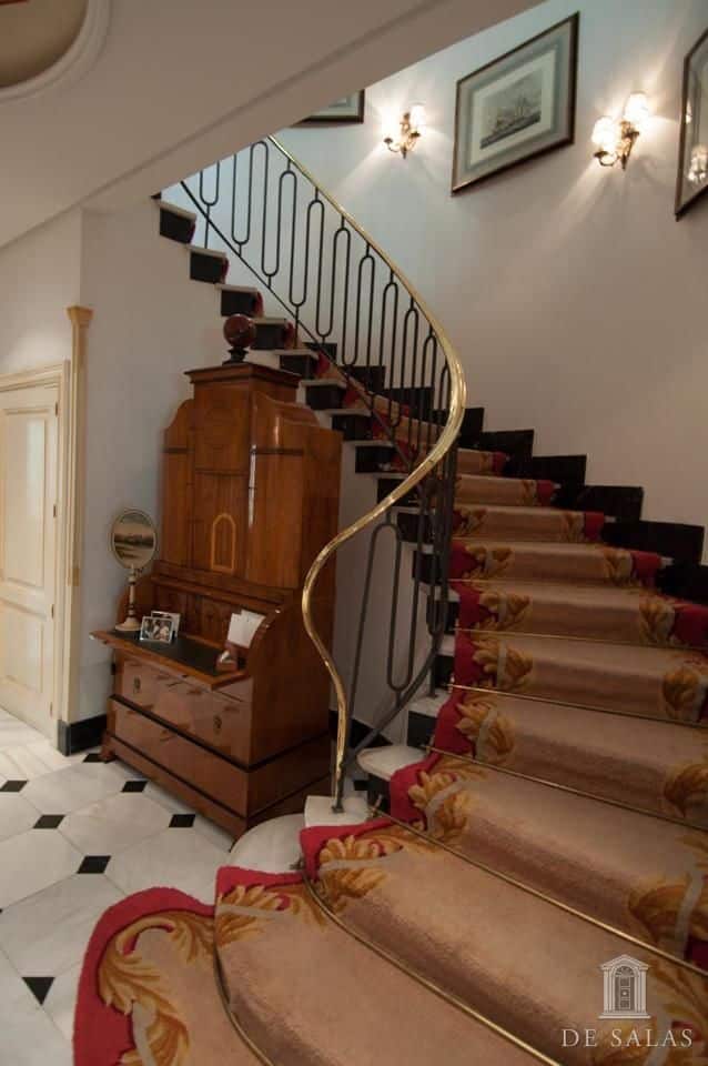 De Salas presenta este magnífico chalet en El Viso, antigua embajada, que consta de dos edificios de aproximadamente 550 m² + 300 m², unidos por una terraza interior y sótano. La parcela tiene aproximadamente 727 m2. El edificio de 550 m2 consta de 3 plantas: Planta baja, zona de servicio con dos habitaciones y un baño, lavadero y almacén trastero, bodega climatizada, gran salón de juegos y amplia habitación. La planta principal, antigua residencia del embajador, se accede por una puerta protegida con dos columnas de mármol, vestíbulo distribuidor, dónde nos encontramos una escalera señorial de grandes dimensiones que nos da acceso a la planta superior. Además, consta de baño de cortesía, despacho con salida a una amplia terraza, salón de grandes dimensiones, más de 100 m2, con salida a una terraza cubierta con comedor de verano y piscina. Además cuenta con un comedor principal y cocina con acceso por una escalera a la bodega climatizada. La planta superior se distribuye en un amplio distribuidor, dormitorio principal en suite con chimenea y vestidor con amplia terraza, además de otros tres dormitorios de grandes dimensiones. El segundo edificio de 300 m2 aproximadamente, está unido a la antigua residencia por una terraza y tiene acceso por el sótano. Dispone de tres plantas de oficinas totalmente acondicionadas, dos aseos y una sala cine profesional con aforo para veinte espectadores. Consta de preinstalación para el cambio de dichas oficinas por cuatro habitaciones con baños en suite, siendo la planta de abajo un gran salón y la sala de cine profesional. La propiedad, tiene chimeneas, varias terrazas, jardín, piscina, salón de juegos y amplia zona de garajes.