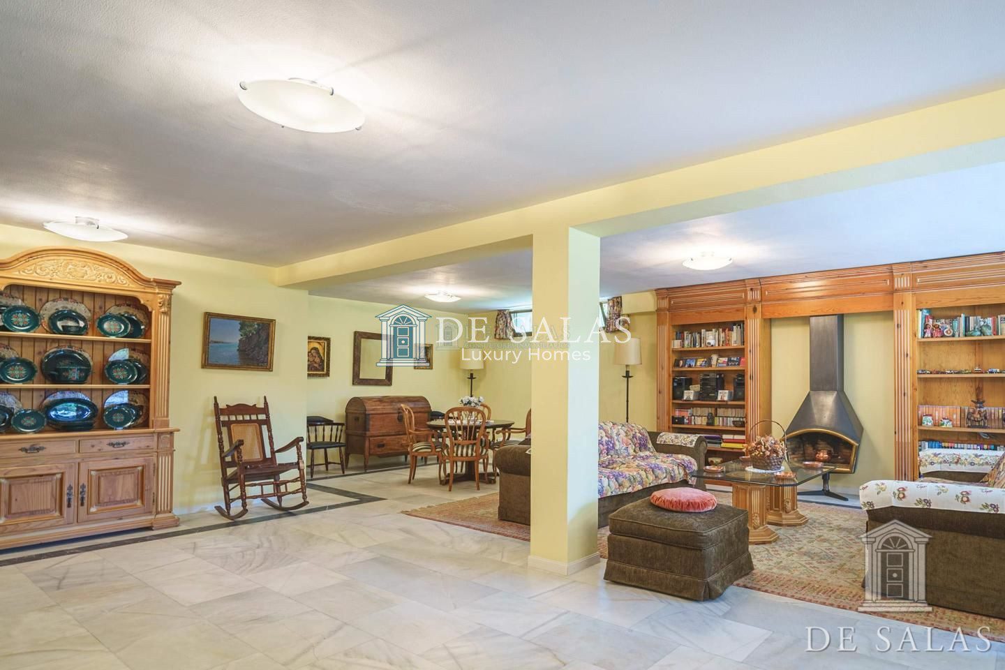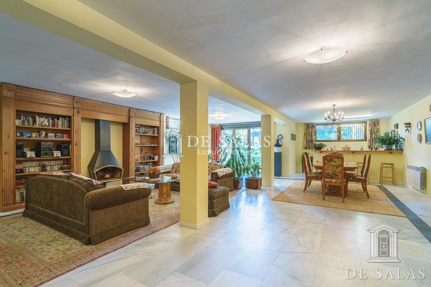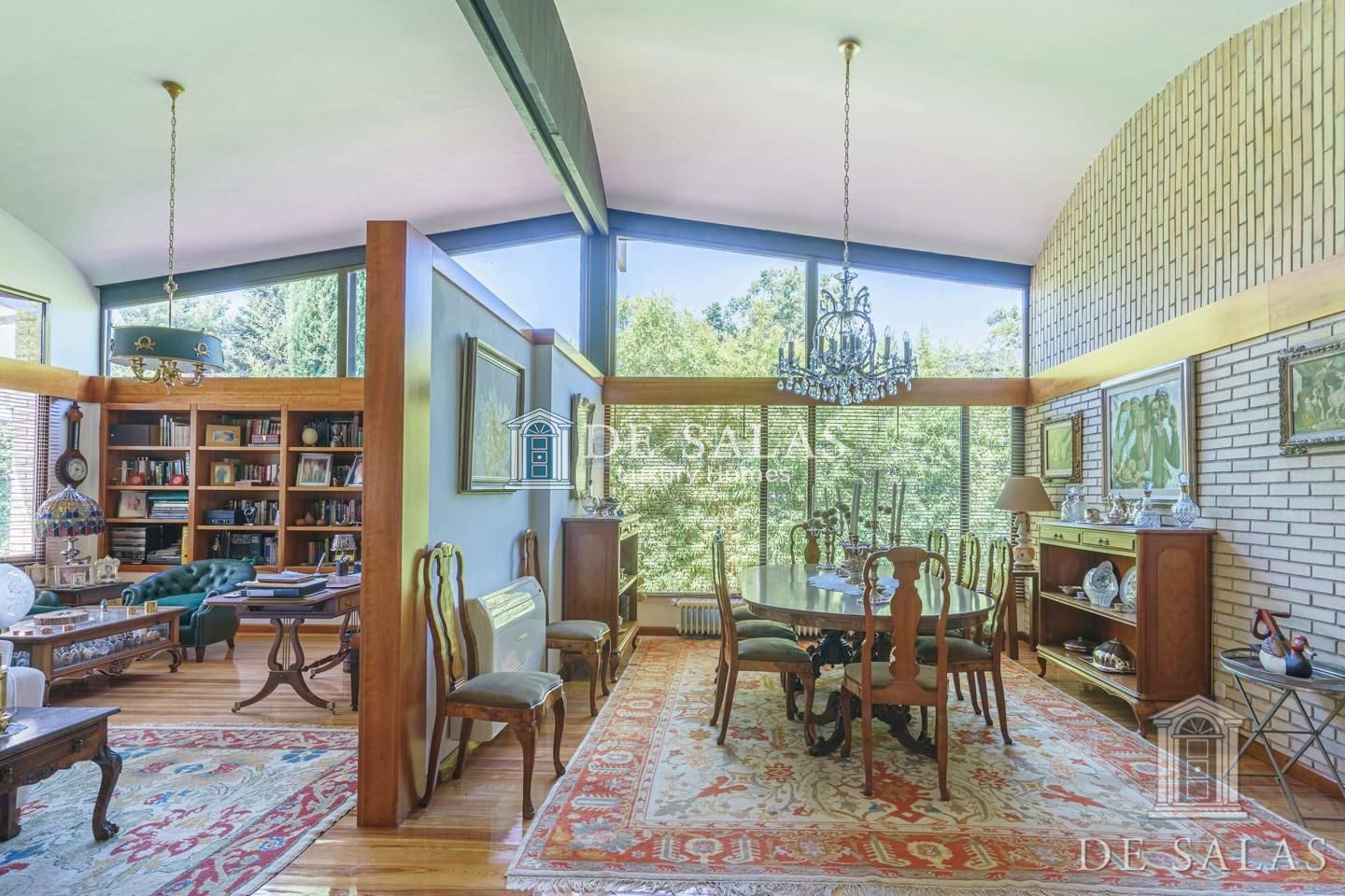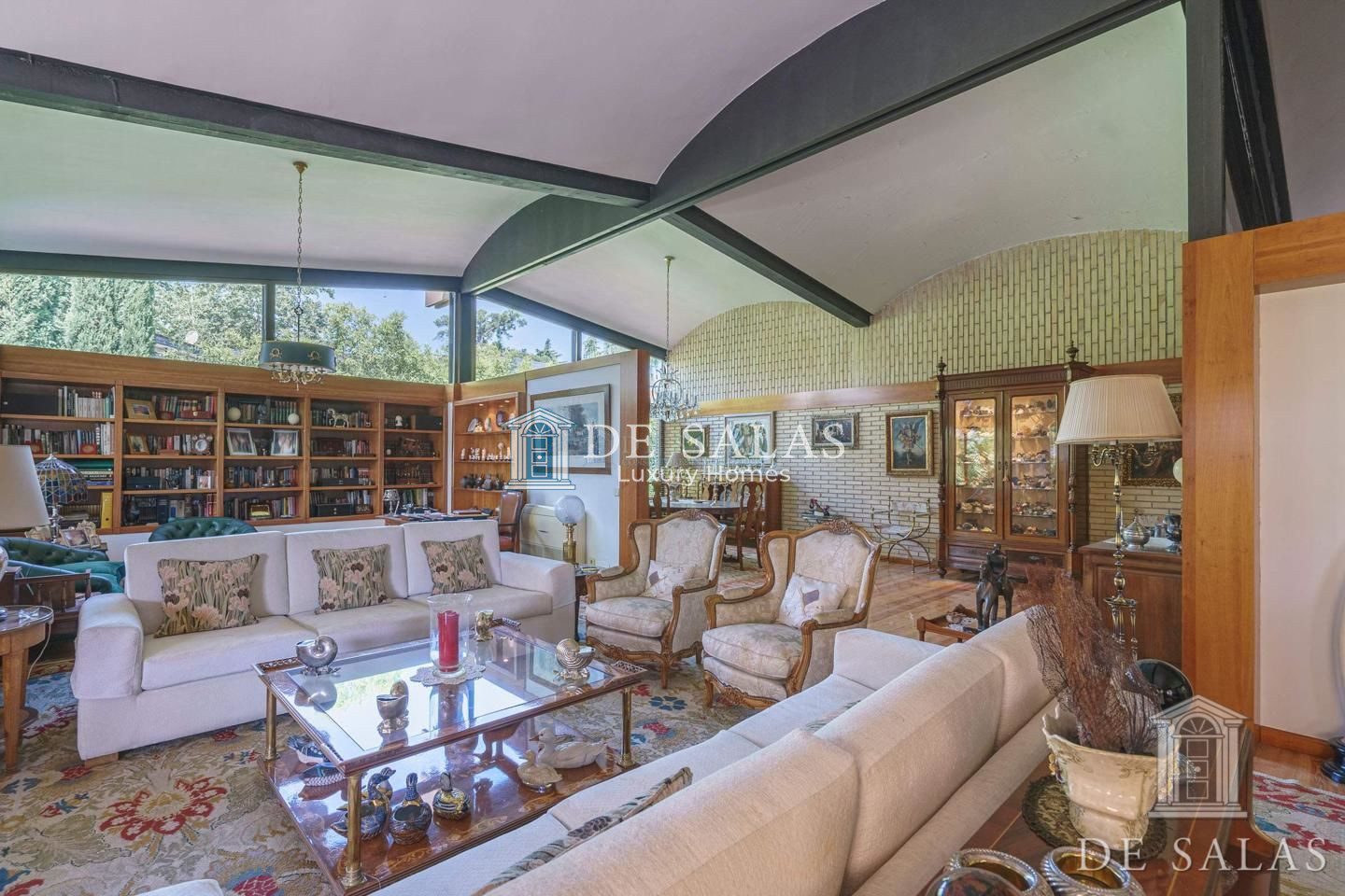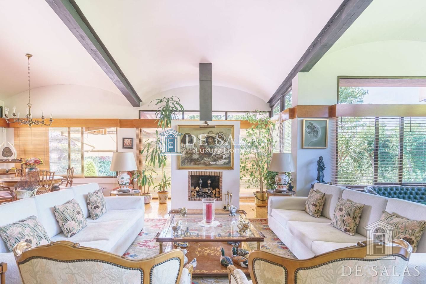 Gran salón comedor en varios ambientes con chimenea, y grandes ventanales con magníficos techos abovedados.
