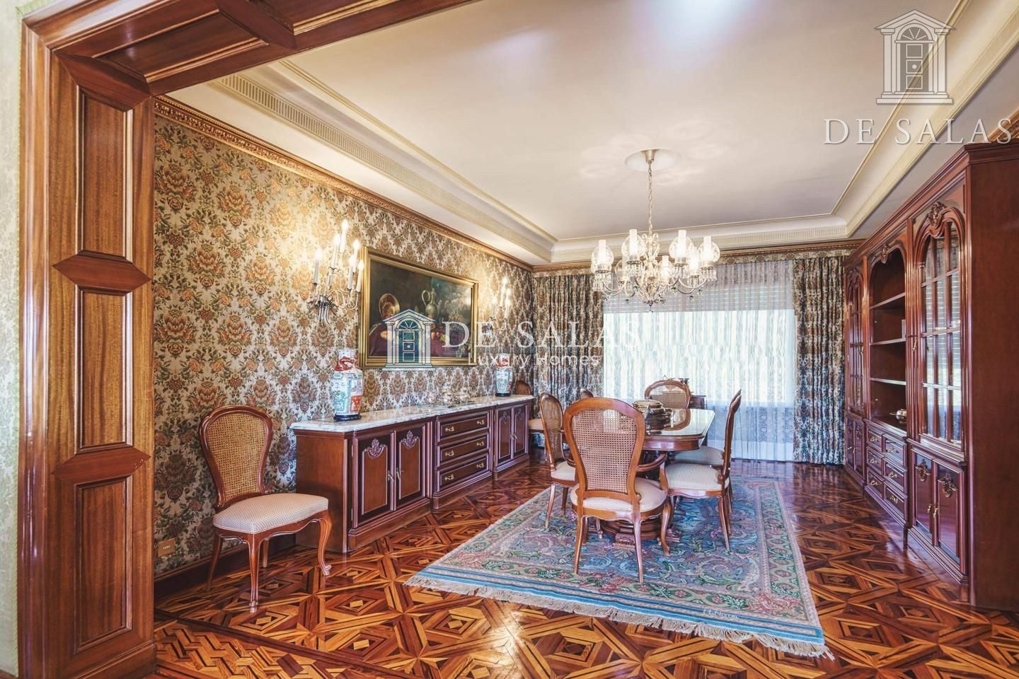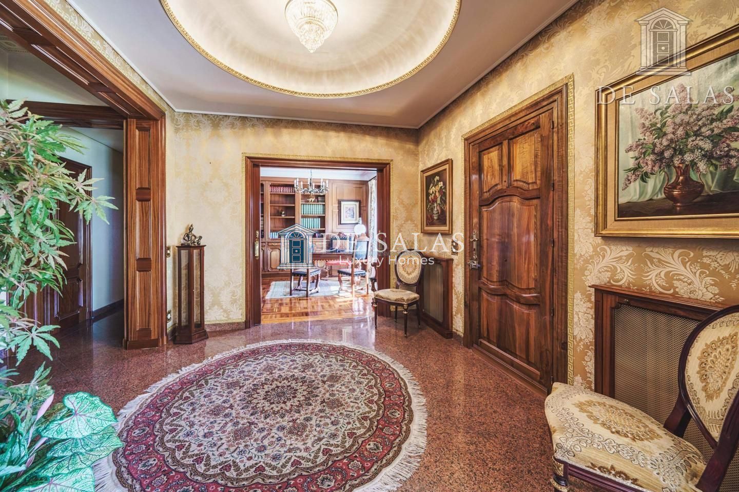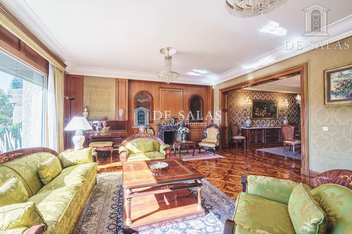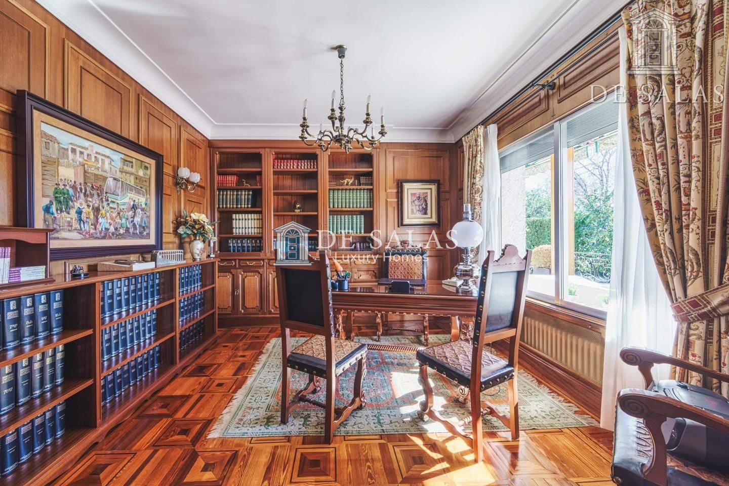 Un maravilloso despacho es lo primero que vemos al entrar a uno de los dos lados del recibidor. Al otro, un gran salón con chimenea que conduce a un comedor independiente con acceso directo a la cocina.