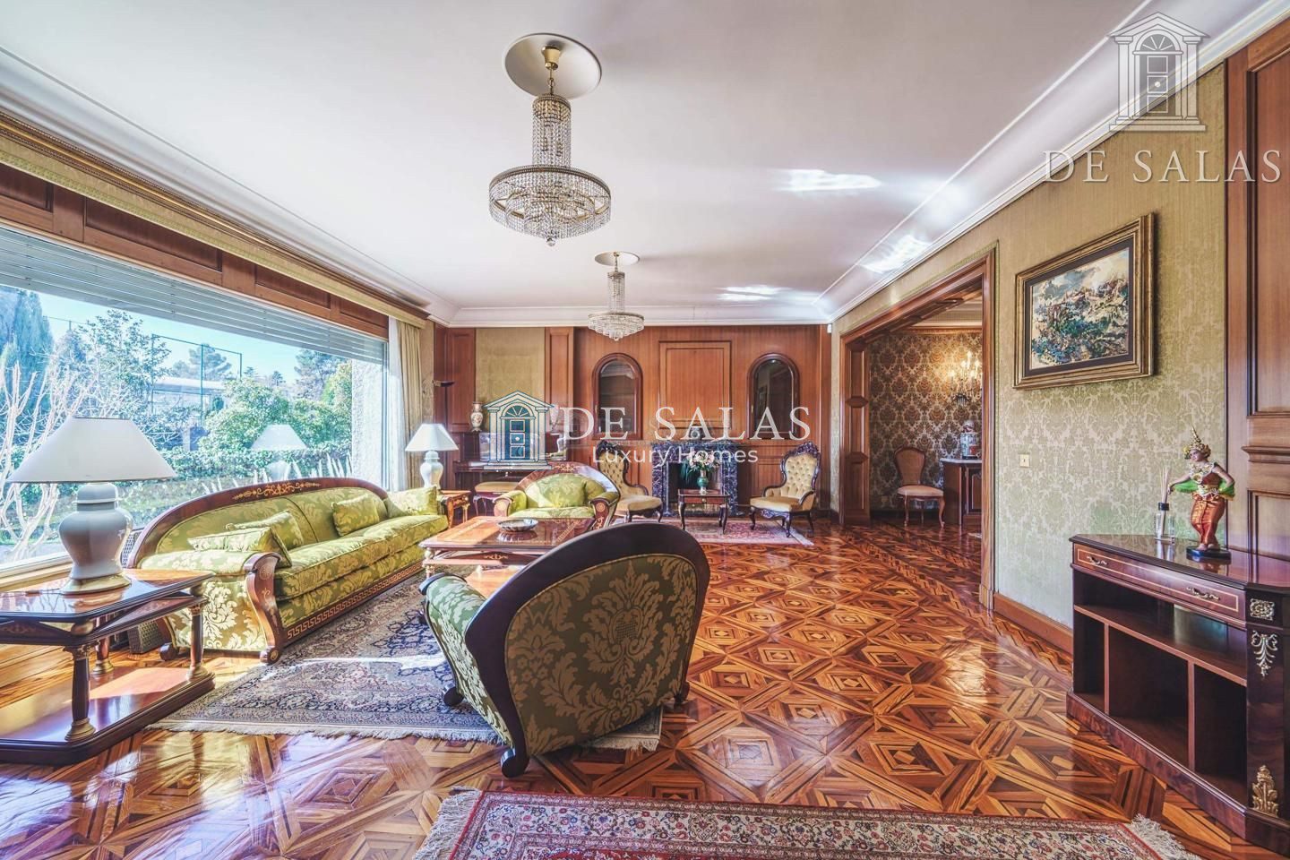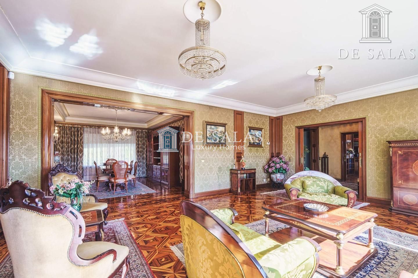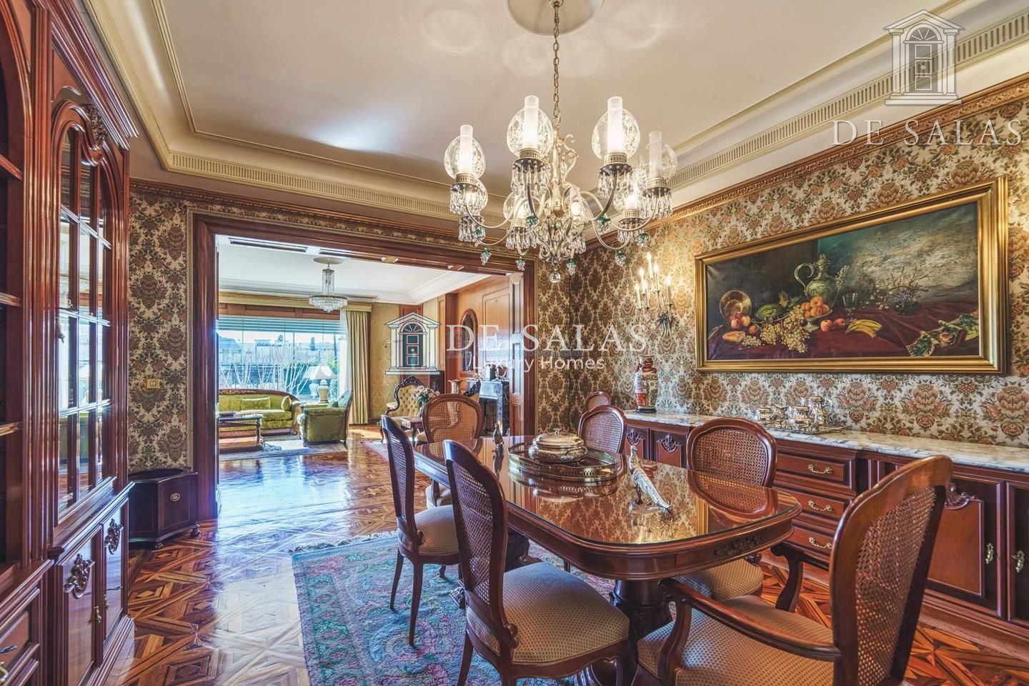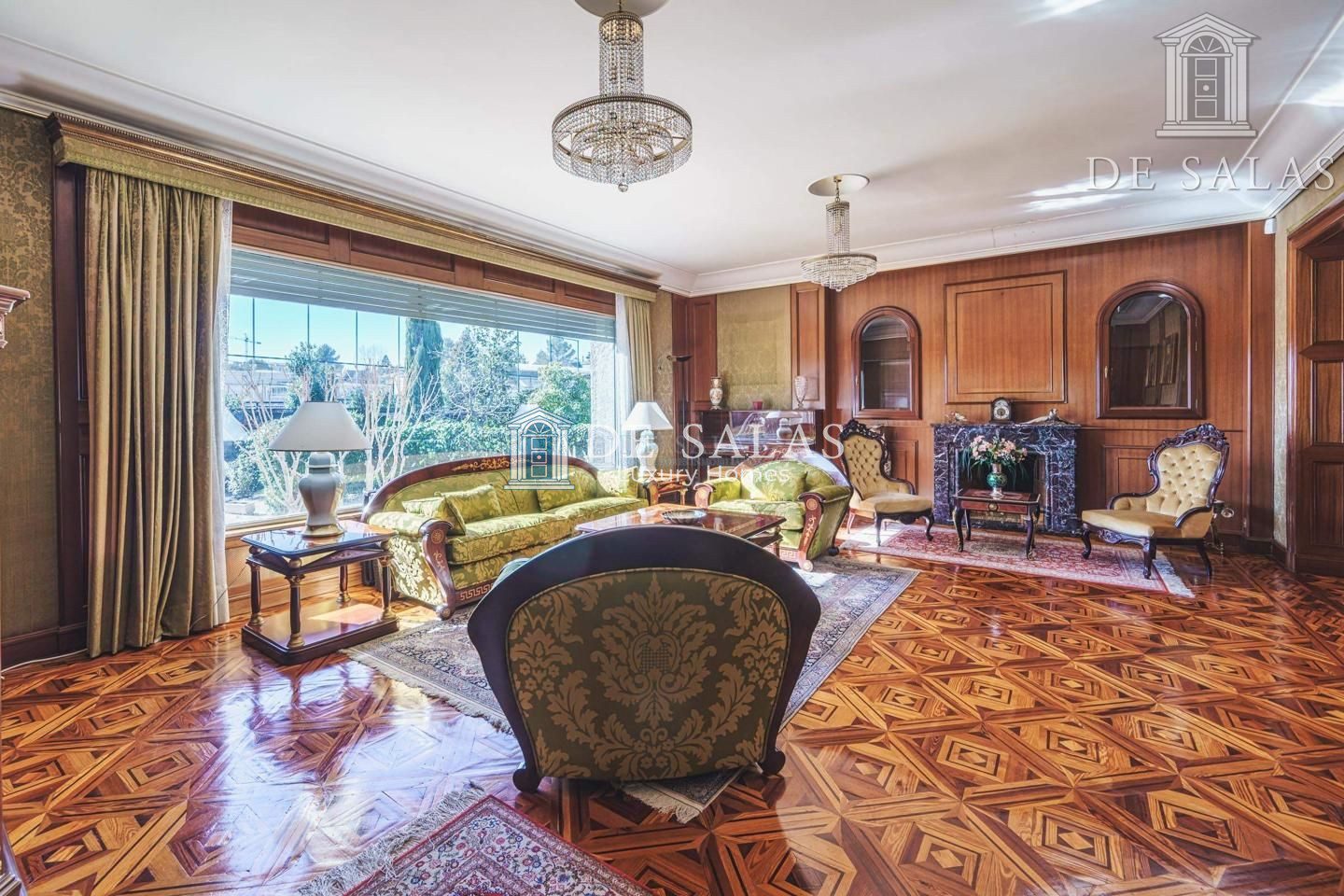 Un maravilloso despacho es lo primero que vemos al entrar a uno de los dos lados del recibidor. Al otro, un gran salón con chimenea que conduce a un comedor independiente con acceso directo a la cocina.