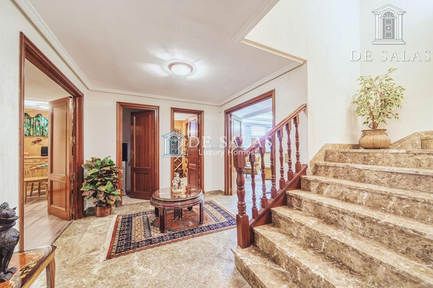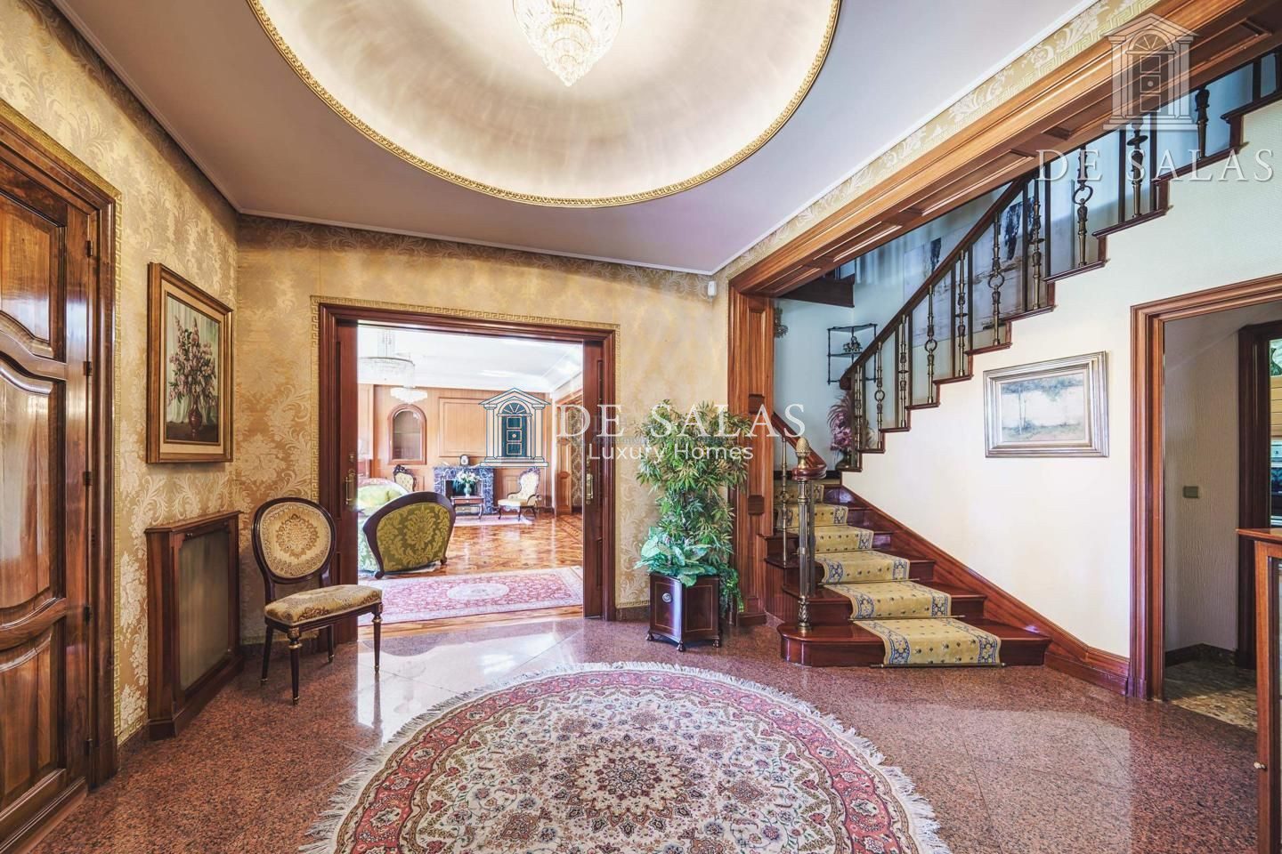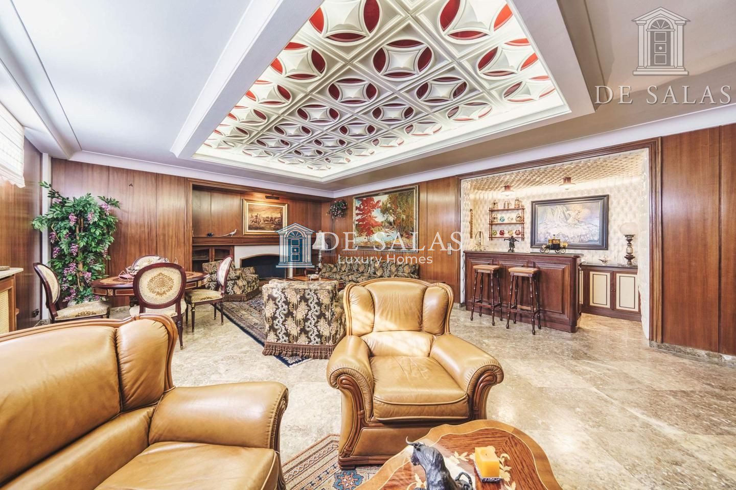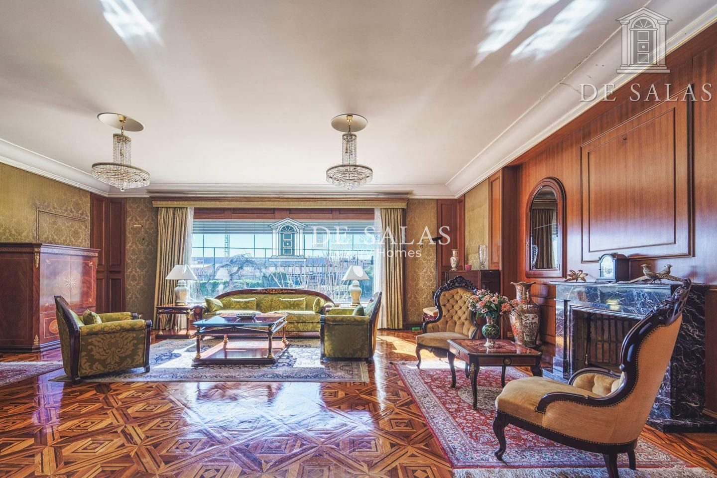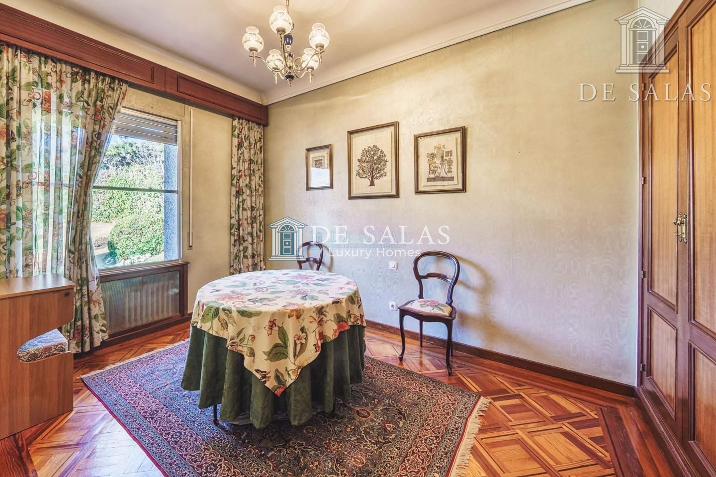 Un maravilloso despacho es lo primero que vemos al entrar a uno de los dos lados del recibidor. Al otro, un gran salón con chimenea que conduce a un comedor independiente con acceso directo a la cocina.