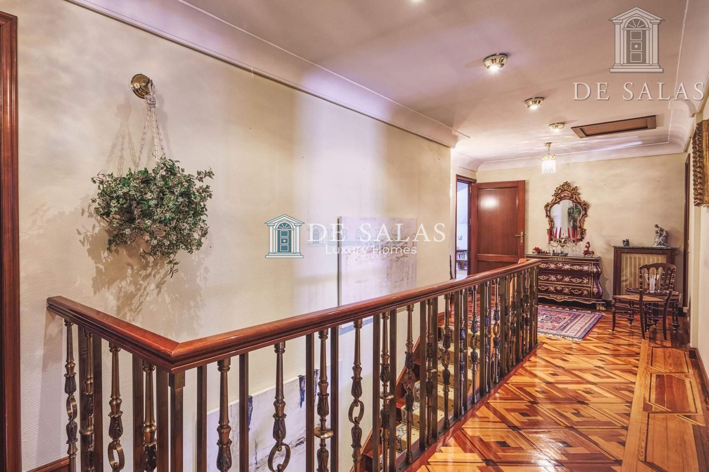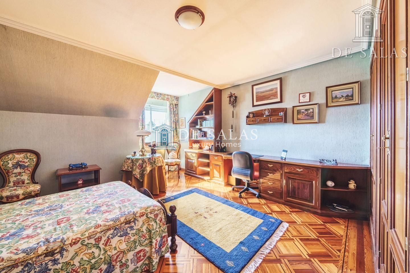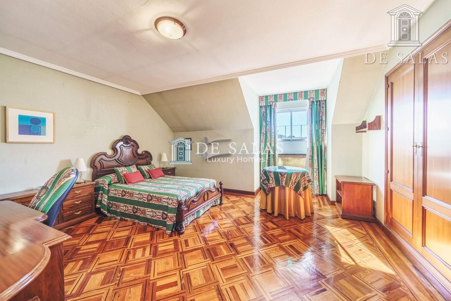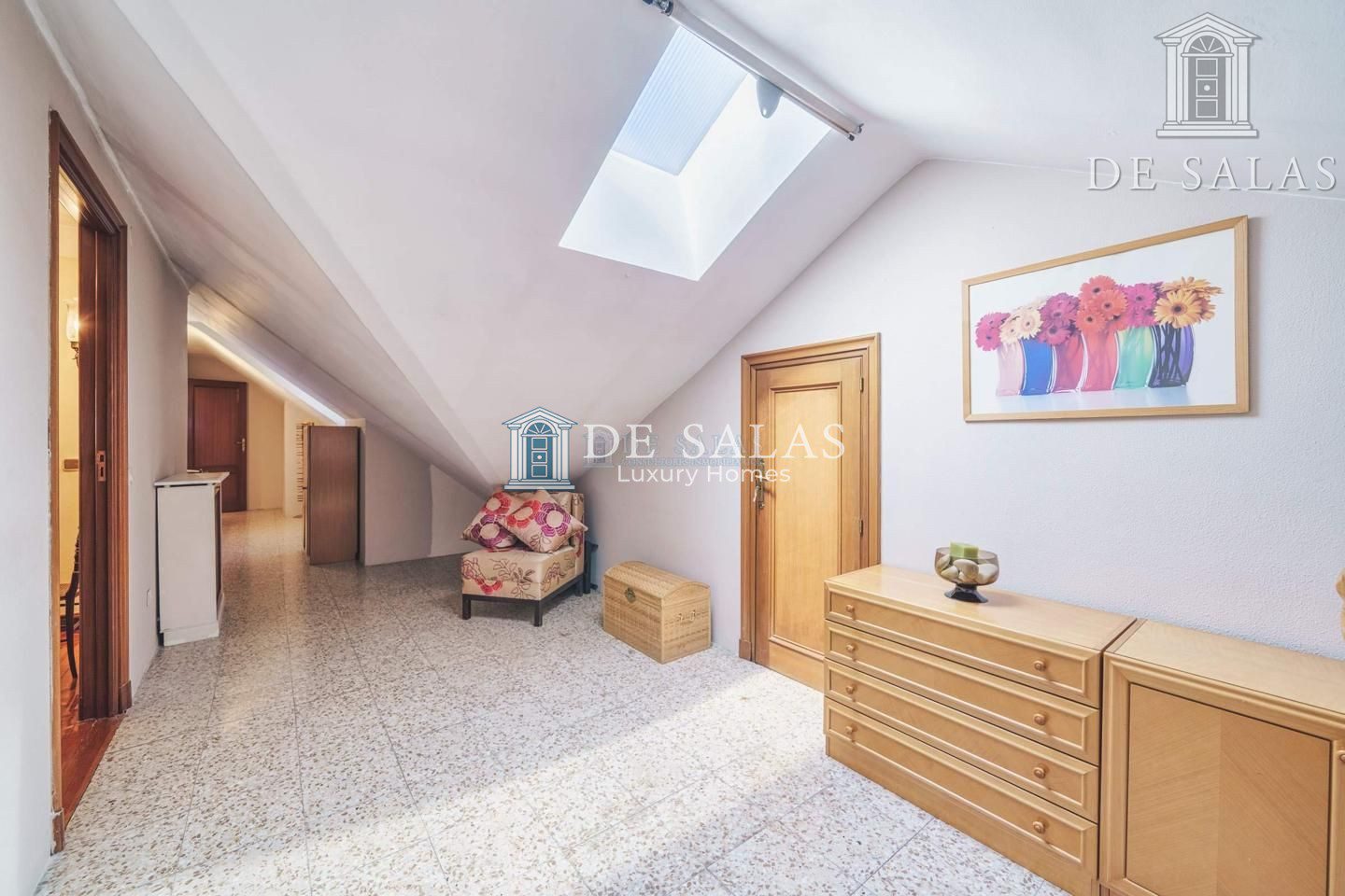 PLANTA PRIMERA: Accedemos por una impresionante escalera de madera hacia la planta superior, con un cuarto de juegos. El dormitorio 4 tiene el baño en suite, mientras que los dormitorios 5 y 6 comparten cuarto de baño.