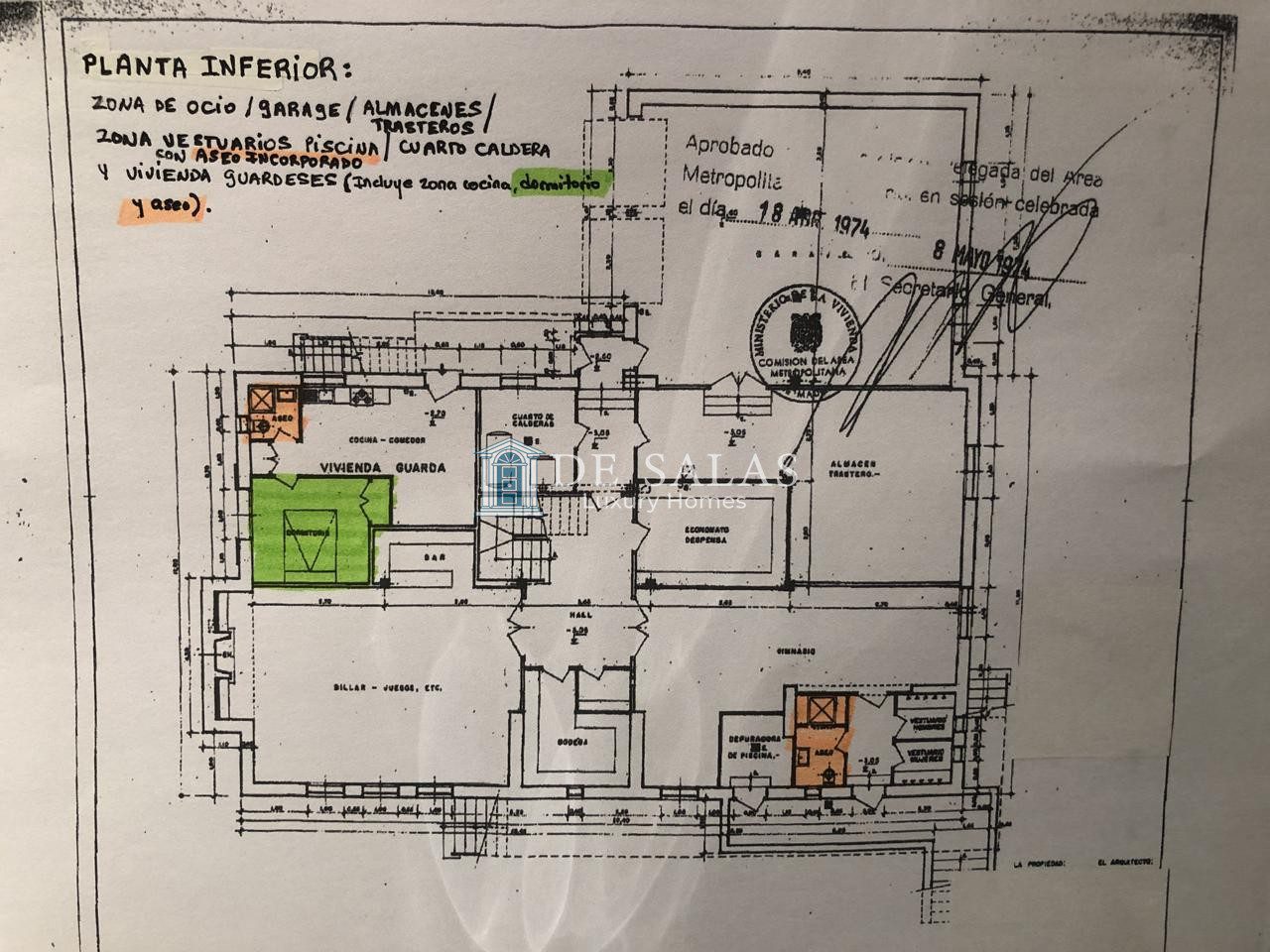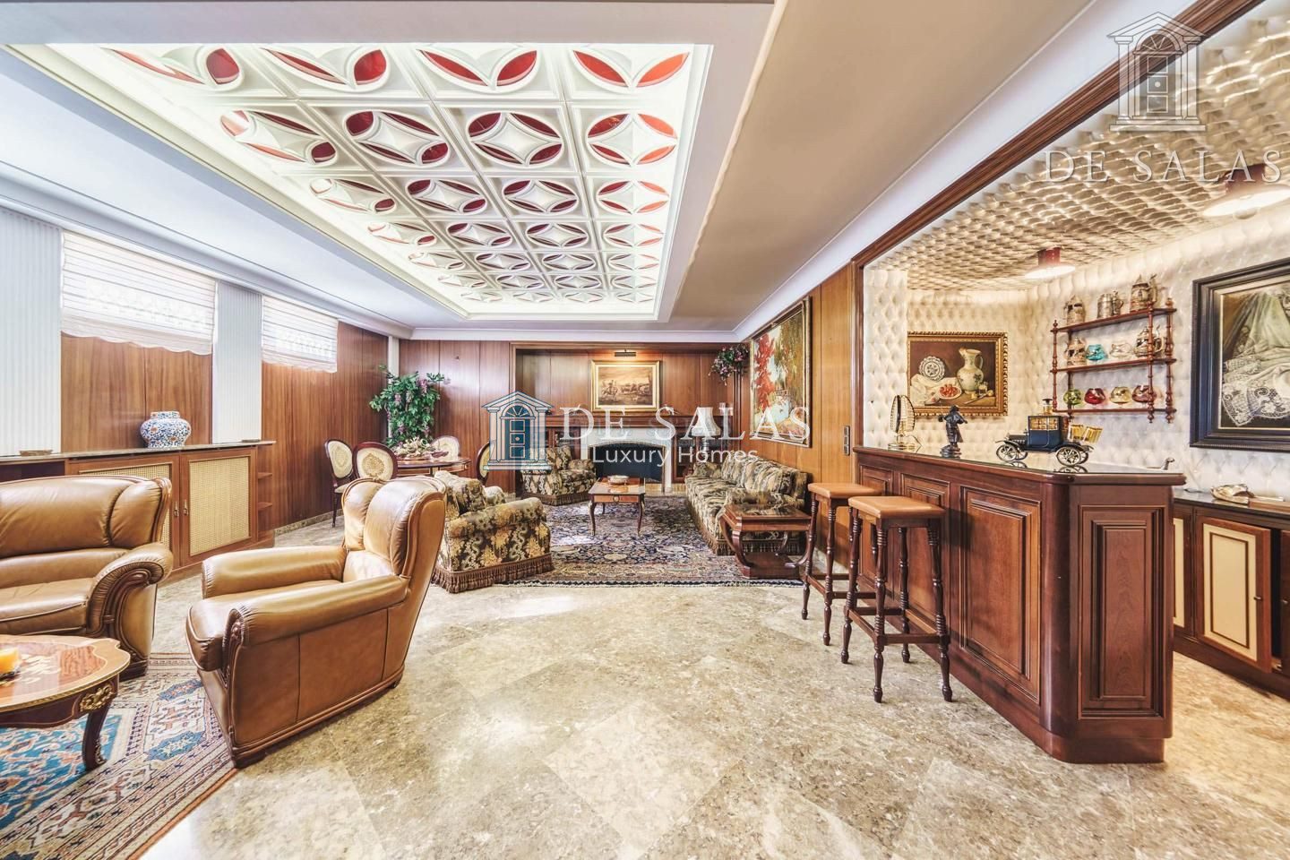 PLANTA SEMISÓTANO: De esta planta llama la atención su gran altura de techos. Aquí se encuentra una gran sala de estar con chimenea y un original mueble bar.