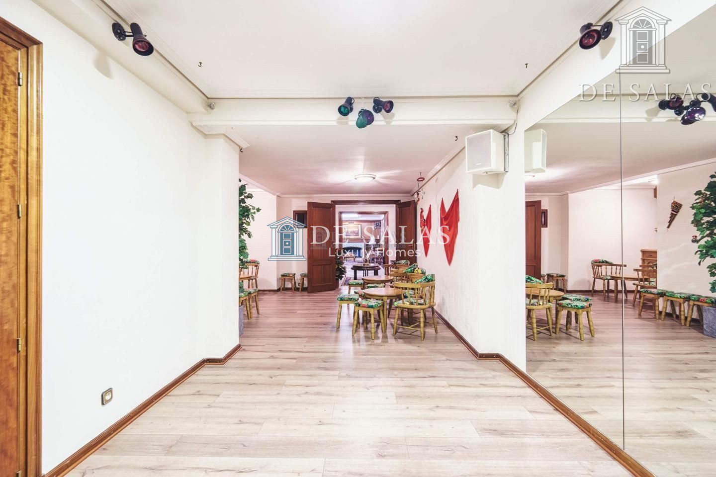 Junto a la bodega una curiosa sala que hizo en su día las alegrías de los más jóvenes de la casa, una mezcla entre discoteca, gimnasio y tablao flamenco con sus mesas y sillas incluidas para poder tomar algo mientras escuchamos música. Aquí también encontramos un cuarto que hace las funciones de una gran despensa, otro cuarto trastero y el cuarto de calderas, además del garaje con capacidad para 4 coches y la zona de vestuarios y cuarto de baño para dar servicio a la piscina.