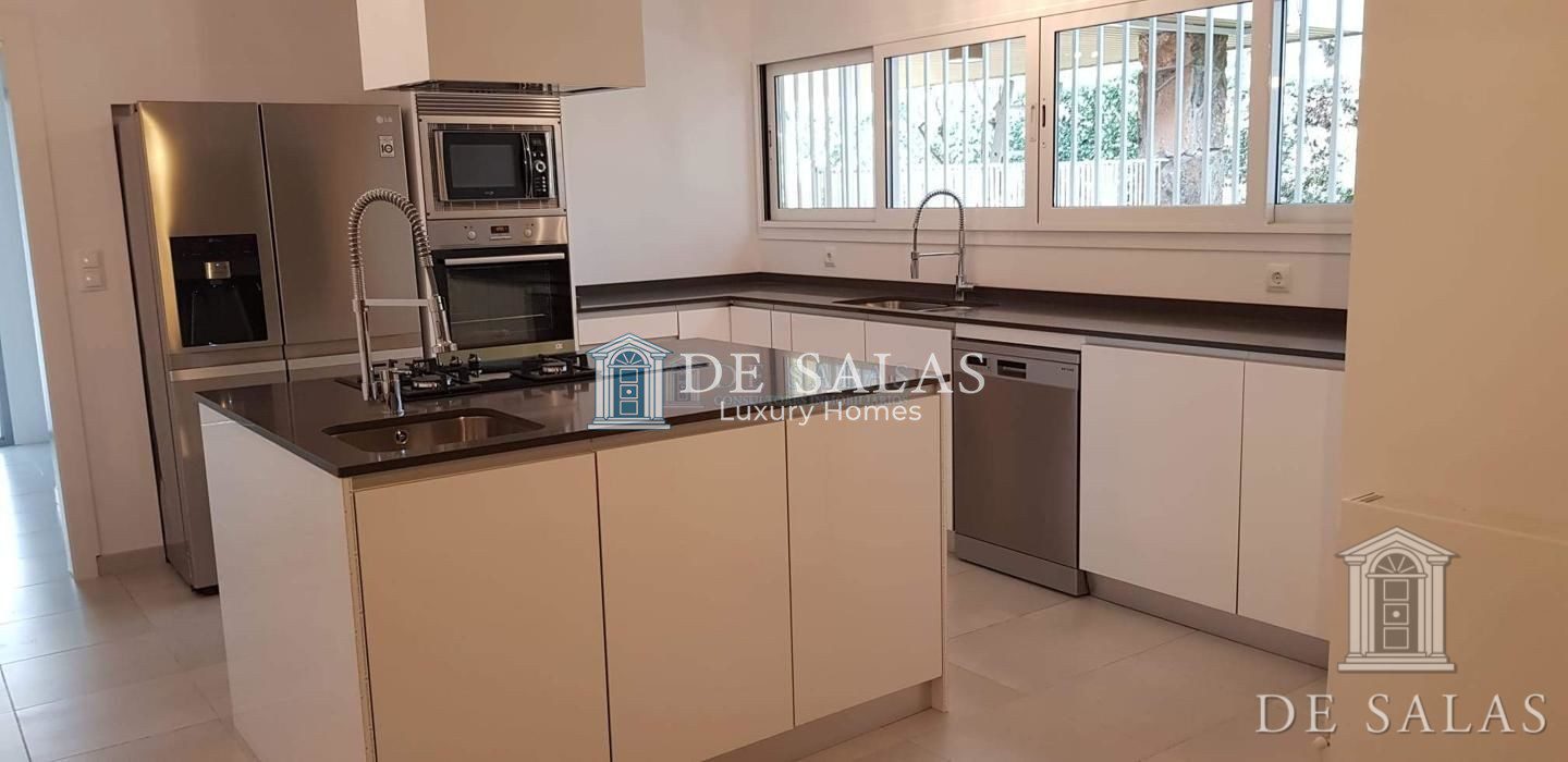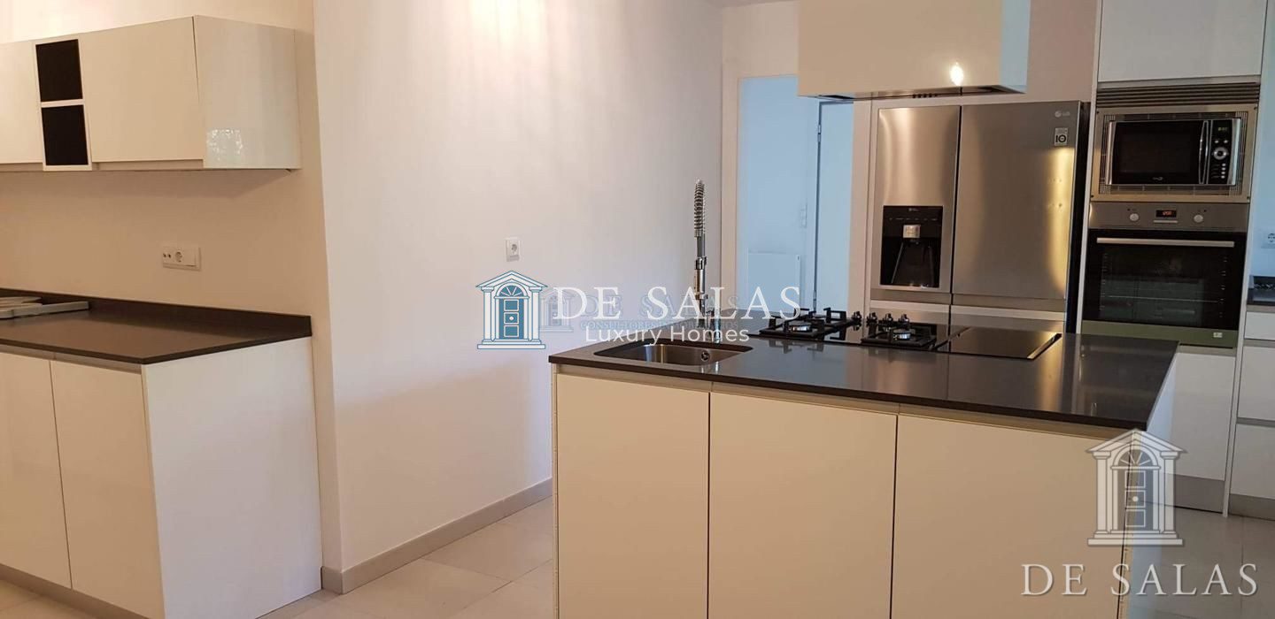 La cocina (28m2) es muy amplia, con una estupenda isla central que alberga los fogones combinando vitrocerámica y gas, además de un fregadero para dar servicio a esta zona. Alrededor de esta isla se asientan el resto de armarios y zona de trabajo, así como el fregadero principal. Una gran ventana de pared a pared otorga gran luminosidad a la estancia.