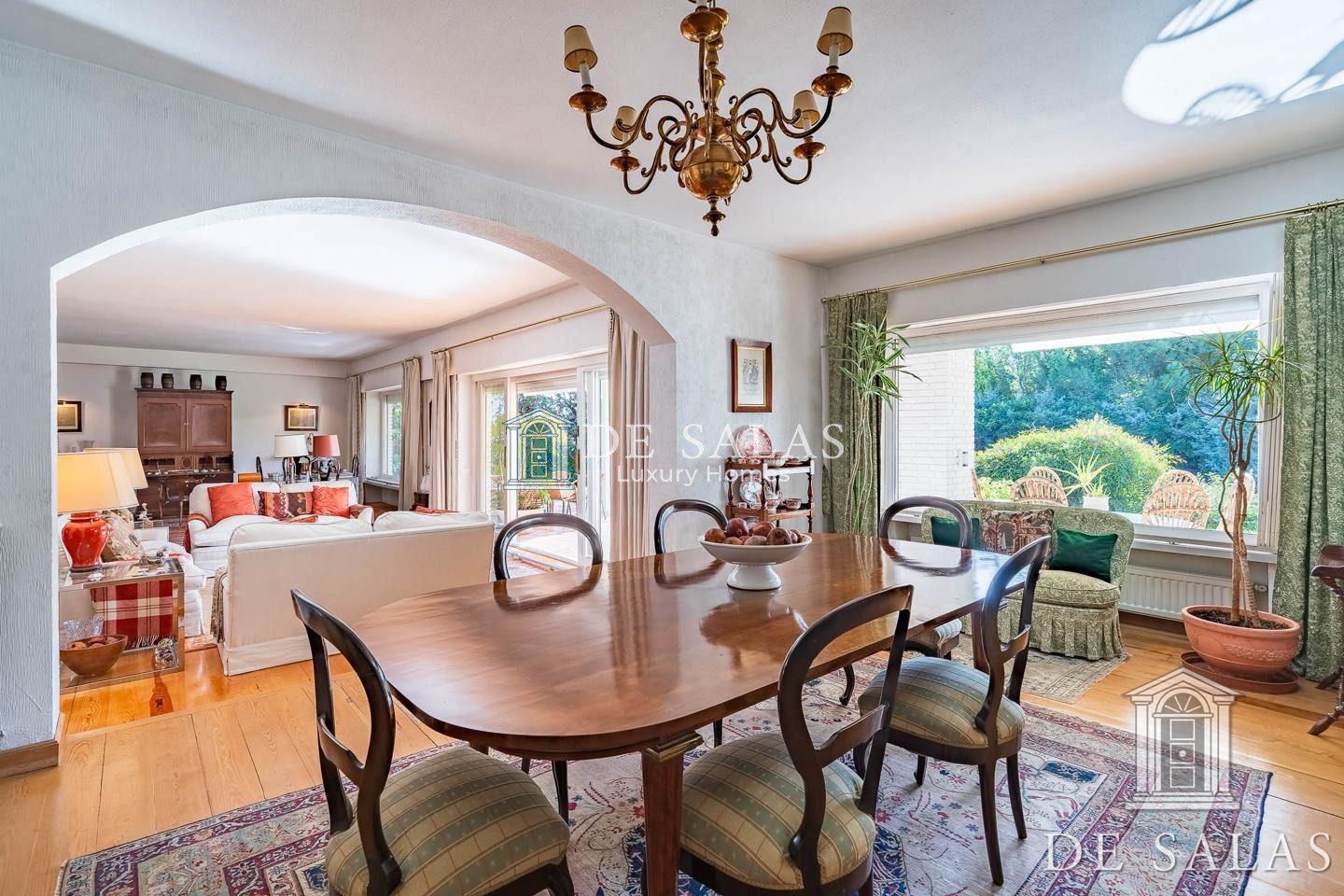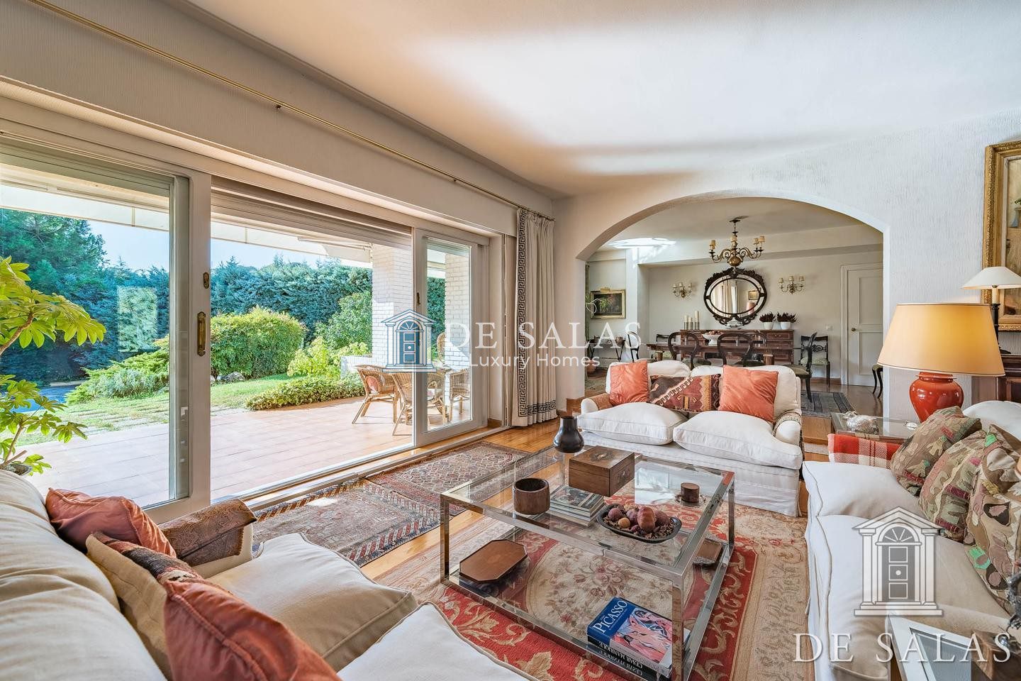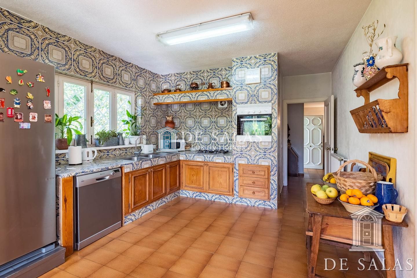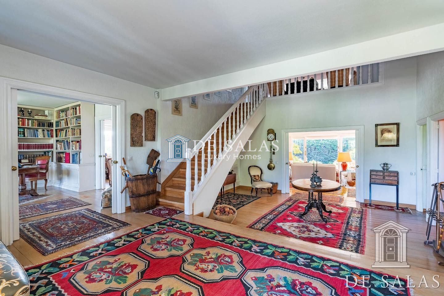 En la planta baja, accedemos a un gran hall de entrada completamente abierto al salón, que se distribuye en 3 ambientes diferenciados entre zonas de descanso y zona comedor, con chimenea, grandes ventanales y acceso directo al porche y al jardín. En la misma planta se dispone de un bonito despacho con biblioteca, aseo de cortesía, cocina y zona de servicio.