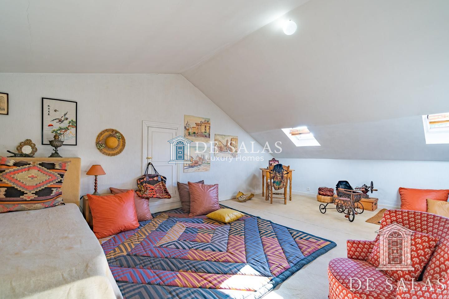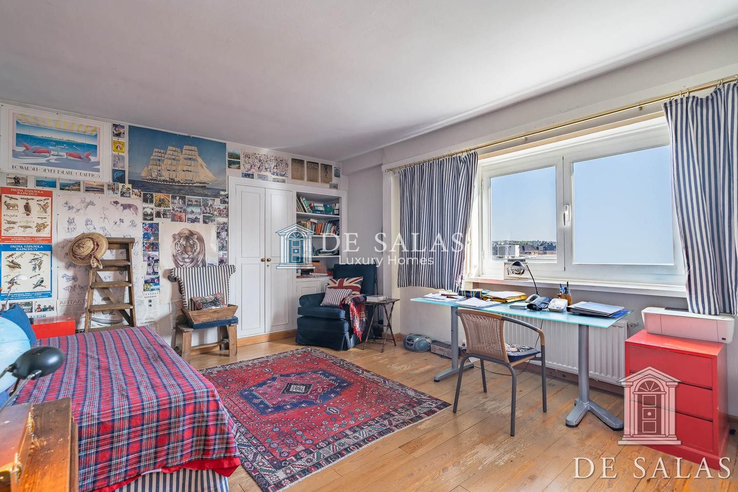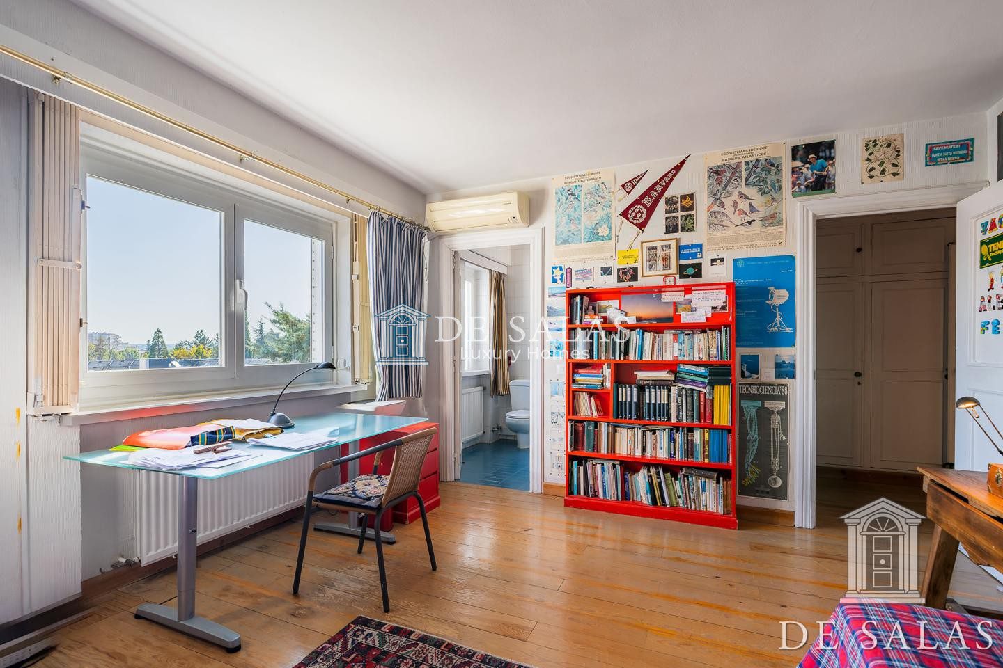 El dormitorio principal destaca por sus grandes dimensiones, con 2 baños completos independientes, grandes armarios, con una cálida chimenea y con acceso directo a una zona abuhardillada y con una magnifica terraza, con vistas al monte de pardo y a los campos de golf de la Real Federación Española.