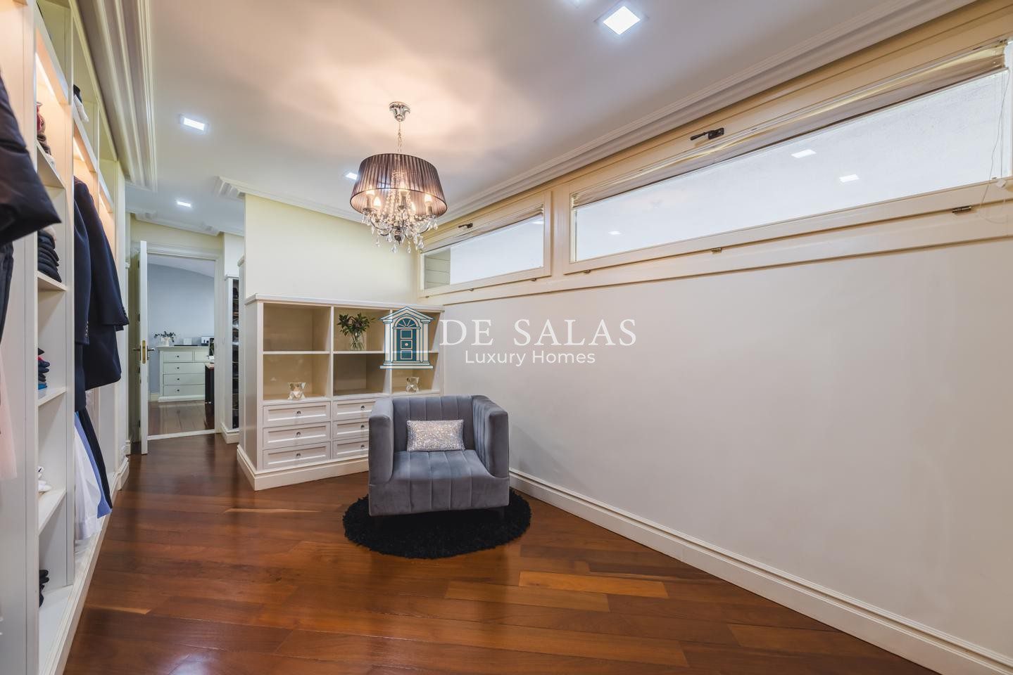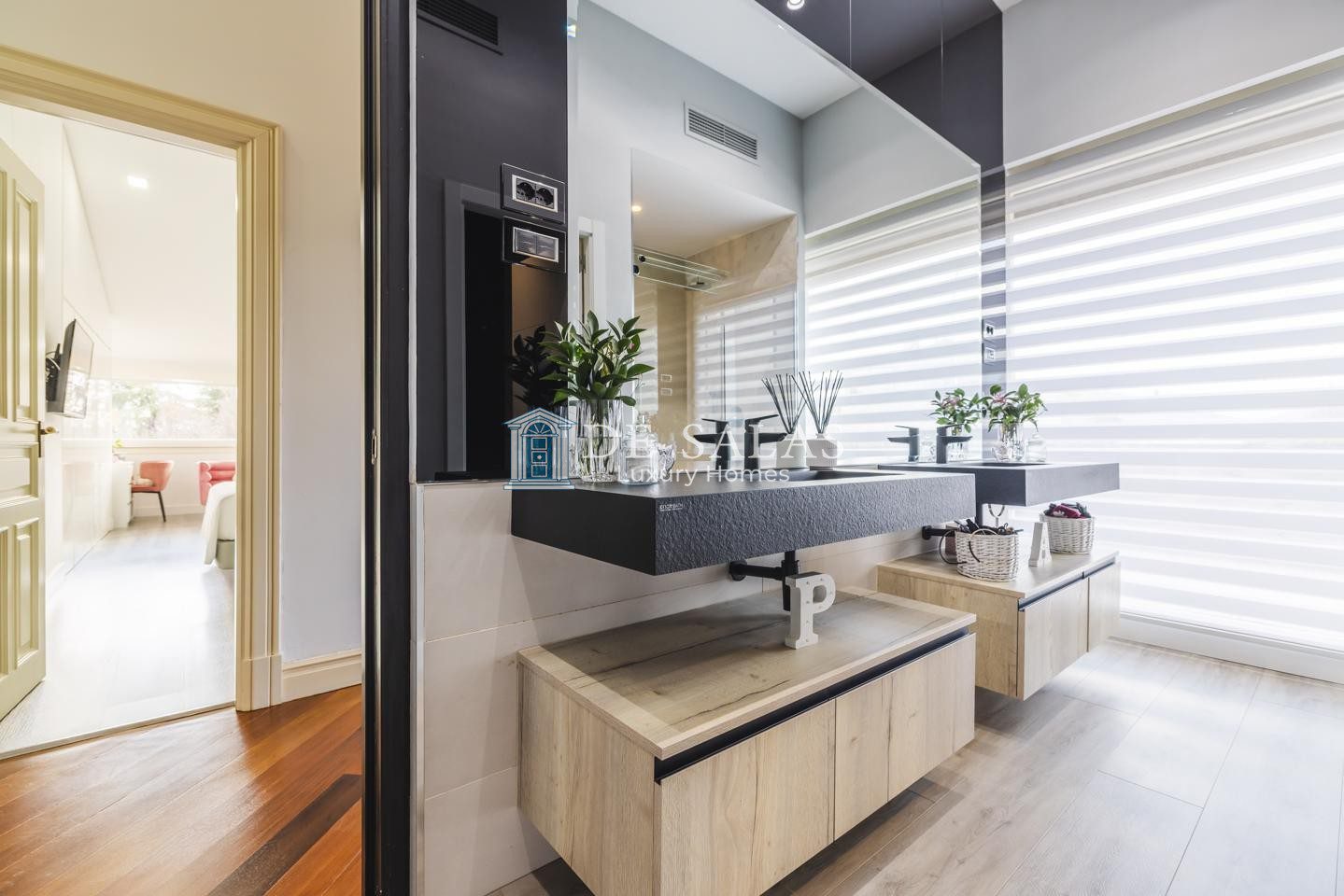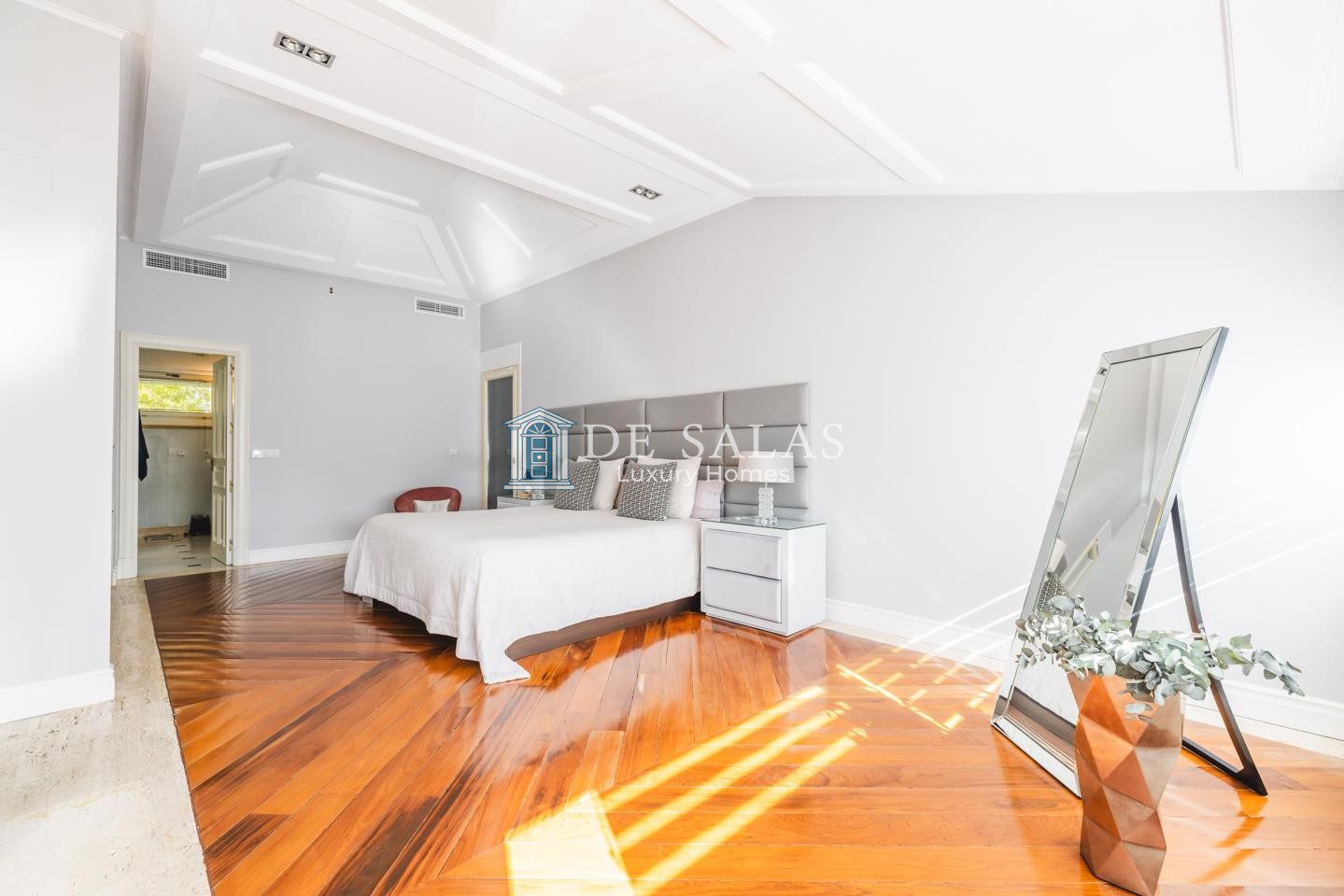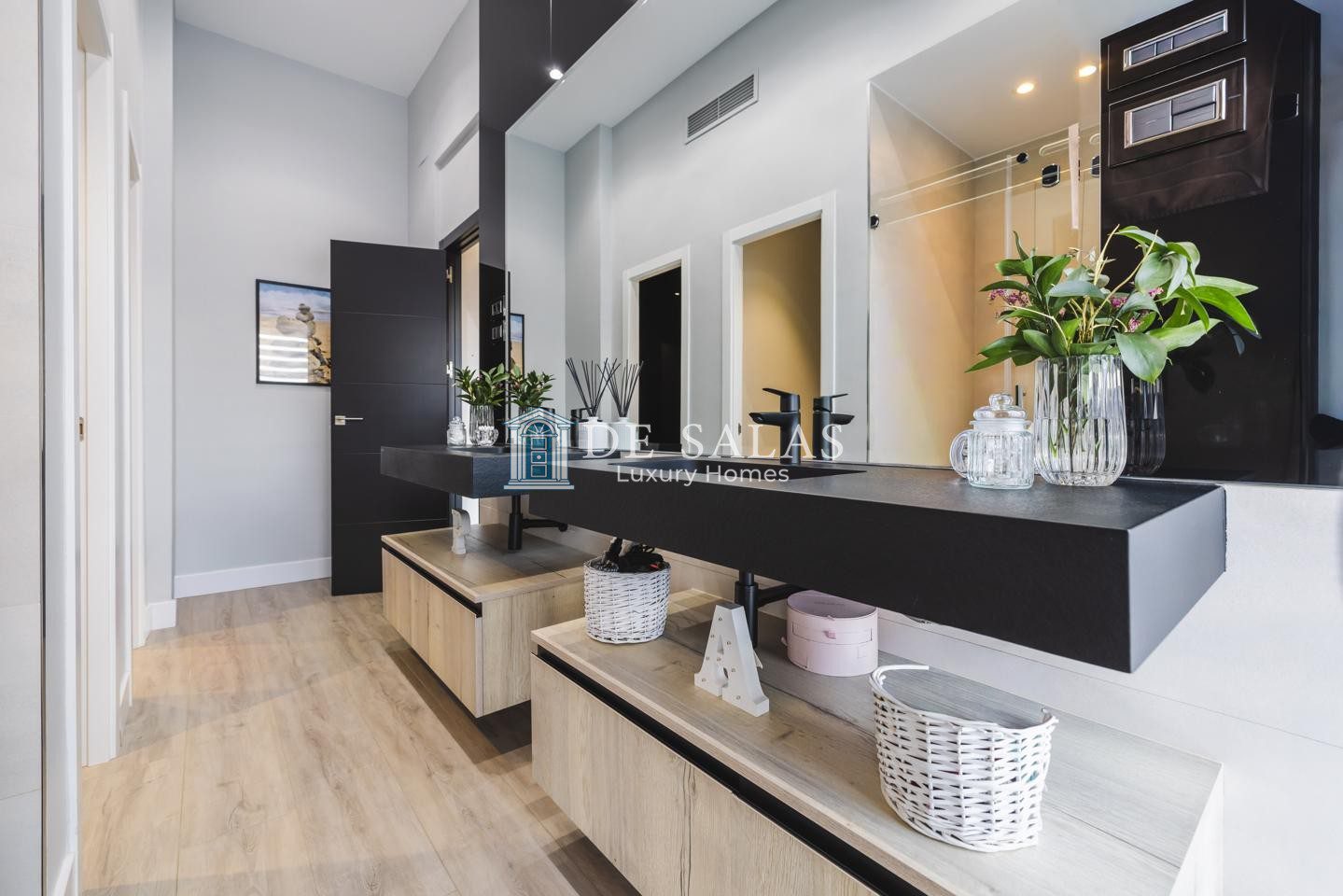 En la primera planta se encuentran tres dormitorios de ensueño con baño en suite, con una suite principal con chimenea de grandes dimensiones que deslumbra por su vestidor de gran formato y una capacidad de almacenaje perfecta, zona de estar y despacho.