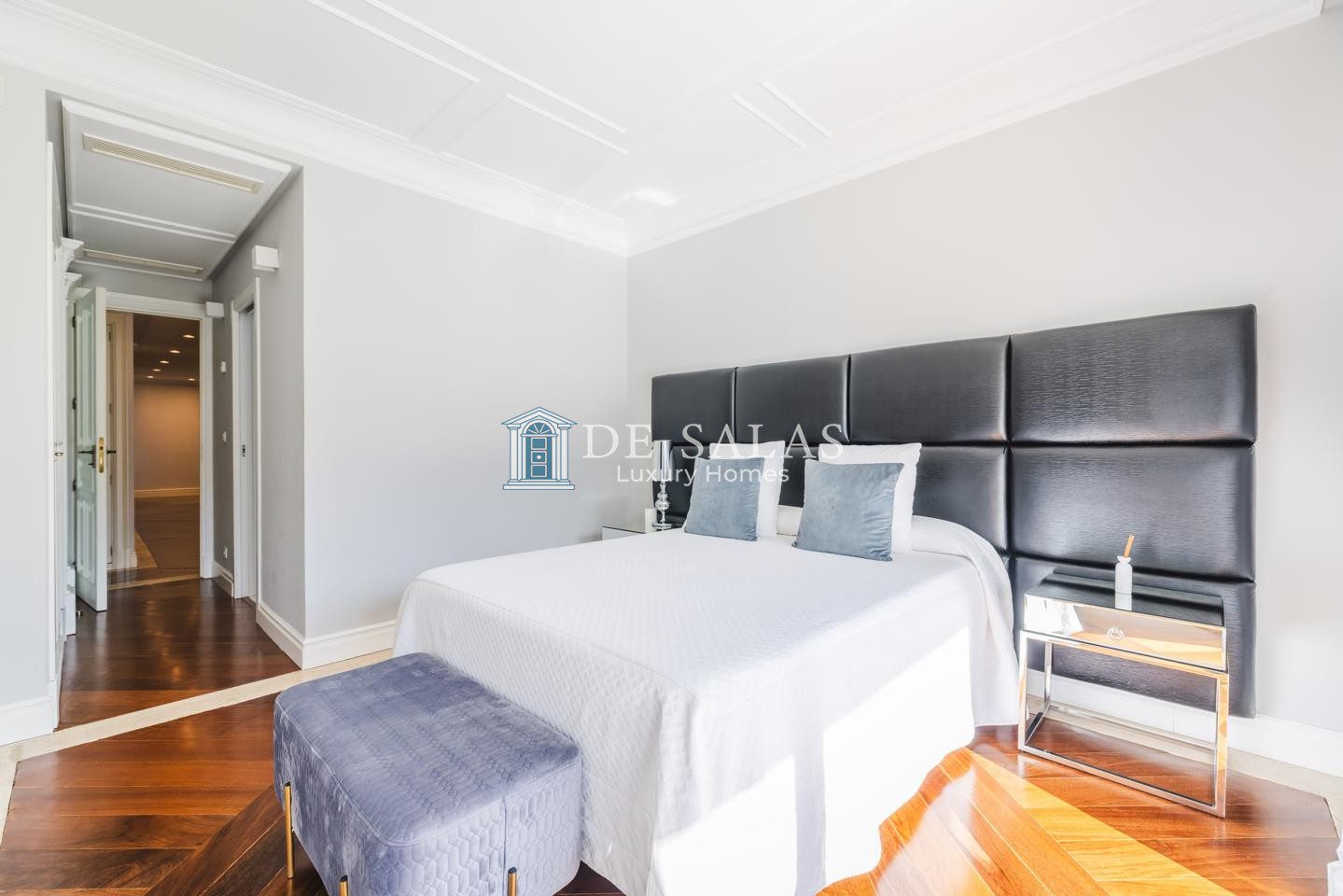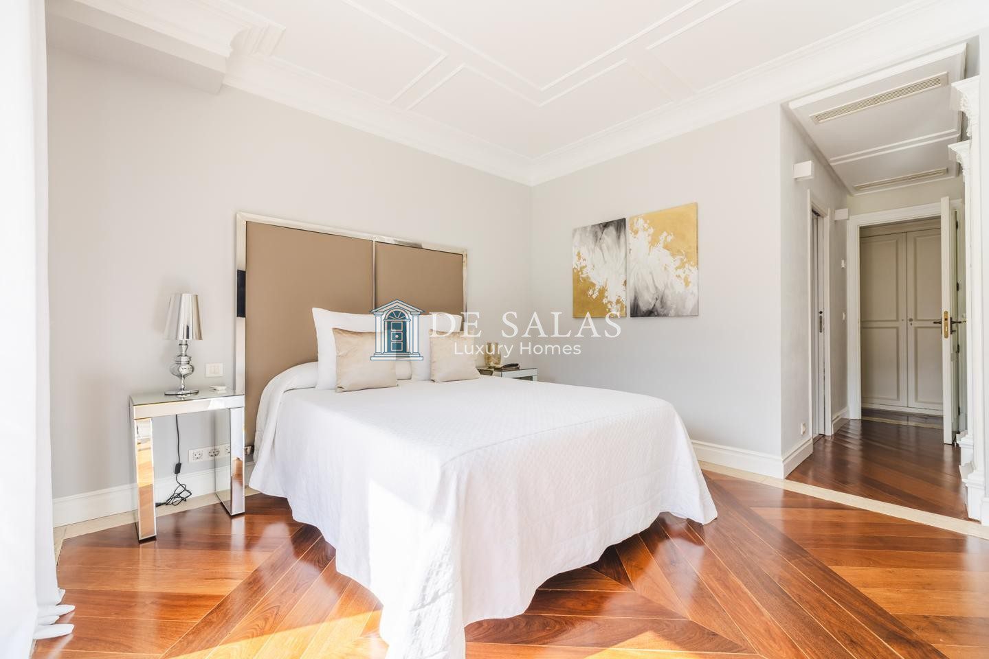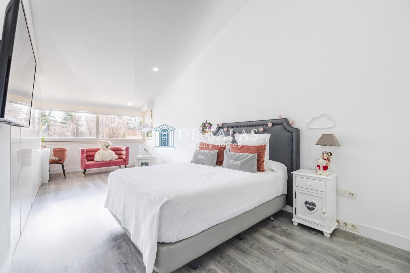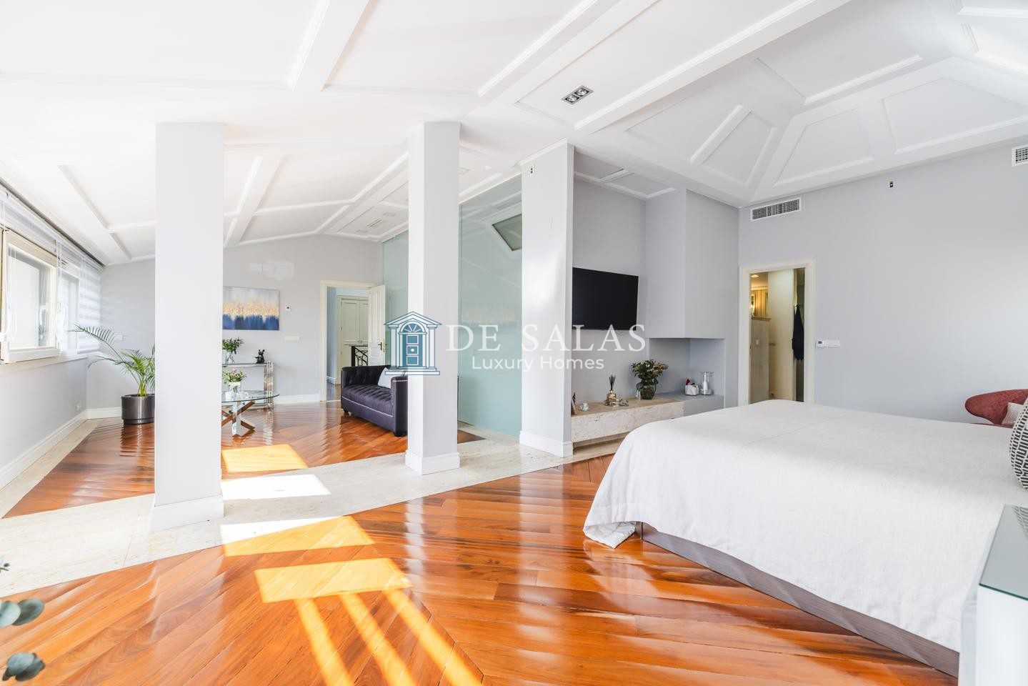En la primera planta se encuentran tres dormitorios de ensueño con baño en suite, con una suite principal con chimenea de grandes dimensiones que deslumbra por su vestidor de gran formato y una capacidad de almacenaje perfecta, zona de estar y despacho.