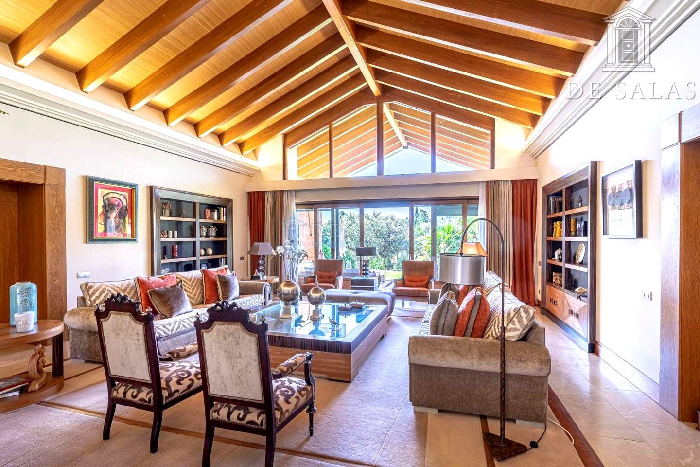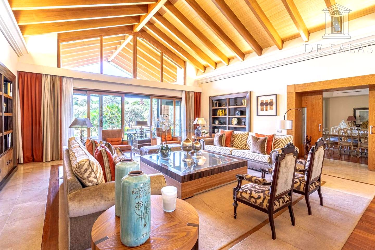 Con 23 m2 cuadrados el hall acoge al visitante envolviéndole en un halo de calidez y exclusividad. Dos puertas correderas conectan al recibidor con el corazón de la casa, el salón, 55 m2 de nobleza, elegancia y claridad es lo que encontramos en esta fabulosa estancia en cuya decoración se adivina el talento de Paco Terán. La imponente altura de sus techos con vigas de madera vista potencia su espectacularidad gracias a una estudiada iluminación. Destacan también su chimenea y los altos ventanales que ofrecen unas sensacionales vistas y permiten un delicioso baño de luz.