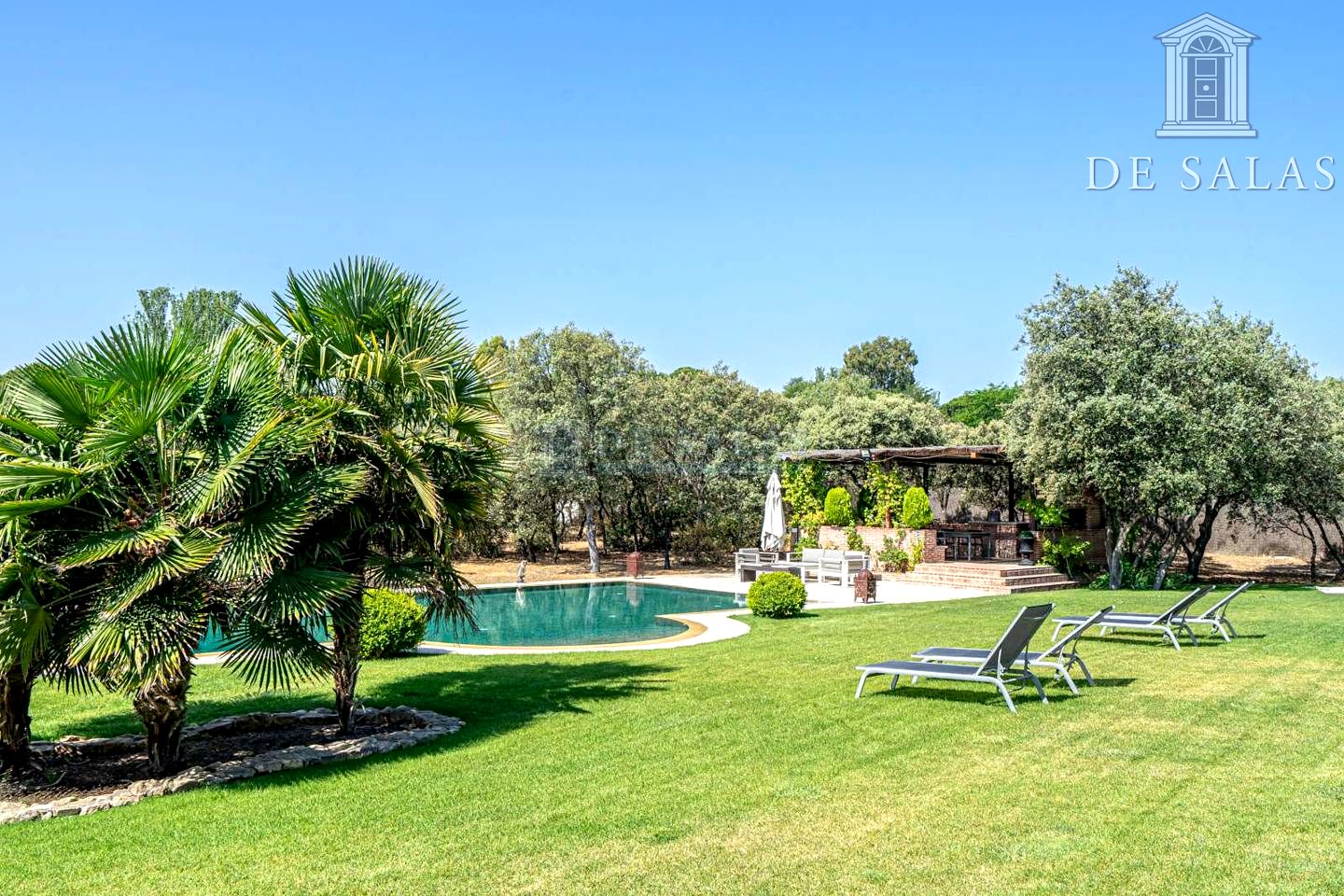 cada uno de los días de buen tiempo. Con vistas sobre la piscina tiene la amplitud suficiente para crear distintos ambientes como un saloncito y un comedor de verano. Frente a él la impresionante y elegantísima piscina estilo Múnich se presenta como un auténtico regalo. Está rodeada de una gran extensión de césped y cuenta con zona de solárium. Junto a ella un estupendo rincón con barbacoa es ideal para disfrutar de una animada comida al resguardo del sol.