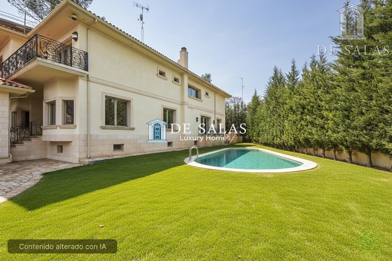 Impresionante chalet independiente de 900 m2 construidos en parcela de 1.100 m2, con piscina y amplio garaje. Espaciosa y confortable, dispone de 5 dormitorios en la zona noble, un dormitorio de invitados y cuarto de servicio.