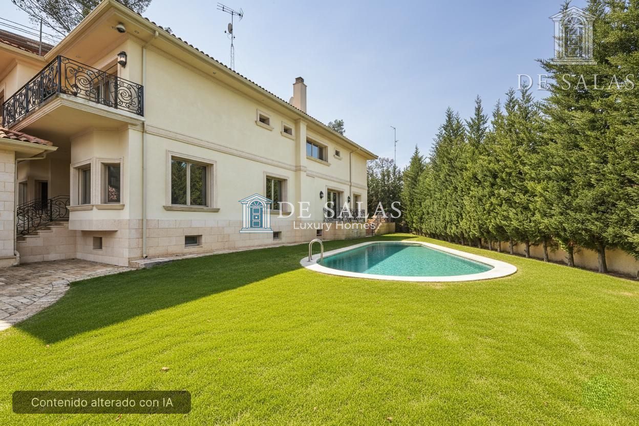 Impresionante chalet independiente de 900 m2 construidos en parcela de 1.100 m2, con piscina y amplio garaje. Espaciosa y confortable, dispone de 5 dormitorios en la zona noble, un dormitorio de invitados y cuarto de servicio.