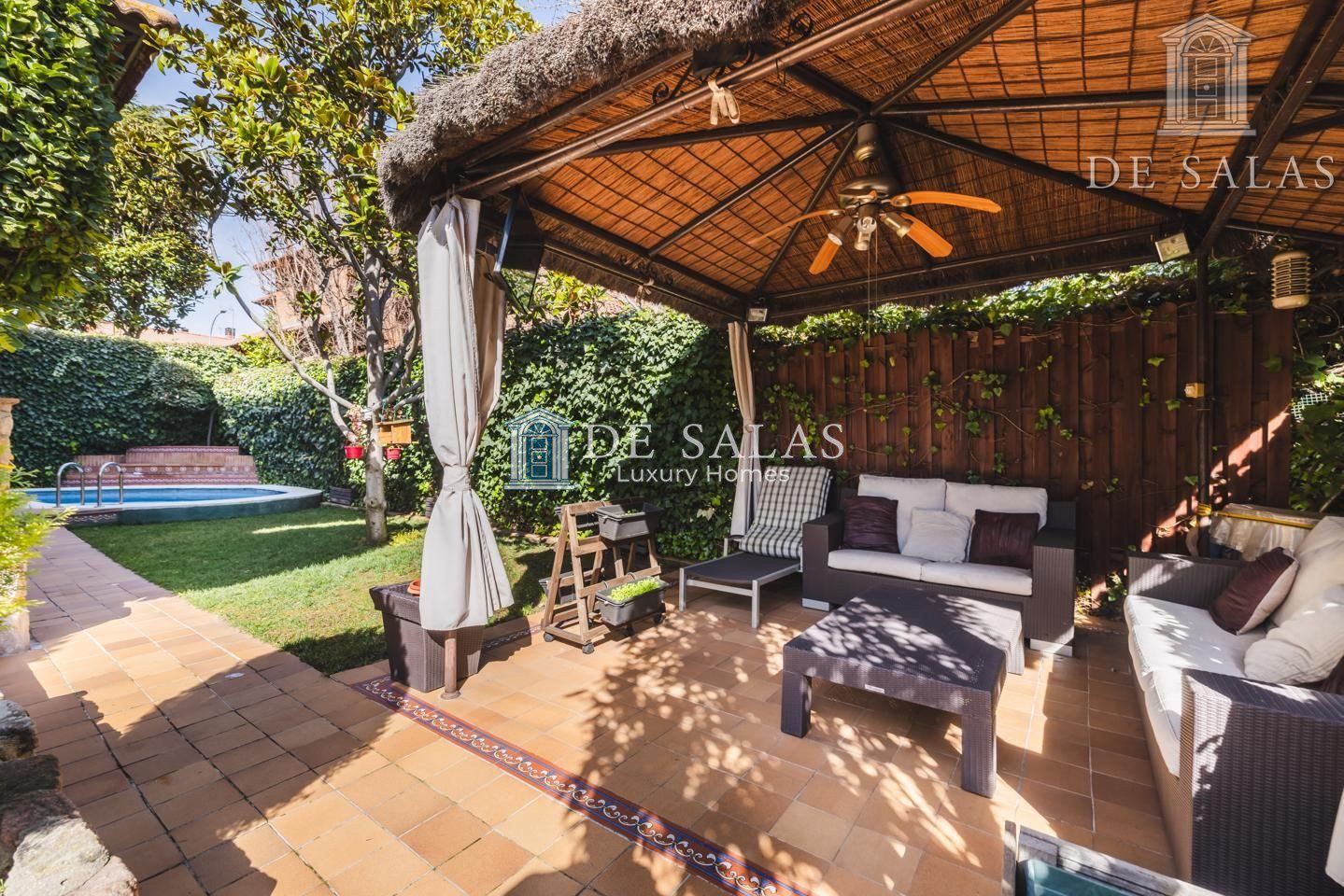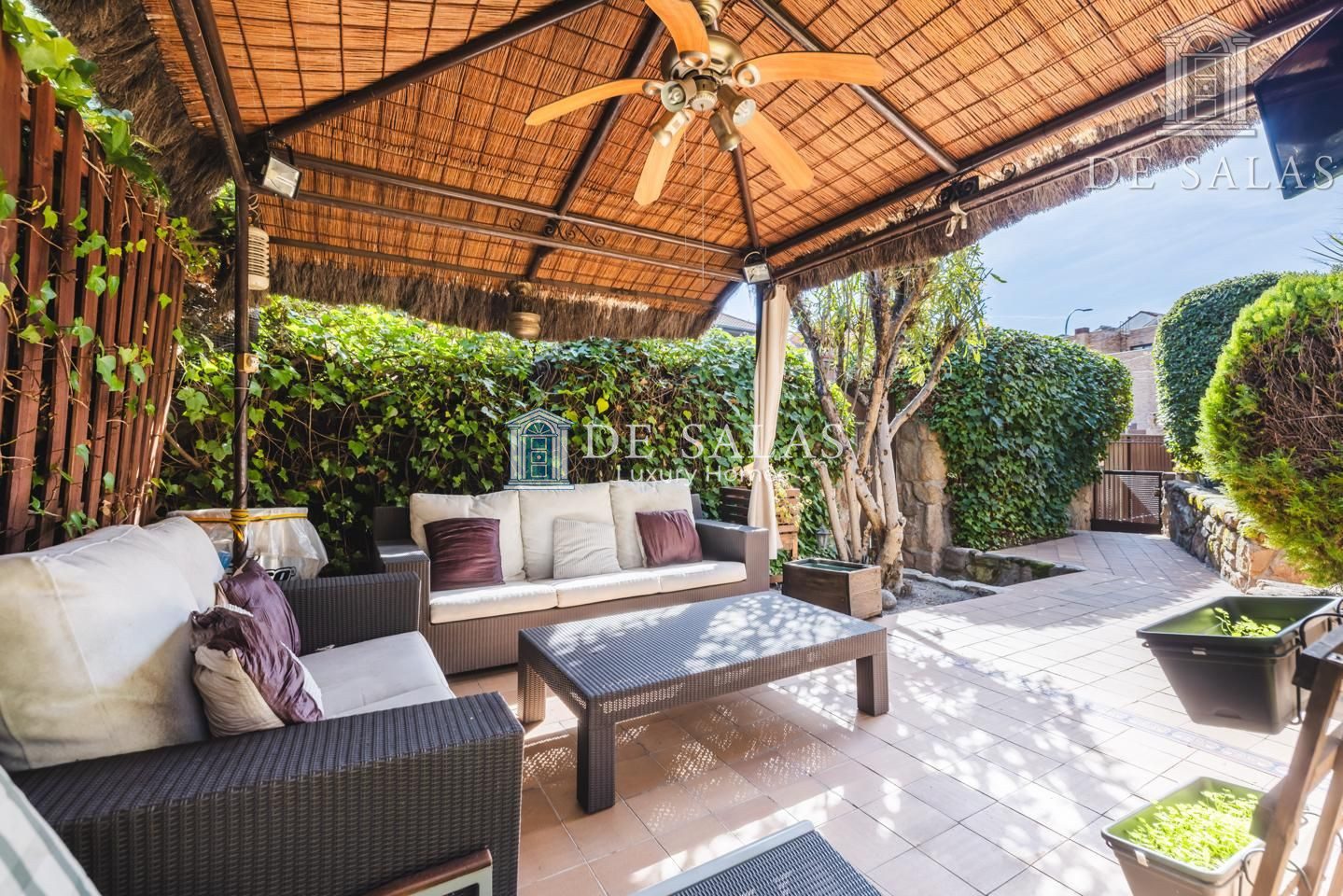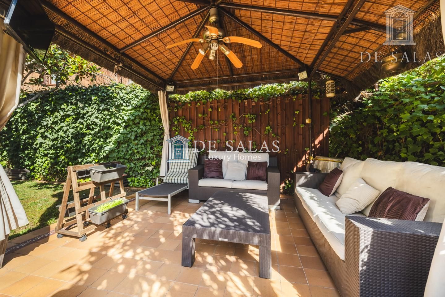 La estupenda arboleda, con riego automático domotizado, se mezcla con un acertado espacio chillout bajo una pérgola, destinado a zona de estar totalmente preparada con ventilador y toma de televisión para poder disfrutar cómodamente con la familia o acompañados de amigos.