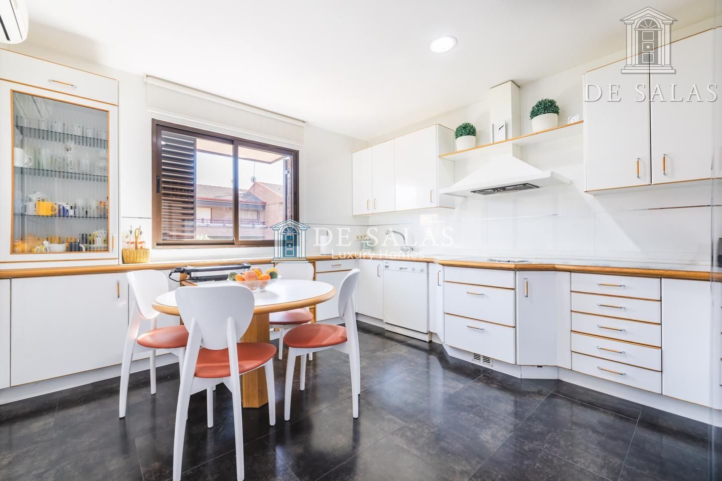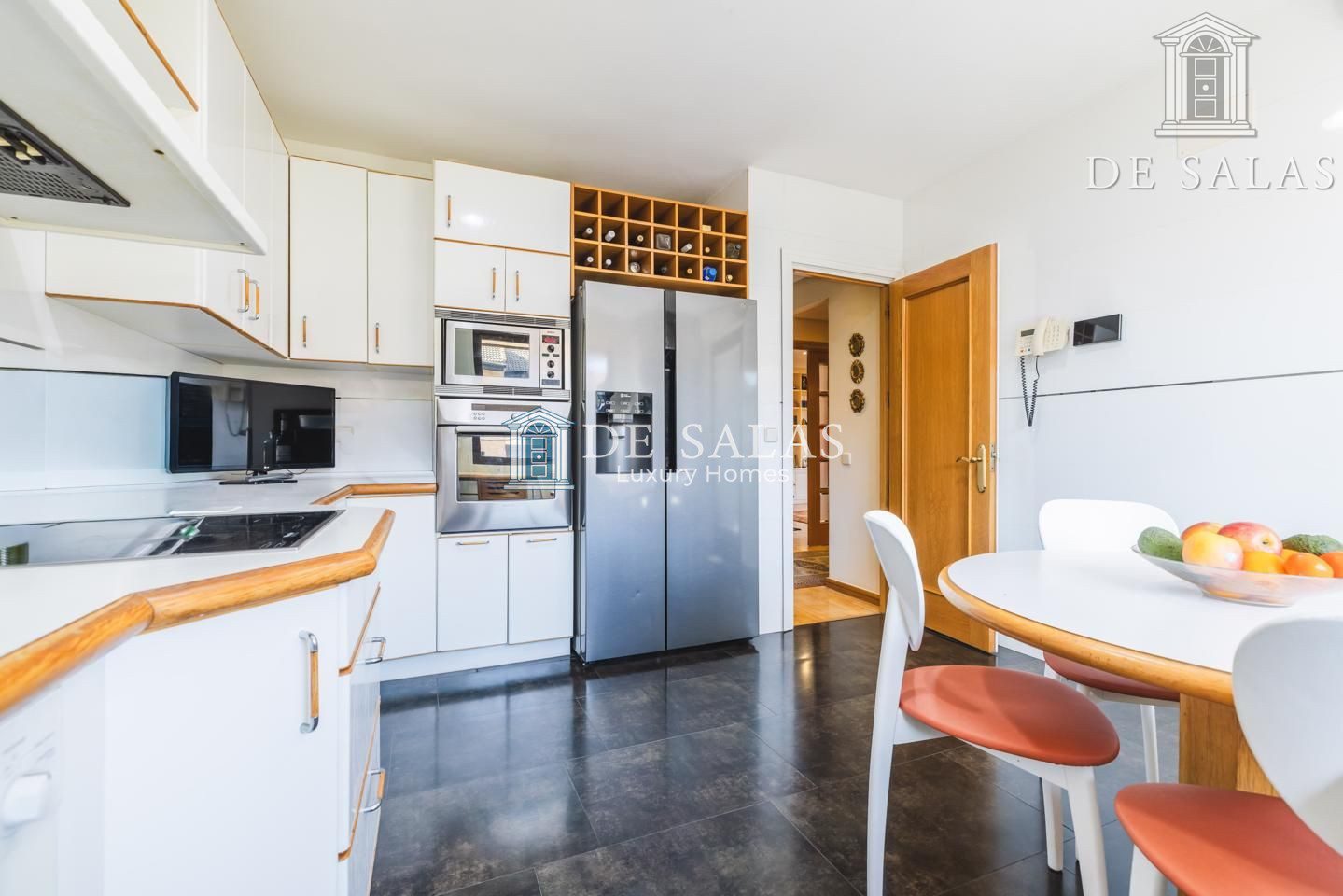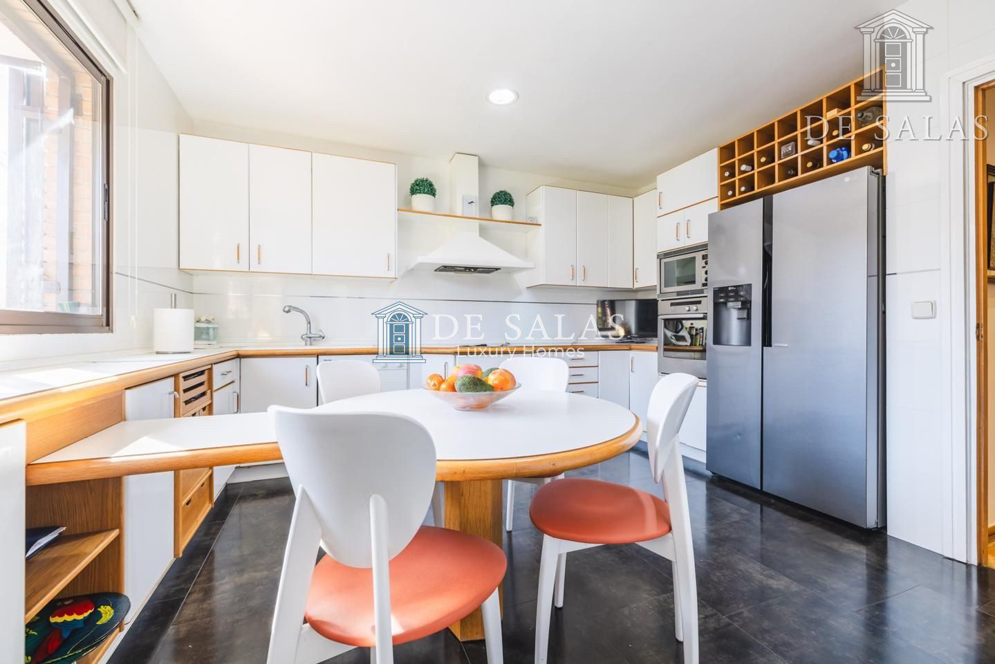 La cocina es amplia y luminosa, con espacio para poder poner una gran mesa para comer a diario. Numerosos armarios altos y bajos permiten gran almacenaje. La cocina comunica directamente con un práctico lavadero-tendedero. Esta planta dispone además de armario gabanero junto a la entrada y aseo para invitados con ventana exterior.