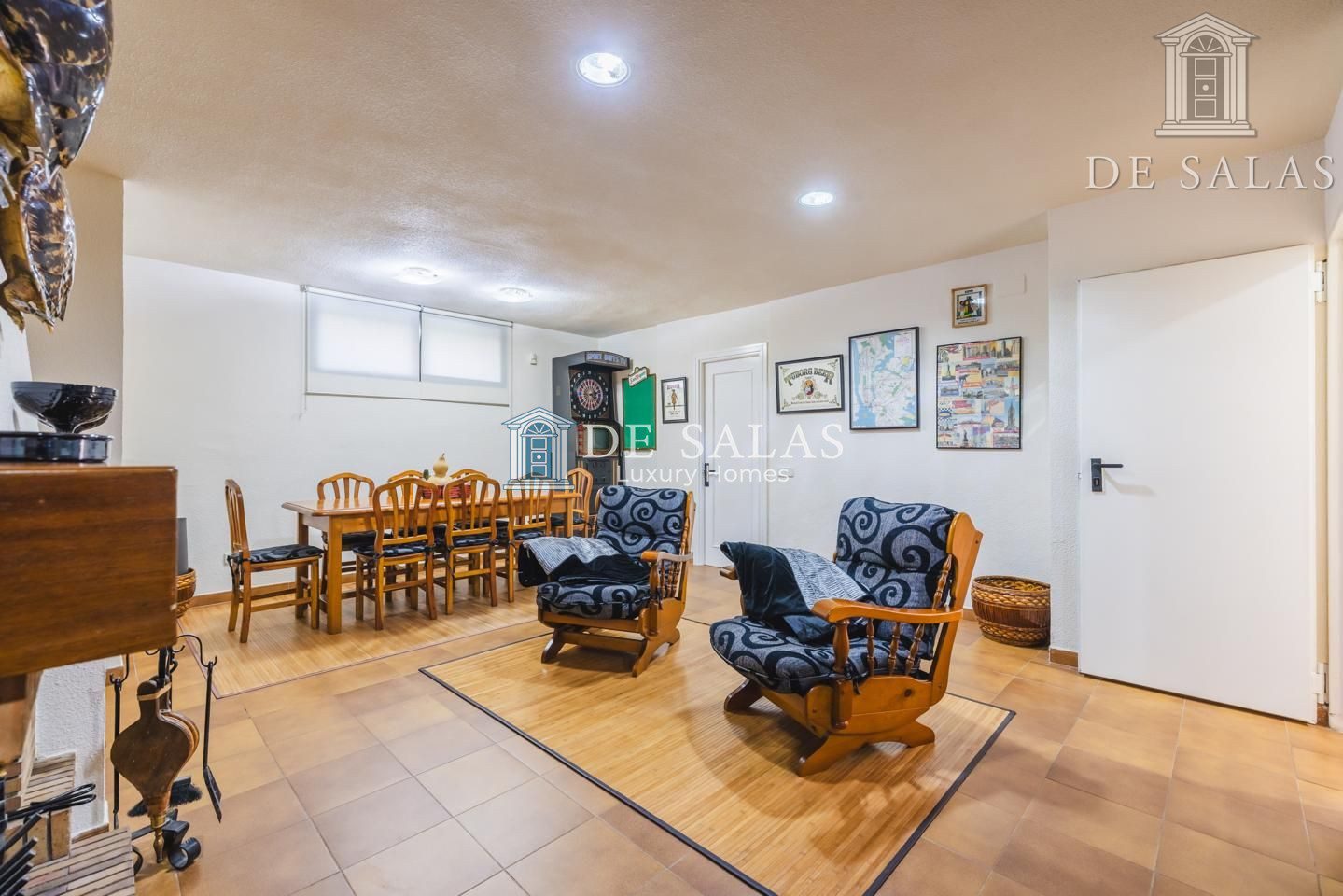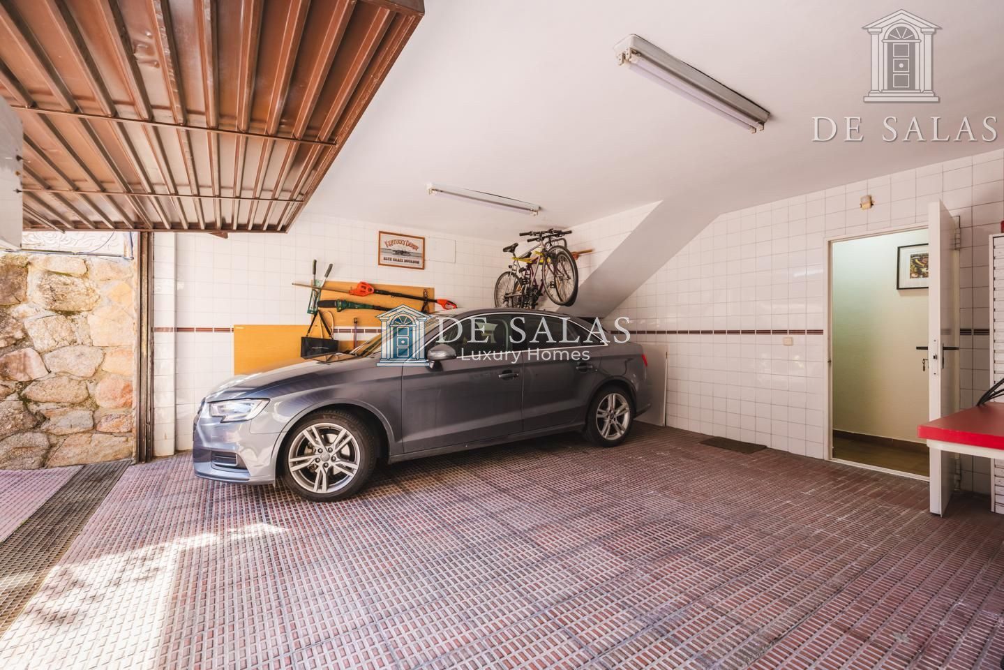 PLANTA SEMISÓTANO: Sorprende el espacioso salón con chimenea (60m2) que encontramos en esta parte del chalet. Aquí se ubica además otro dormitorio, una despensa-bodega y el garaje para 2 vehículos en paralelo, más otro en rampa. Junto al garaje encontramos un práctico aseo y un cuarto de herramientas-taller.
