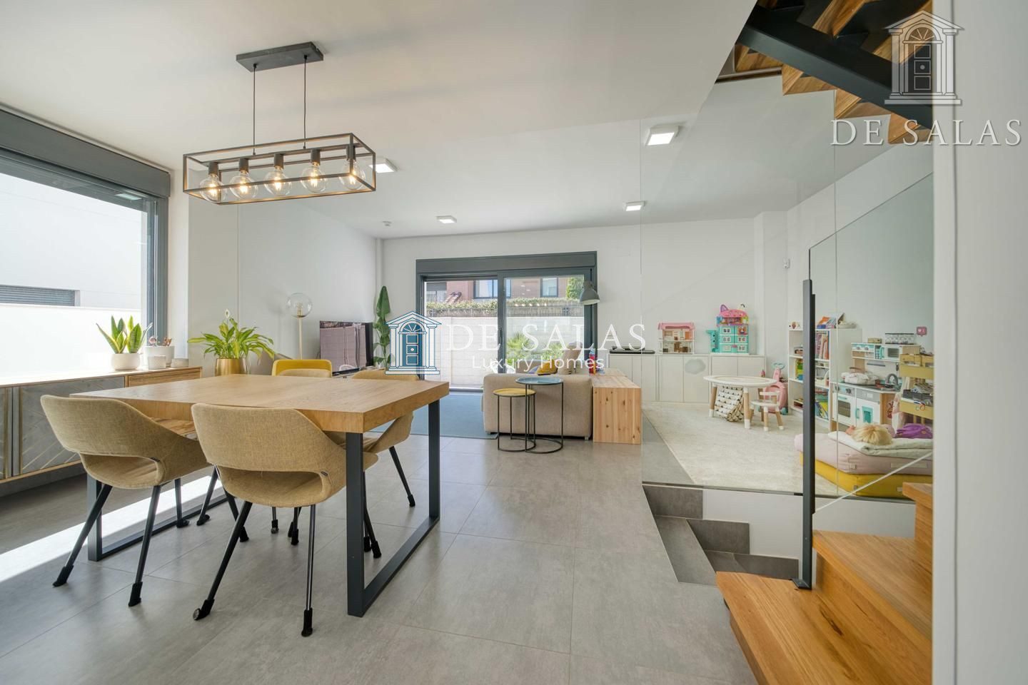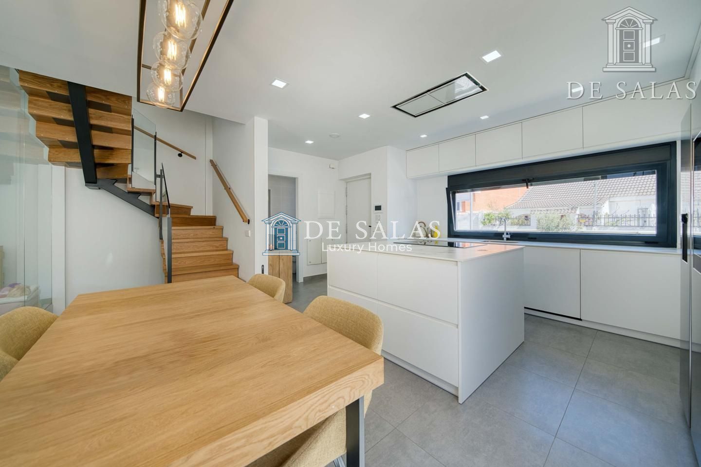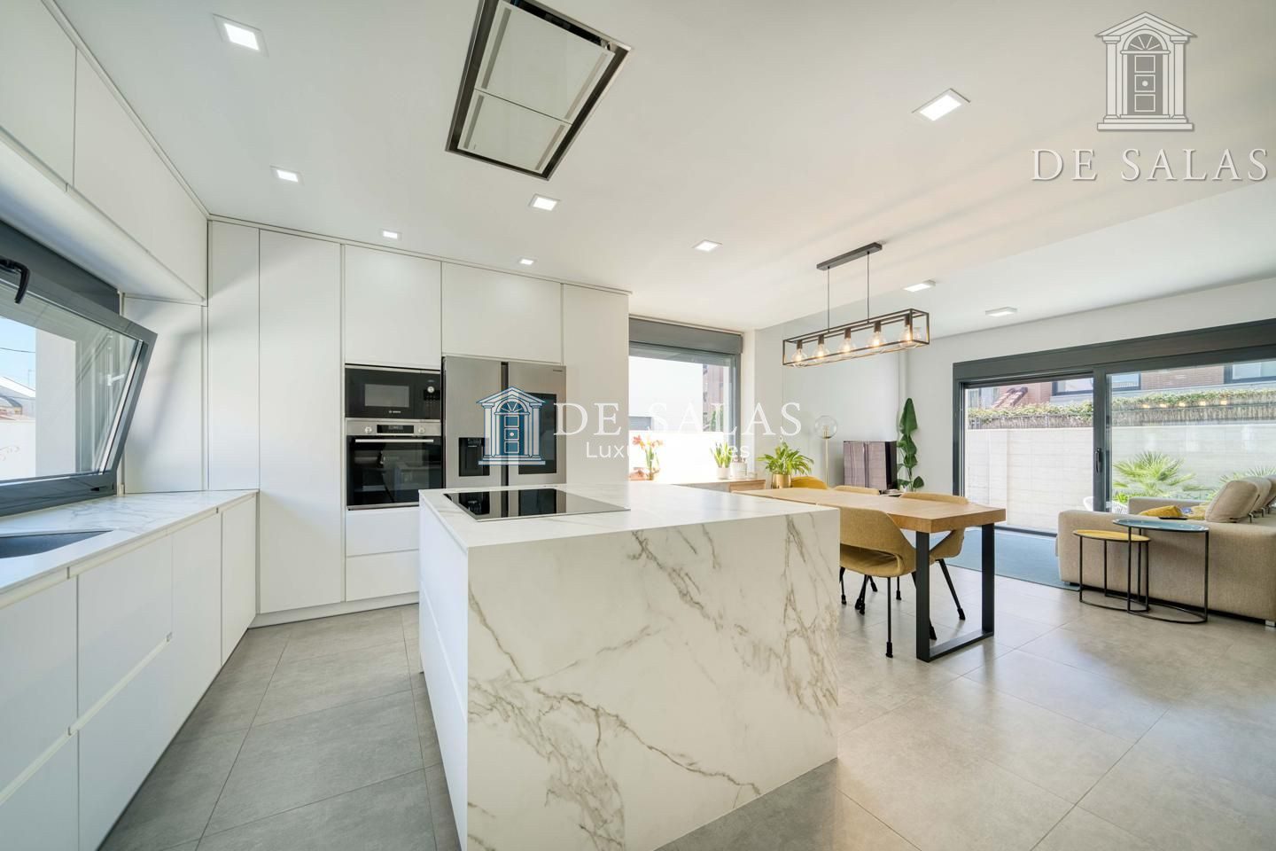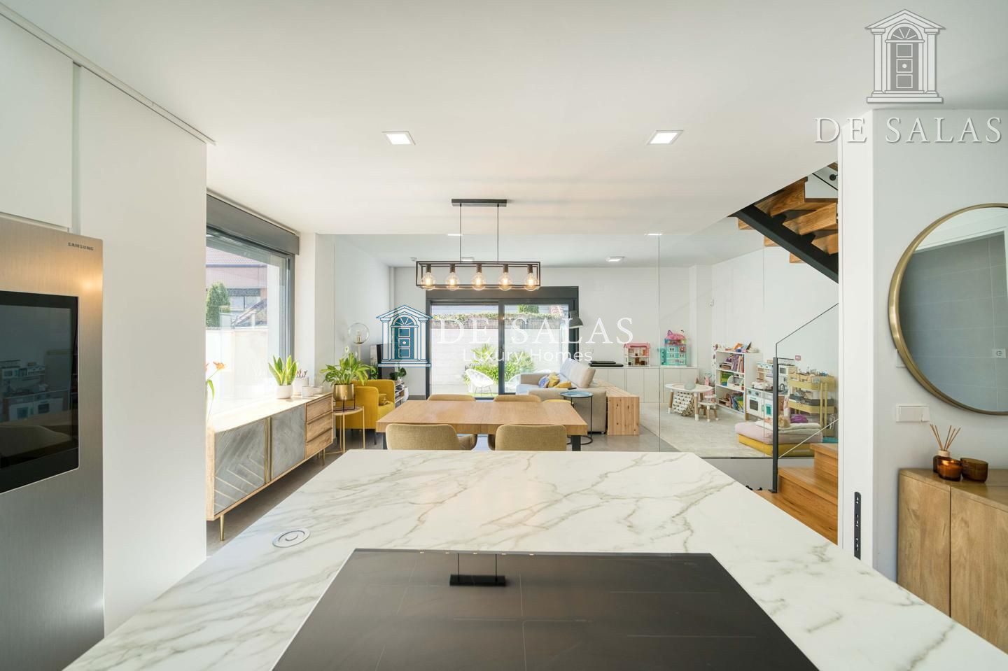 En la planta principal, la vivienda se abre a un espacio luminoso y fluido donde destaca una cocina abierta de estilo contemporáneo, presidida por una generosa isla central. Este espacio no solo sobresale por su diseño, sino también por su altísimo nivel de equipamiento, con electrodomésticos de primeras marcas y una gran capacidad de almacenaje. Junto a la cocina, se encuentra un aseo de cortesía y una amplia zona de salón-comedor, pensada tanto para el día a día como para disfrutar en compañía. Desde aquí se accede directamente al jardín trasero, un espacio muy bien aprovechado que alberga una piscina privada con ducha exterior, creando un oasis particular dentro del hogar.