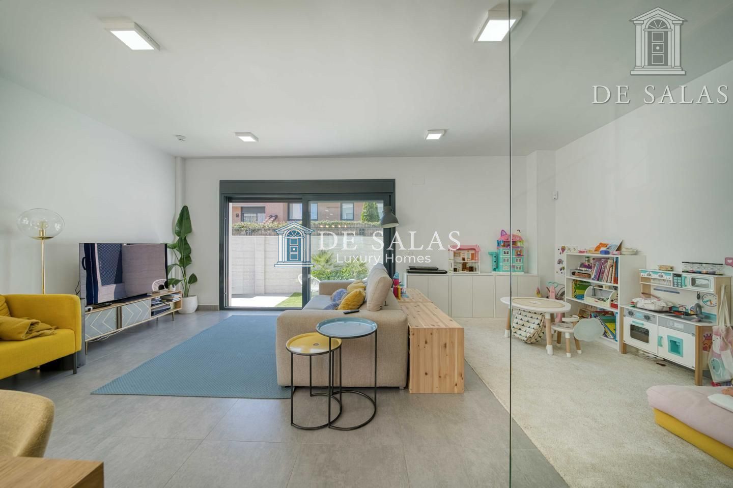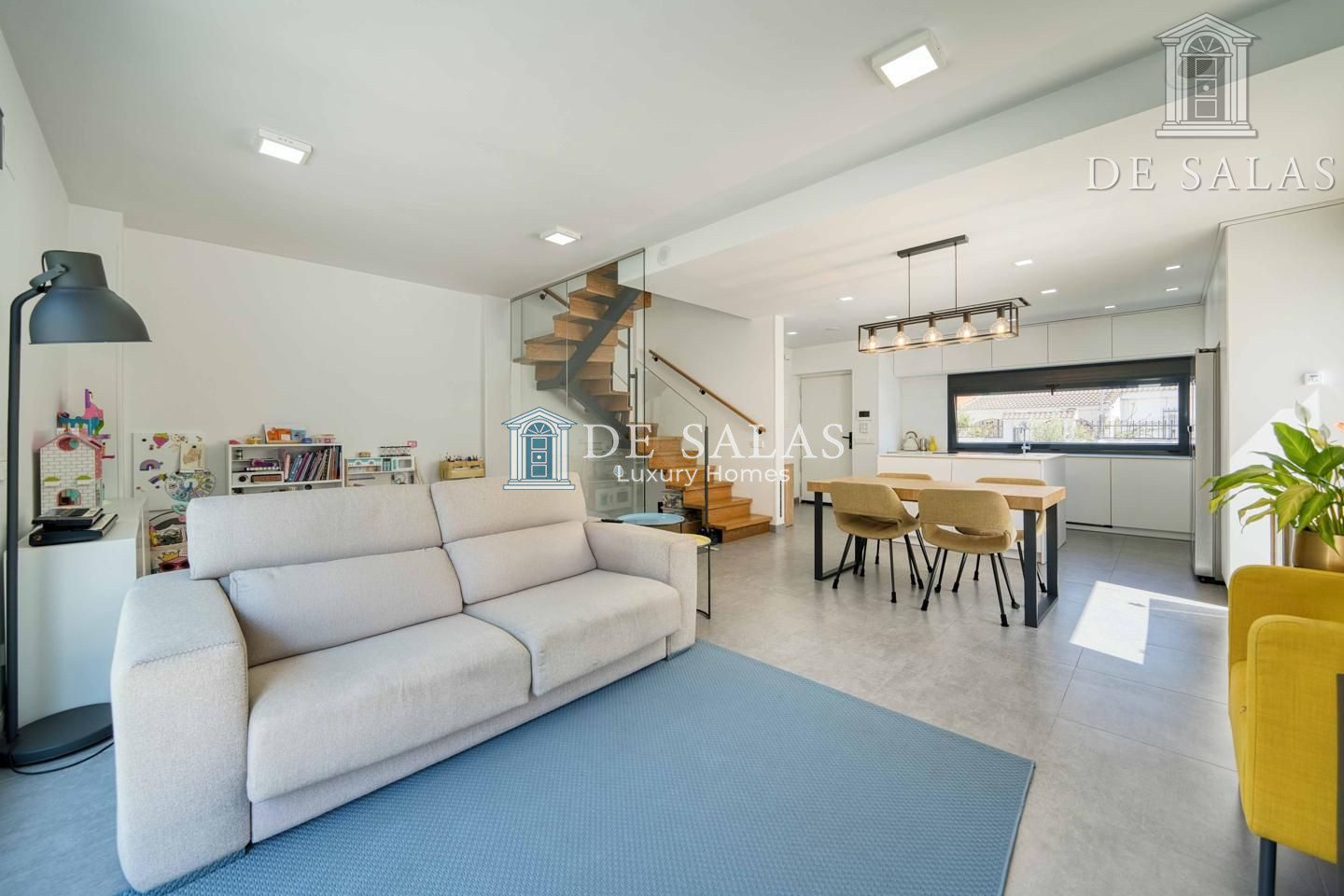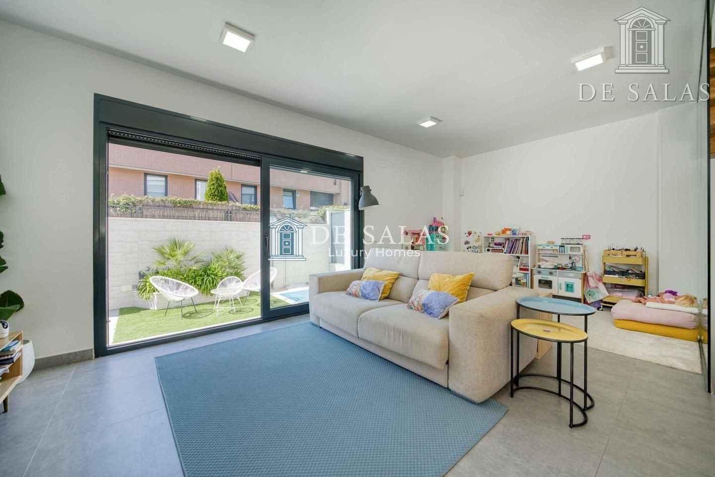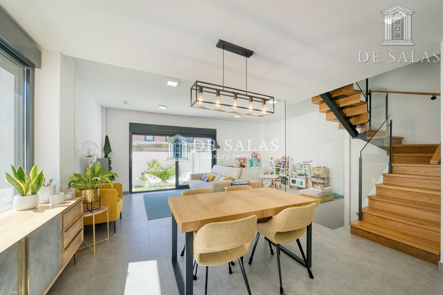En la planta principal, la vivienda se abre a un espacio luminoso y fluido donde destaca una cocina abierta de estilo contemporáneo, presidida por una generosa isla central. Este espacio no solo sobresale por su diseño, sino también por su altísimo nivel de equipamiento, con electrodomésticos de primeras marcas y una gran capacidad de almacenaje. Junto a la cocina, se encuentra un aseo de cortesía y una amplia zona de salón-comedor, pensada tanto para el día a día como para disfrutar en compañía. Desde aquí se accede directamente al jardín trasero, un espacio muy bien aprovechado que alberga una piscina privada con ducha exterior, creando un oasis particular dentro del hogar.