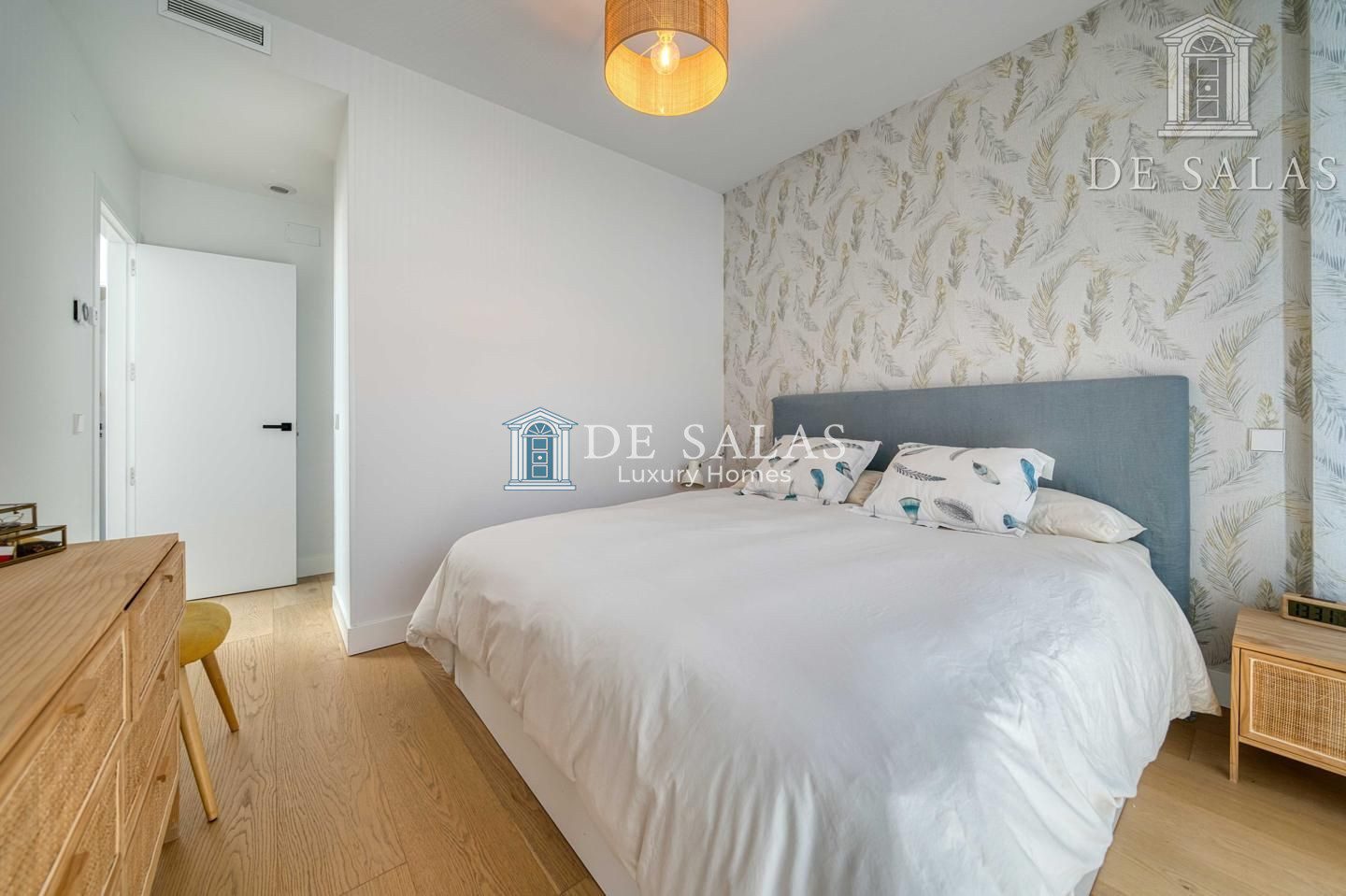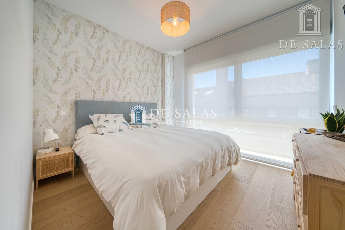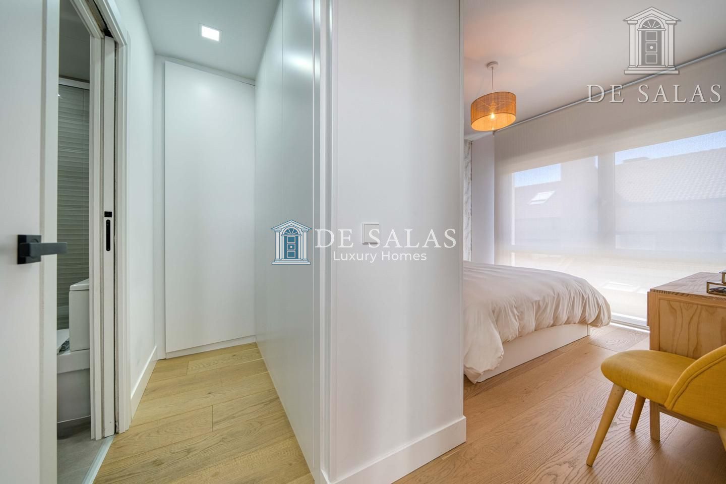 La primera planta está dedicada al descanso, con dos dormitorios con armarios empotrados que comparten un baño completo con bañera, y una luminosa habitación principal en suite que incluye un elegante vestidor, ofreciendo privacidad y comodidad.
