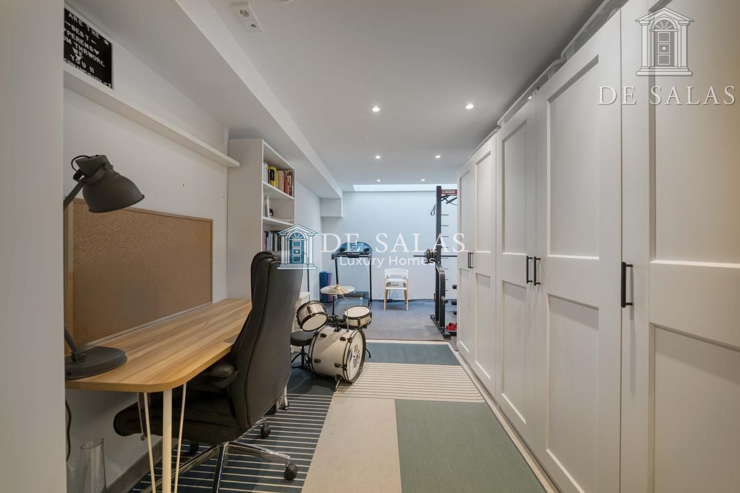 Bajando a la planta sótano, encontramos la entrada directa al garaje con capacidad para dos vehículos, que incluye la preinstalación para puntos de carga de coche eléctrico, un detalle cada vez más valorado. Esta planta también dispone de un práctico trastero, una zona de maquinaria con posibilidad de habilitarse como lavandería, y un versátil espacio de 18 m² que actualmente acoge una zona office y un gimnasio, perfecto para teletrabajar o entrenar sin salir de casa.