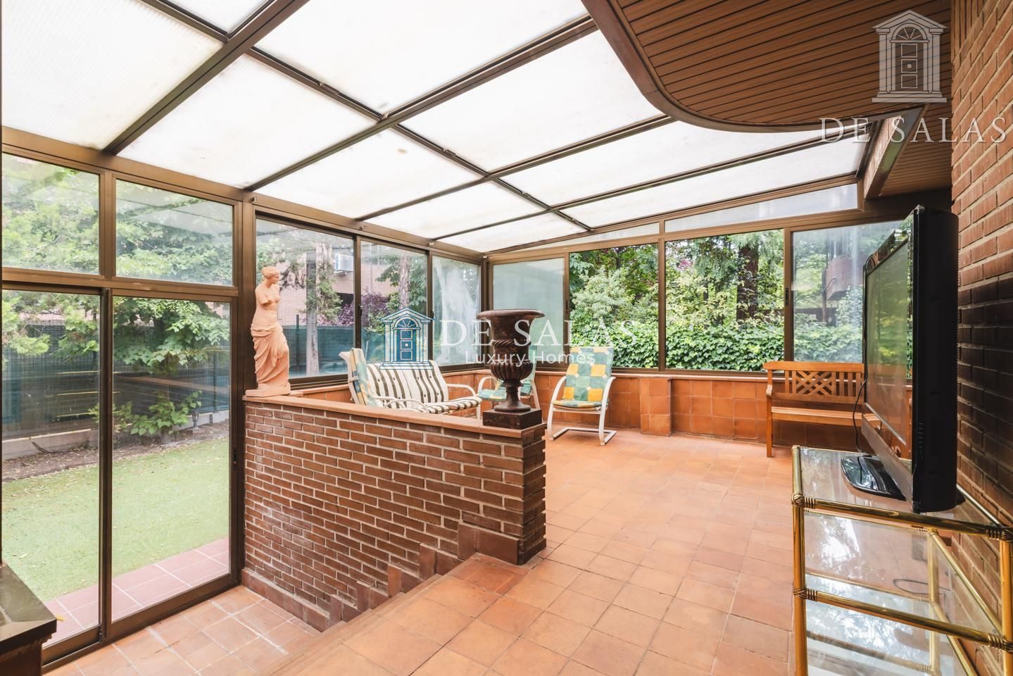 El salón, distribuido en dos ambientes diferenciados —zona de estar con chimenea y comedor— se abre a través de un gran ventanal a un porche cubierto, perfecto para disfrutar de comidas o cenas al aire libre durante los meses más cálidos. Este porche se comunica directamente con el jardín trasero, creando un espacio exterior privado y cómodo.