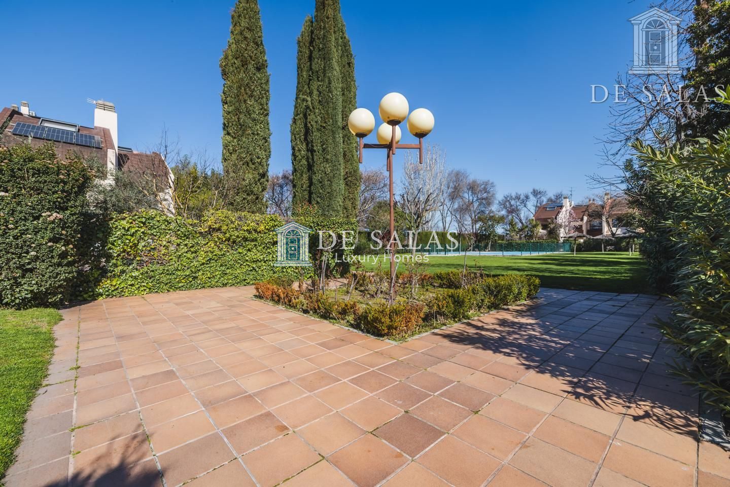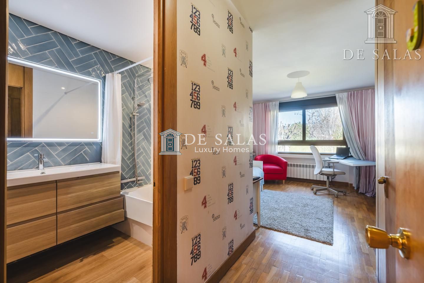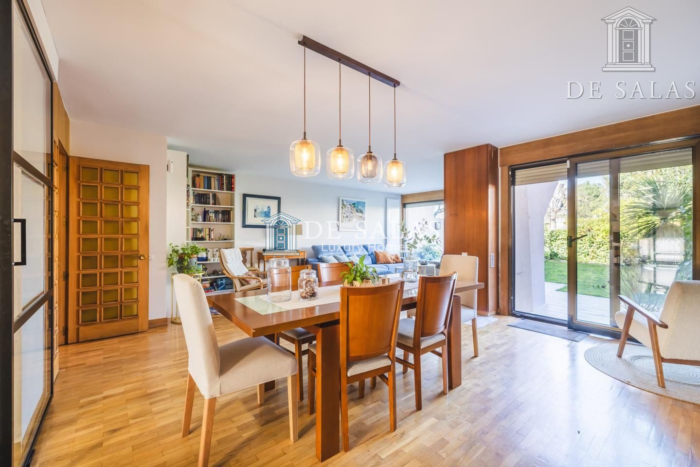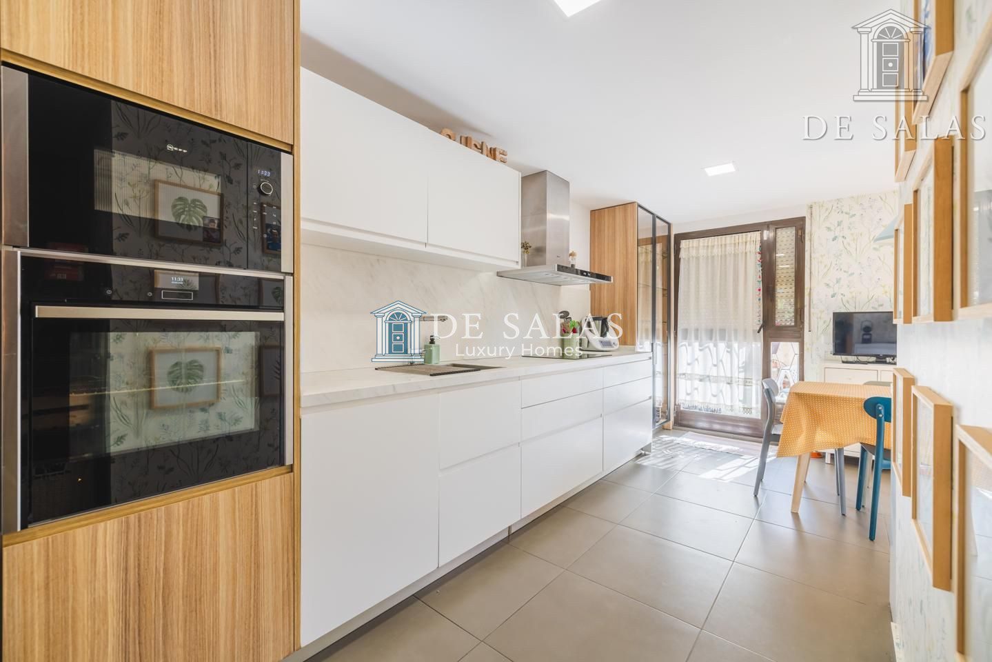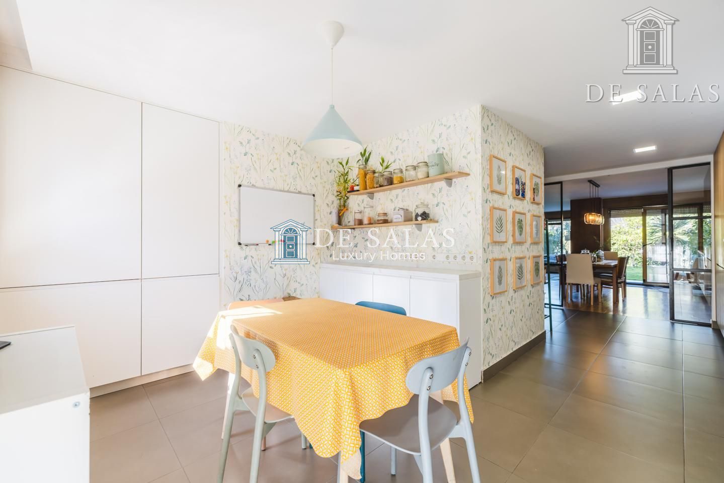 La cocina (24m2), de diseño actual y líneas depuradas, con decoración y revestimientos de Porcelanosa y amplia zona office con mesa para 6 comensales, destaca por su carácter liviano. Tiene salida a un agradable patio trasero y se comunica con el comedor mediante una puerta corredera de cristal con perfilería negra, aportando continuidad visual hacia el hermoso jardín.