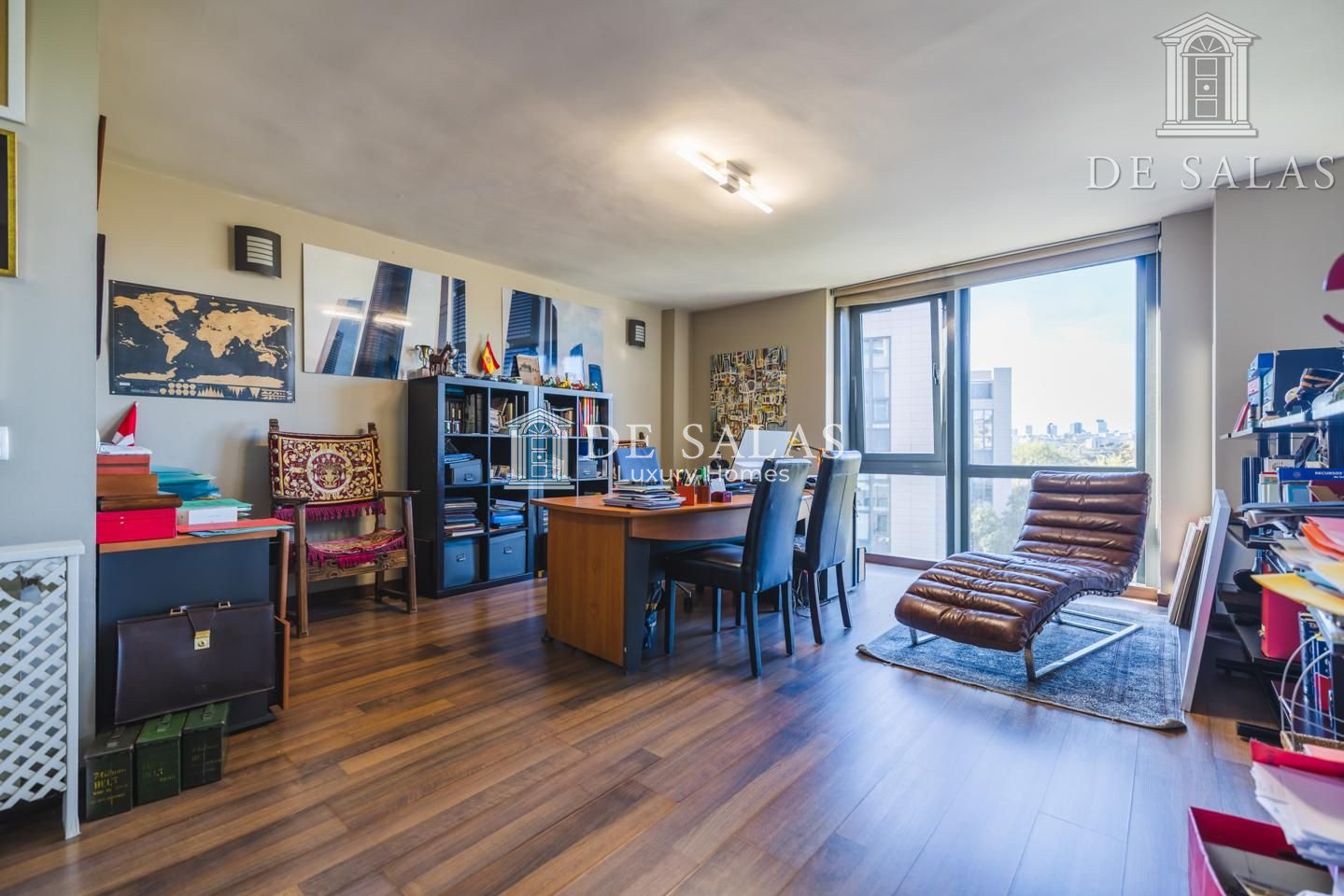 Totalmente diáfana con amplio salón comedor y cocina abierta amueblada-equipada. Con vistas impresionantes sobre el skyline de Madrid y sus espectaculares atardeceres.