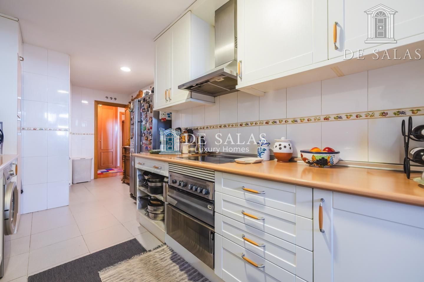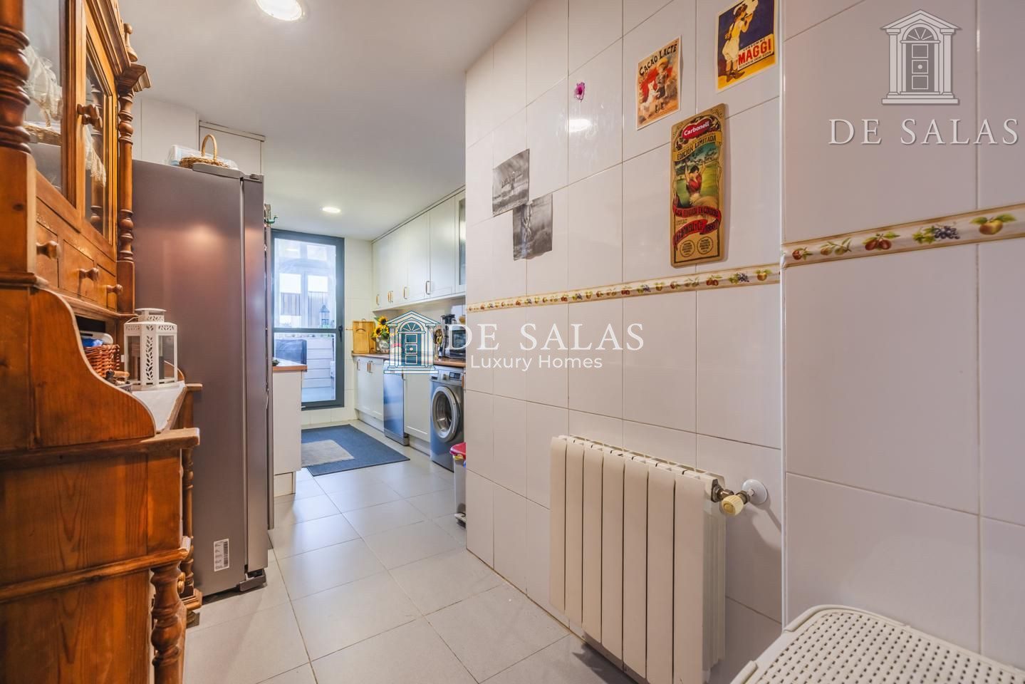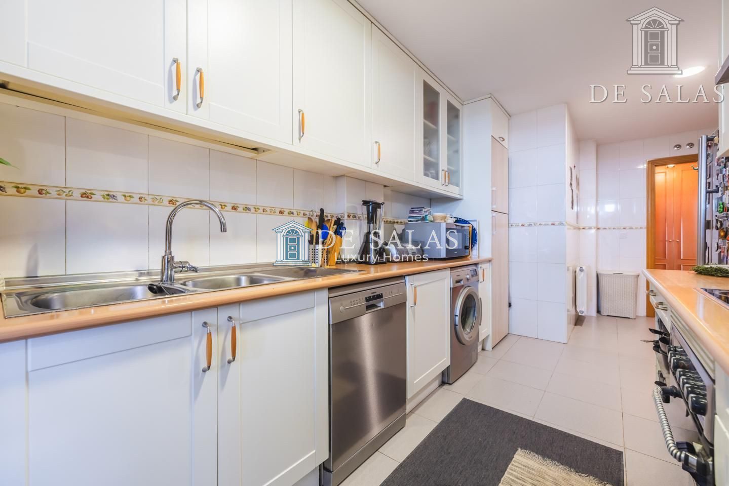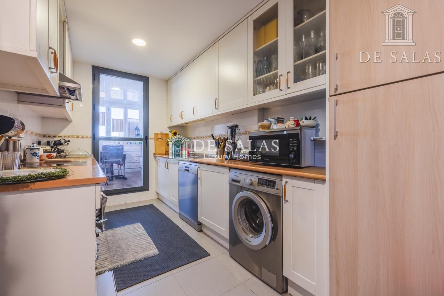 La cocina, muy cómoda y espaciosa, cuenta con espacio para una alacena y frigorífico americano. Amueblada en 2 frentes con armarios altos y bajos, además de un cómodo despensero, cuenta también con una zona de office de 8m2 que comunica directamente con la terraza.