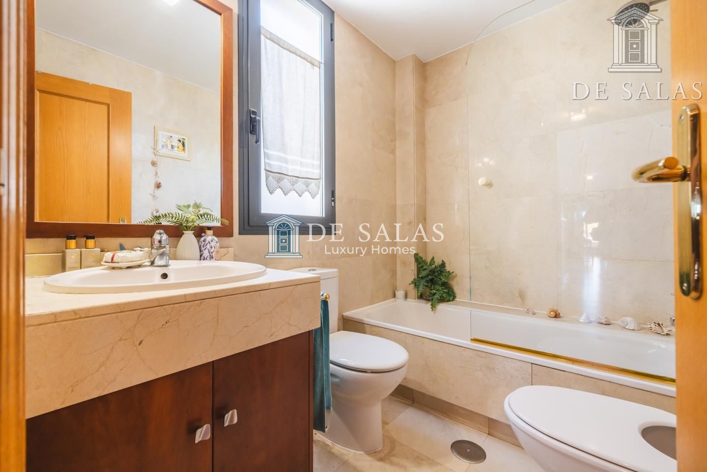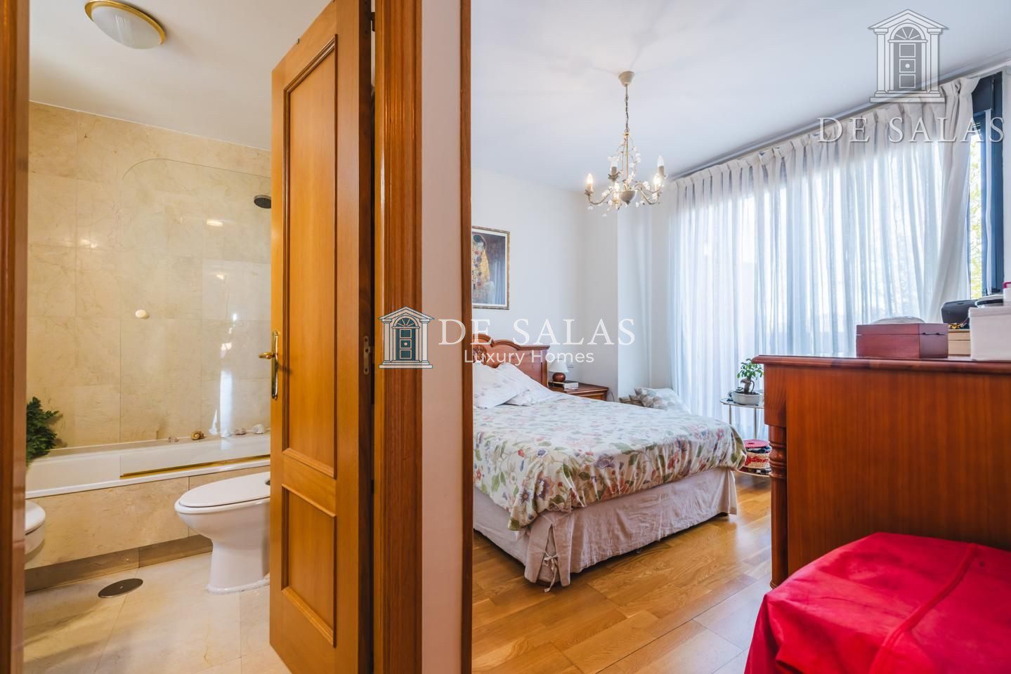 La zona de noche se encuentra totalmente independiente del salón-comedor y cocina. El dormitorio principal tiene una zona vestidor y cuarto de baño en suite con bañera, lavabo de doble seno con encimera en mármol y ventana exterior. Desde este dormitorio podemos salir directamente a la terraza.