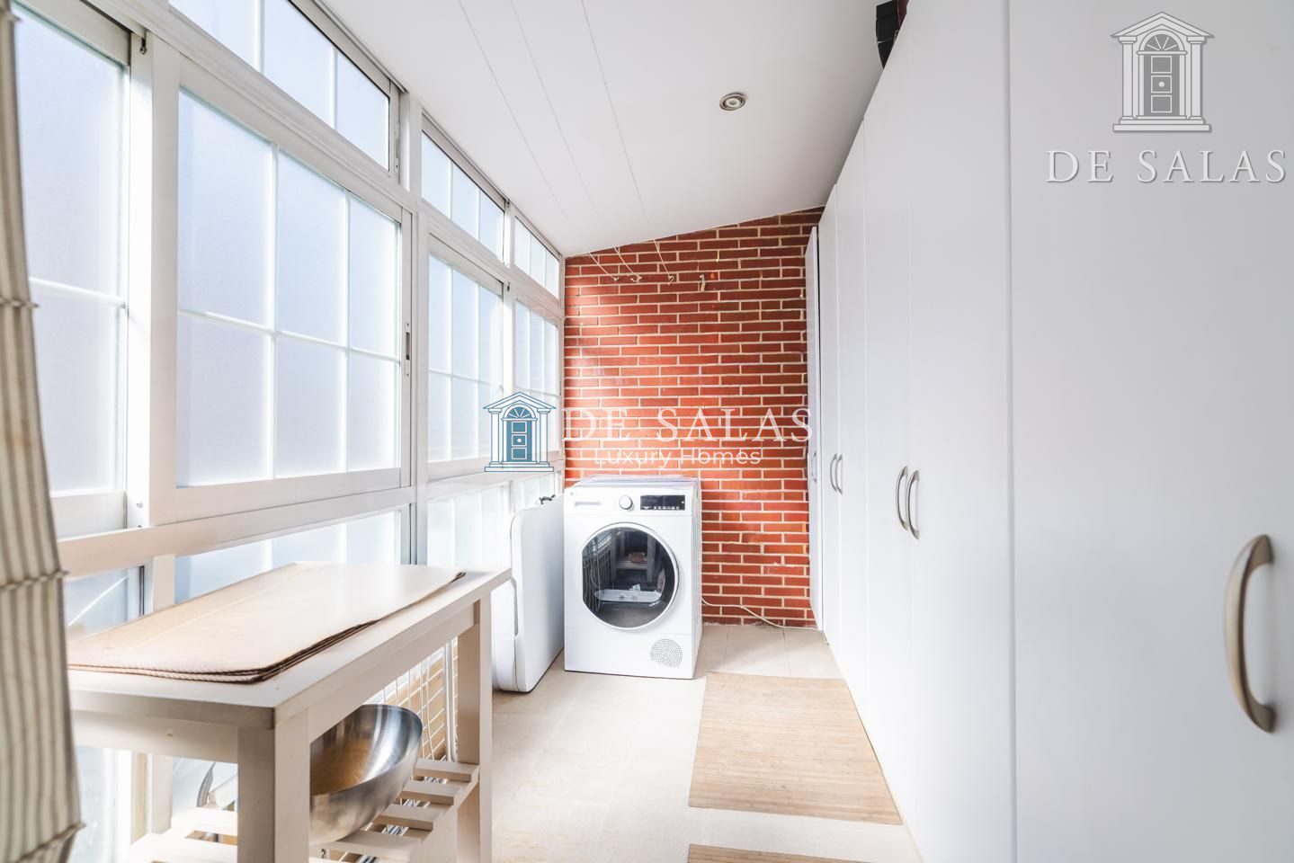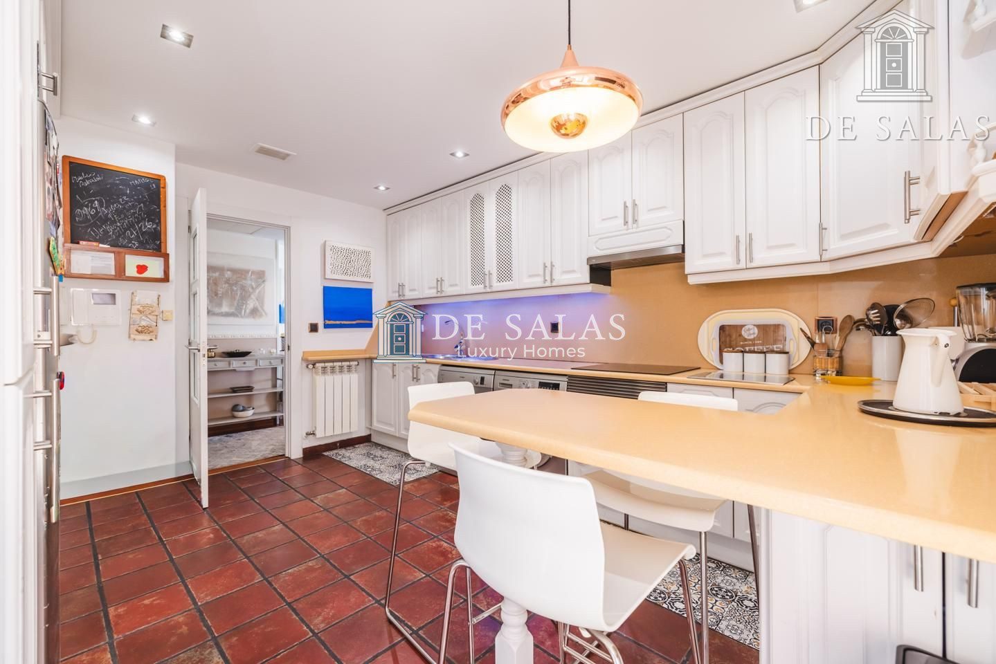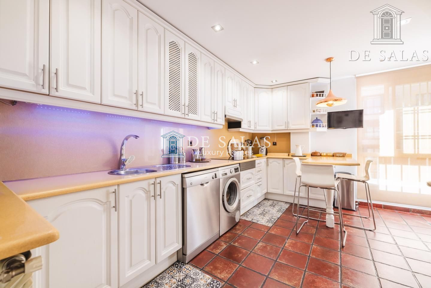 La cocina (16m2) es ideal para los amantes del arte culinario, ya que goza de suficiente espacio de trabajo y cuenta con una cómoda barra para comer a diario, todo en sylestone color arena que combina perfectamente con el blanco de los armarios.. Junto a la cocina se encuentra al lavadero-tendedero con numerosos armarios para que todo guarde un perfecto orden.