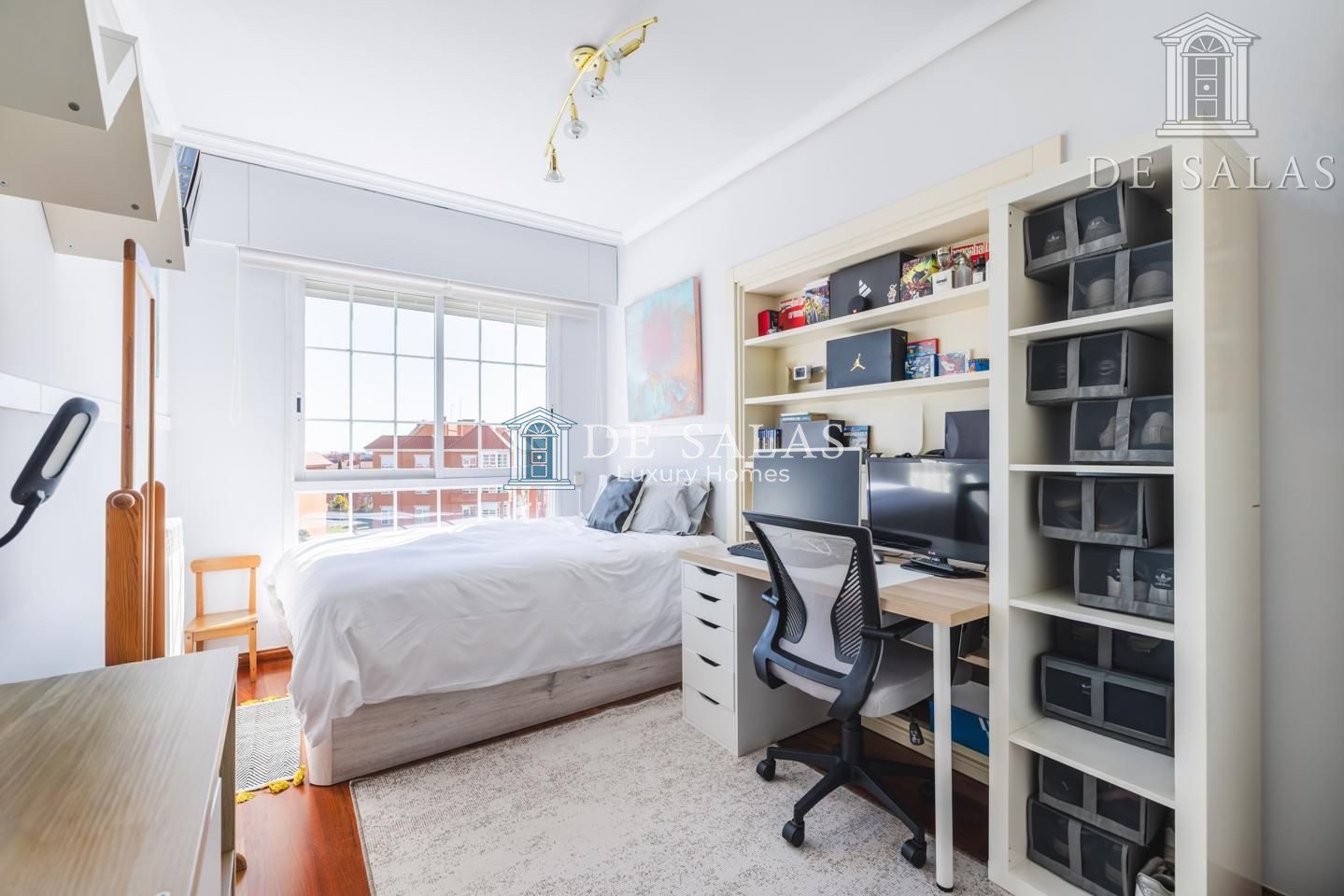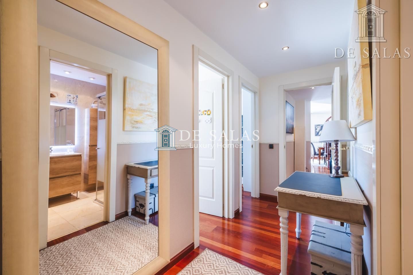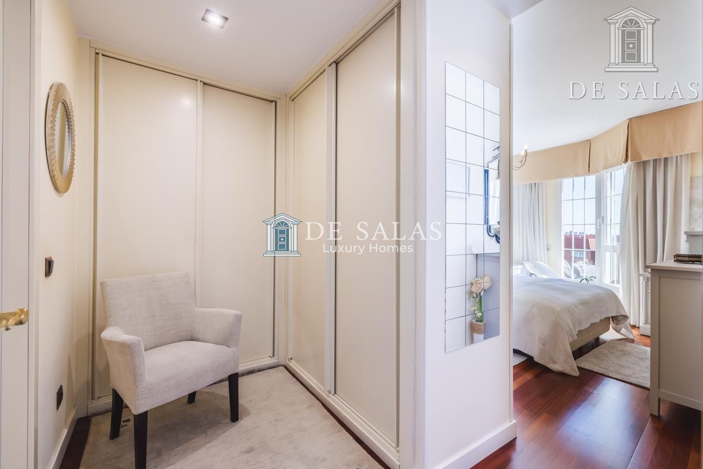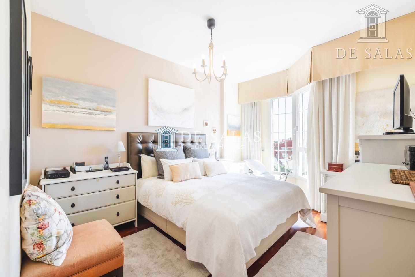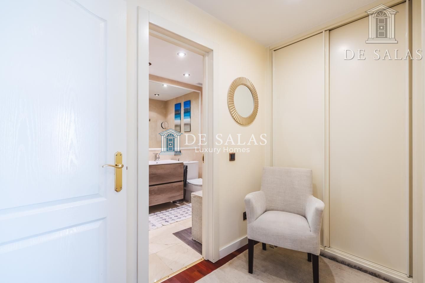 El dormitorio principal (18m2), con un bonito ventanal mirador, cuenta con una zona destinada a vestidor y tiene su propio cuarto de baño en suite con ducha, lavabo de doble seno y bidé.