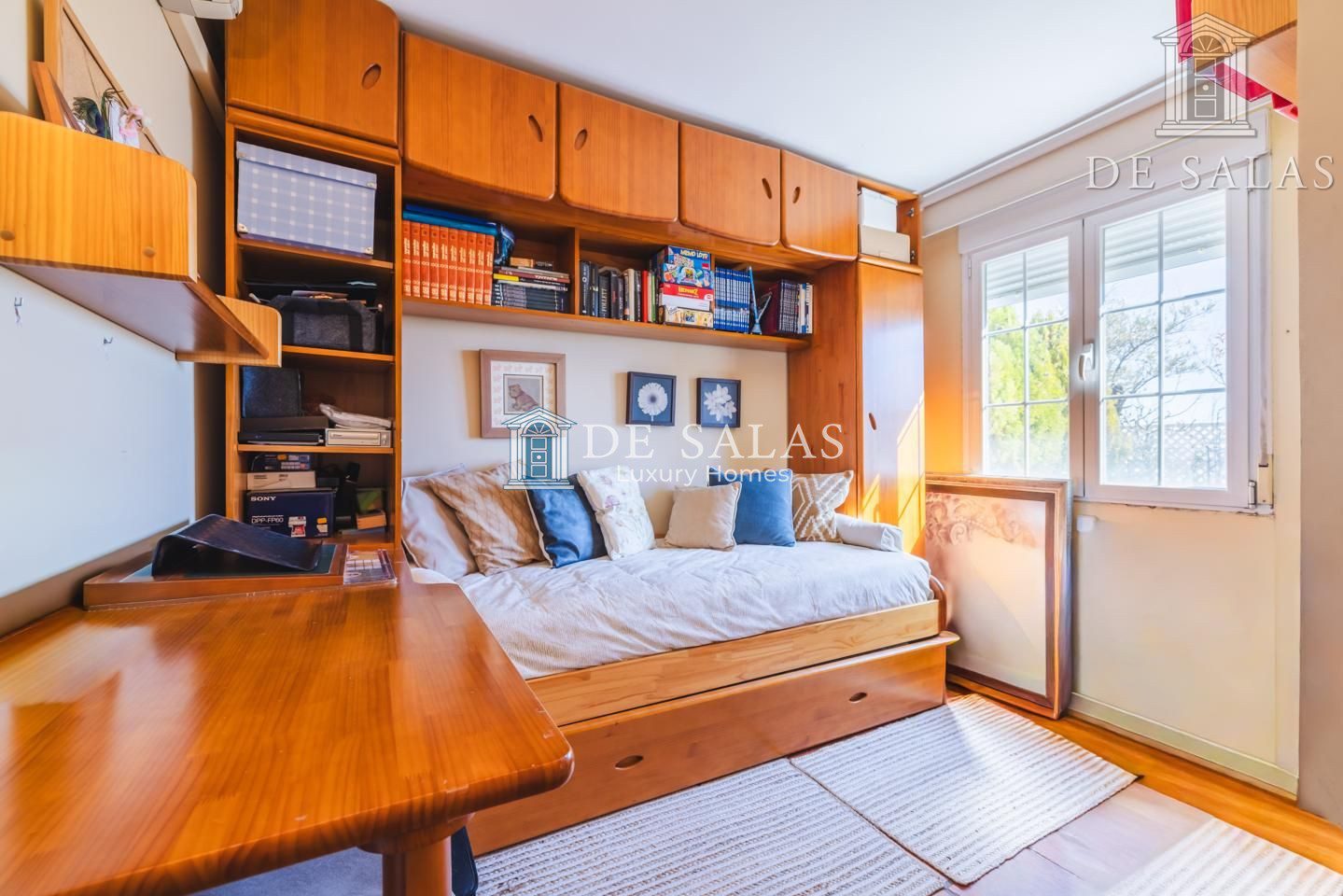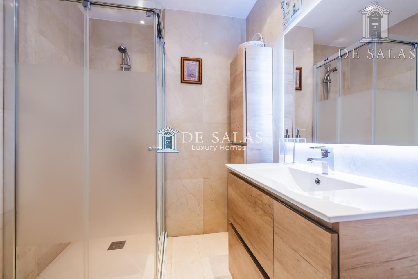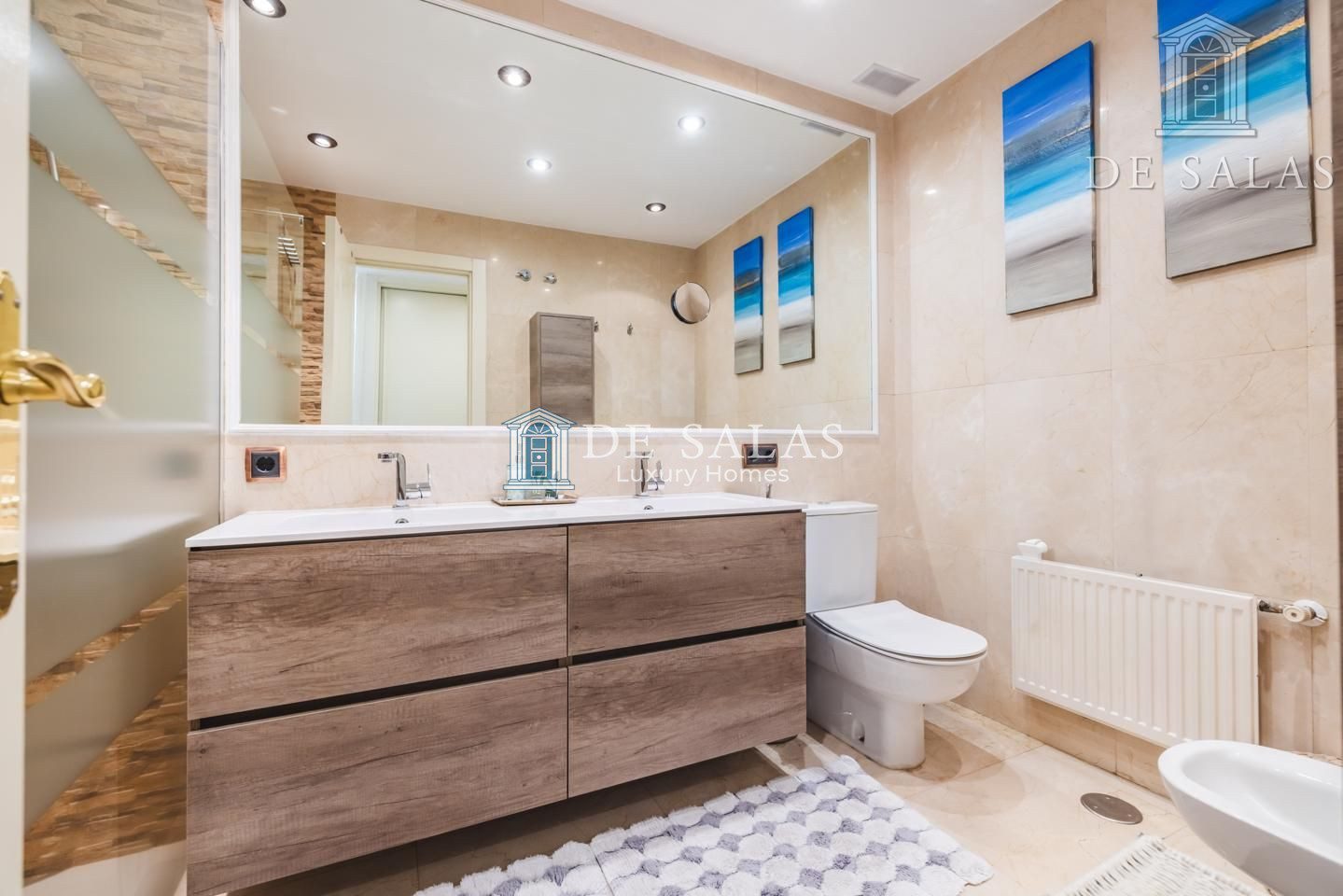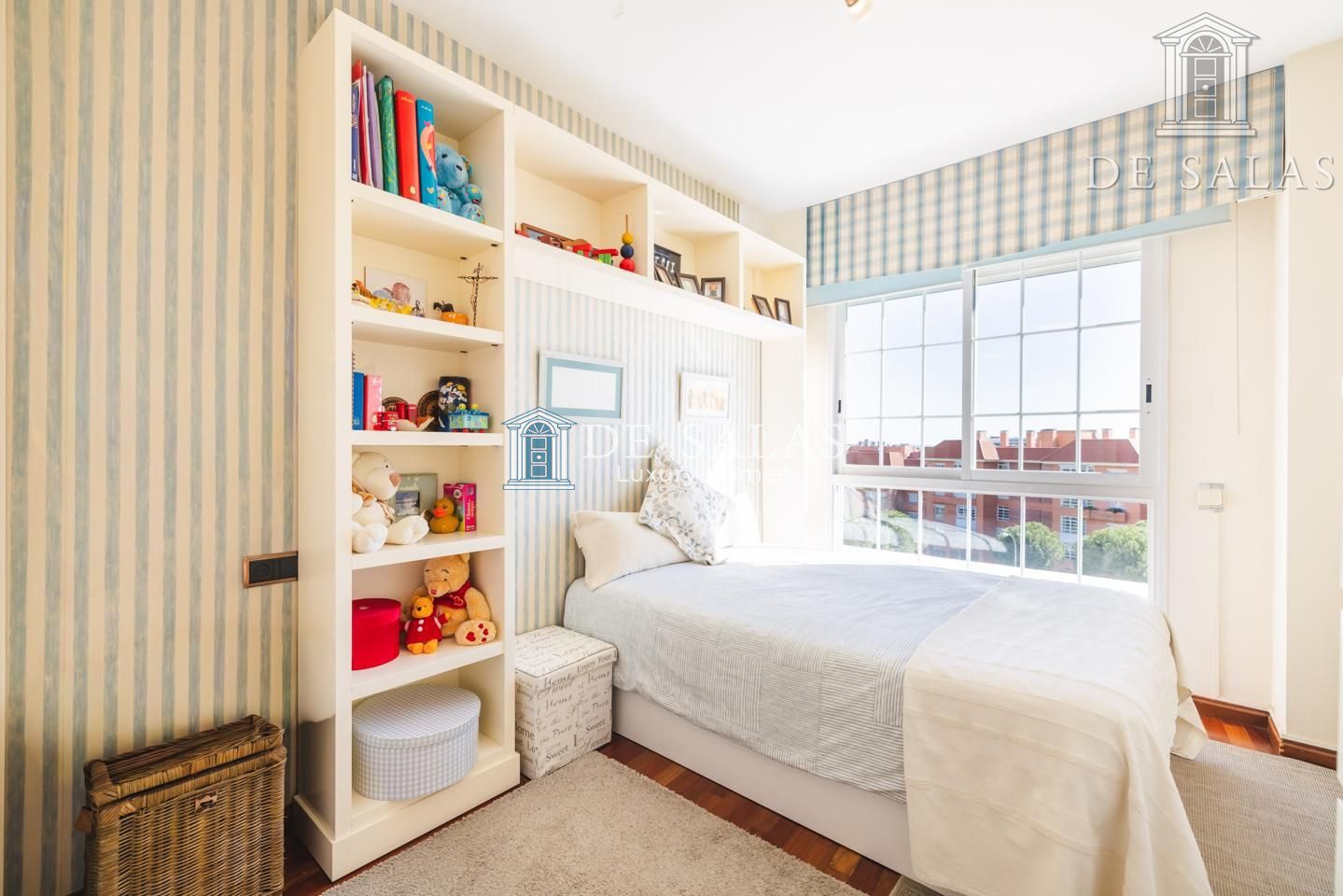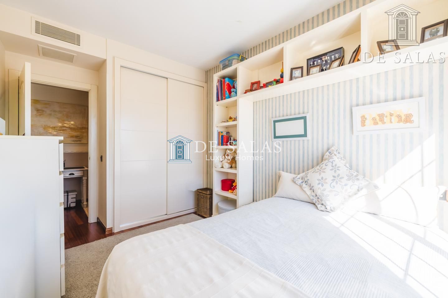 El dormitorio principal (18m2), con un bonito ventanal mirador, cuenta con una zona destinada a vestidor y tiene su propio cuarto de baño en suite con ducha, lavabo de doble seno y bidé.