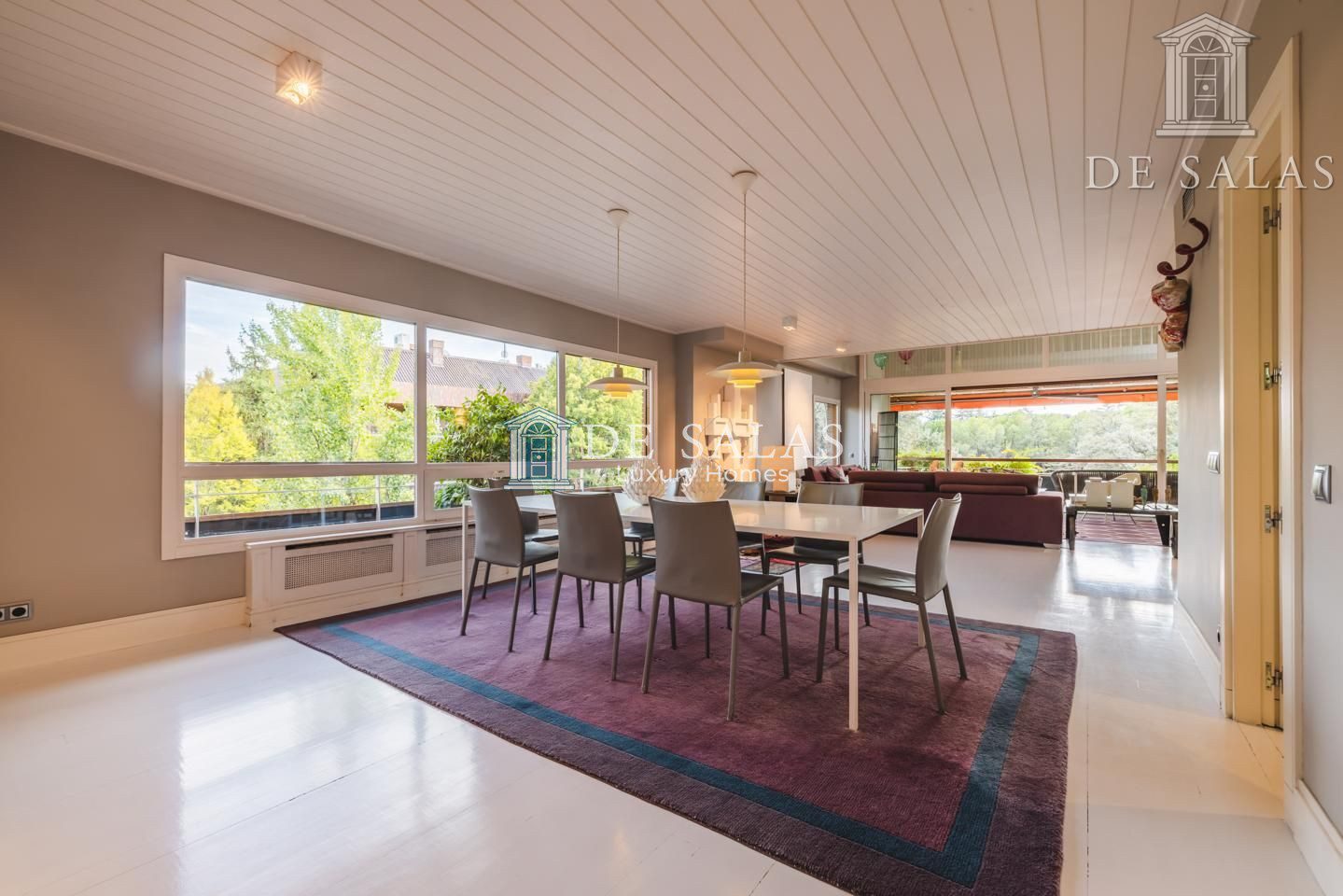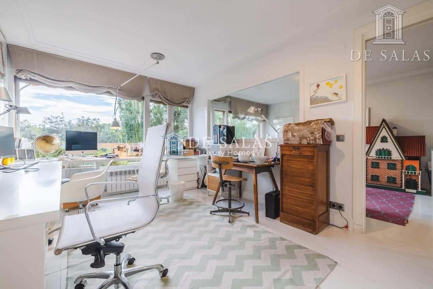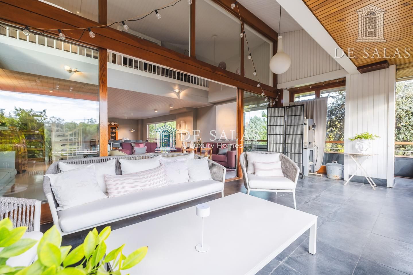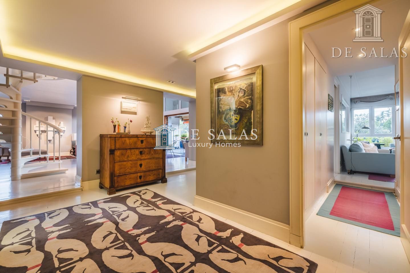 Representativo hall de entrada, que se abre a un amplio salón dividido en dos zonas, comunicadas con un comedor independiente. Amplia cocina de diseño actual con office, dispone de zona de servicio (dormitorio de servicio con baño completo). Existe una habitación de juegos-estar, un despacho señorial, un aseo de cortesía y una fabulosa terraza que se asoma sobre los jardines de la urbanización y vistas sobre La Moraleja.