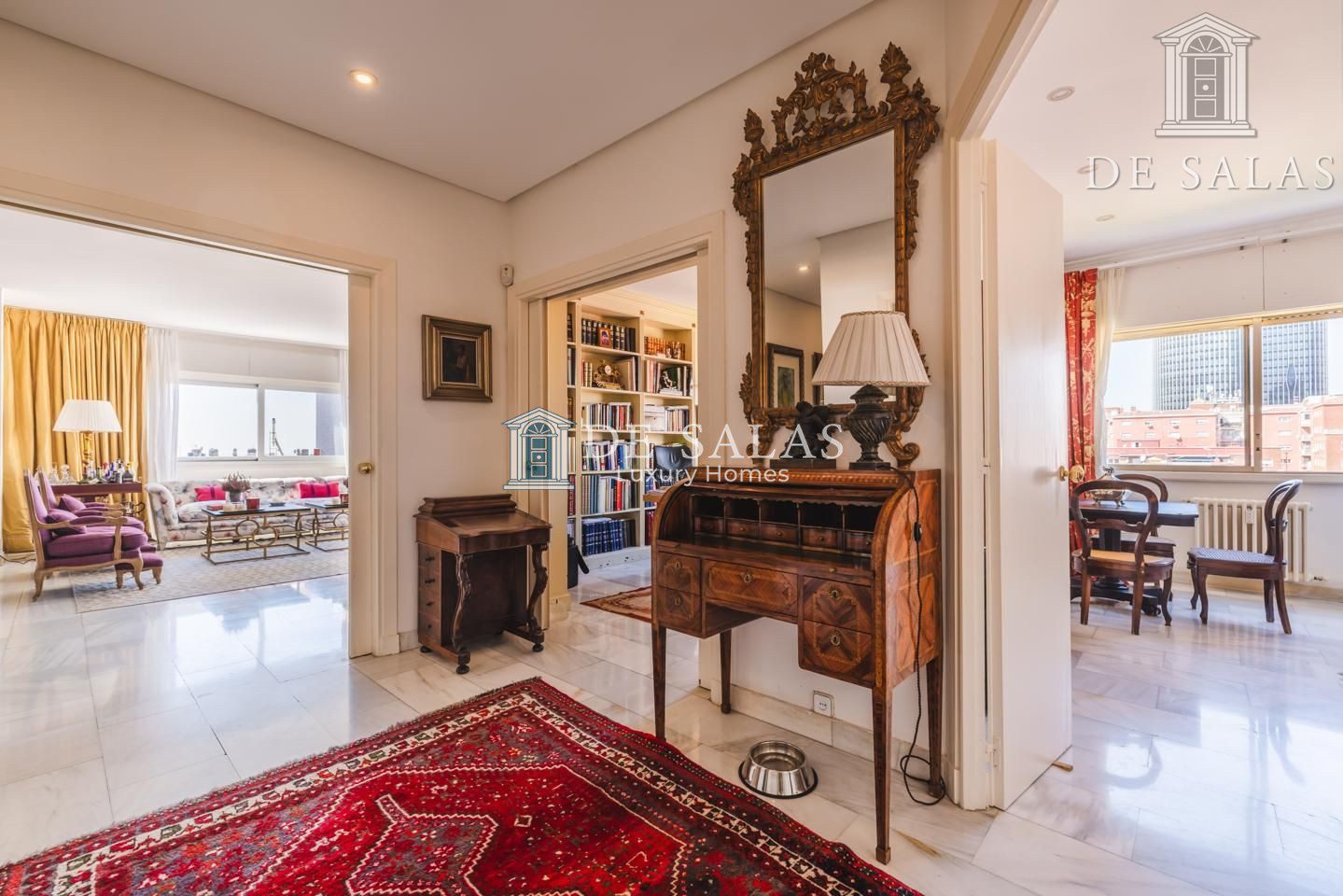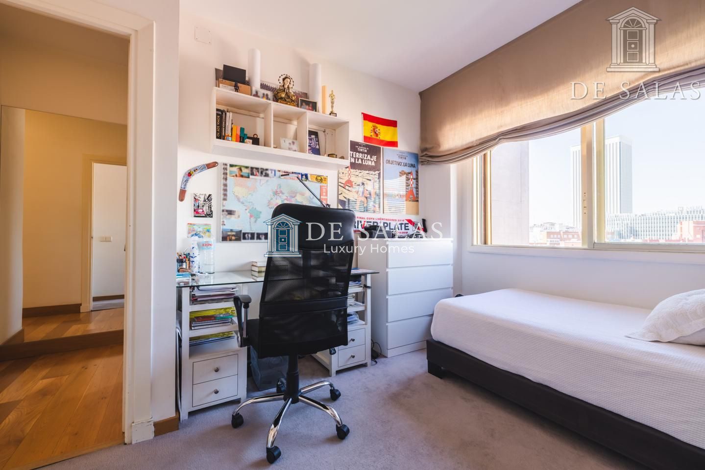 Se accede a la vivienda a través de un amplio hall distribuidor, que nos da acceso a un fantástico salón independiente de 65m², distribuido en 3 ambientes, con terraza integrada y disfrutando de unas espectaculares vistas al skyline de Madrid. Con orientación suroeste, disfruta de una iluminación excepcional durante todo el día.