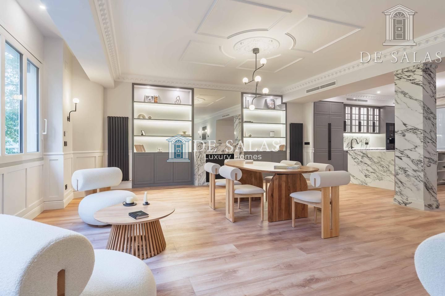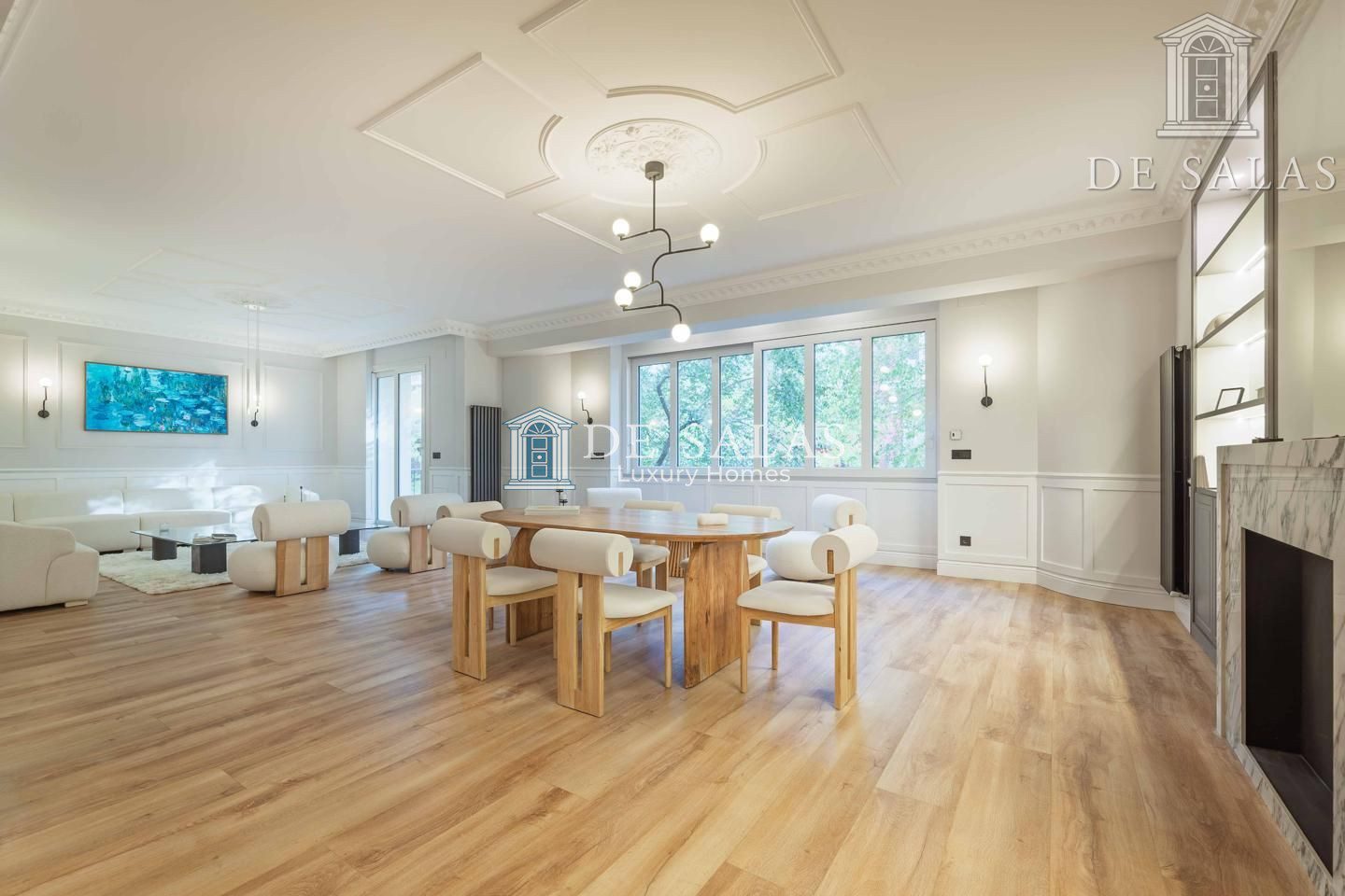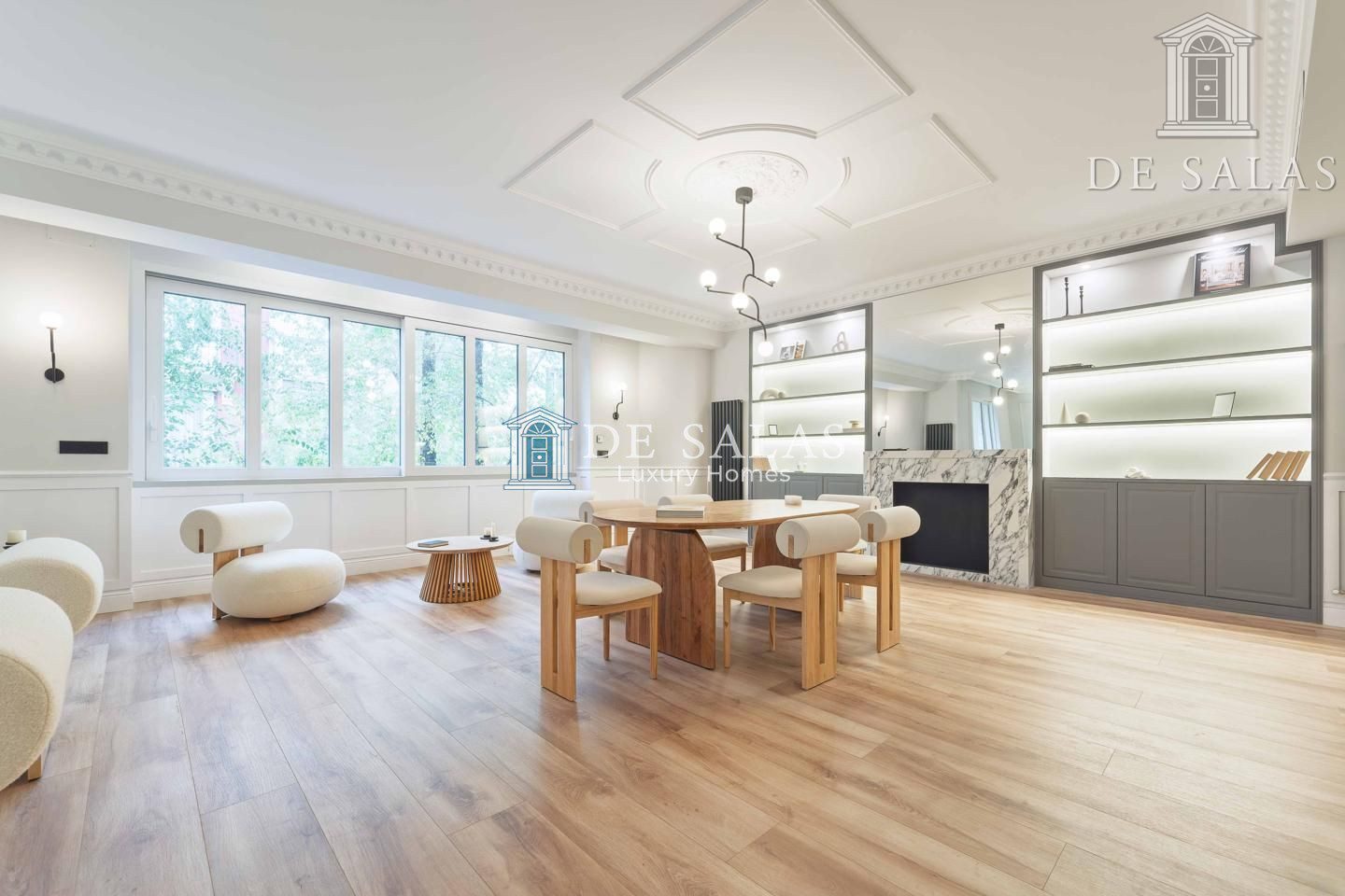El salón-comedor destaca por su bonita chimenea ornamental y unos acertados muebles realizados a medida a cada lado. Llaman igualmente la atención las maravillosas molduras en los techos, de estilo clásico, que conjugan a la perfección con sus modernas lámparas.