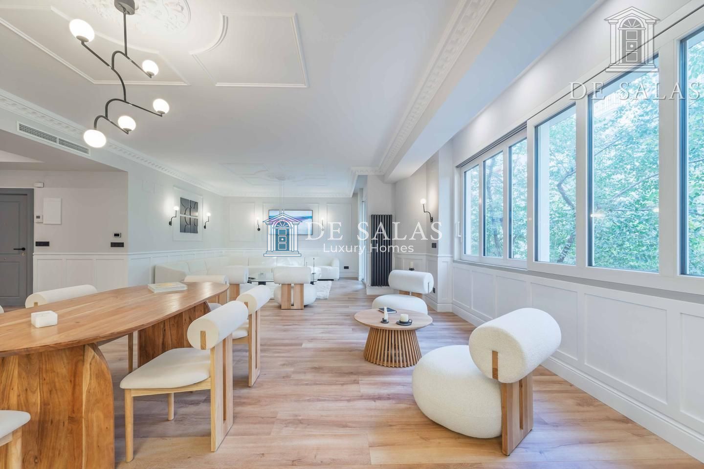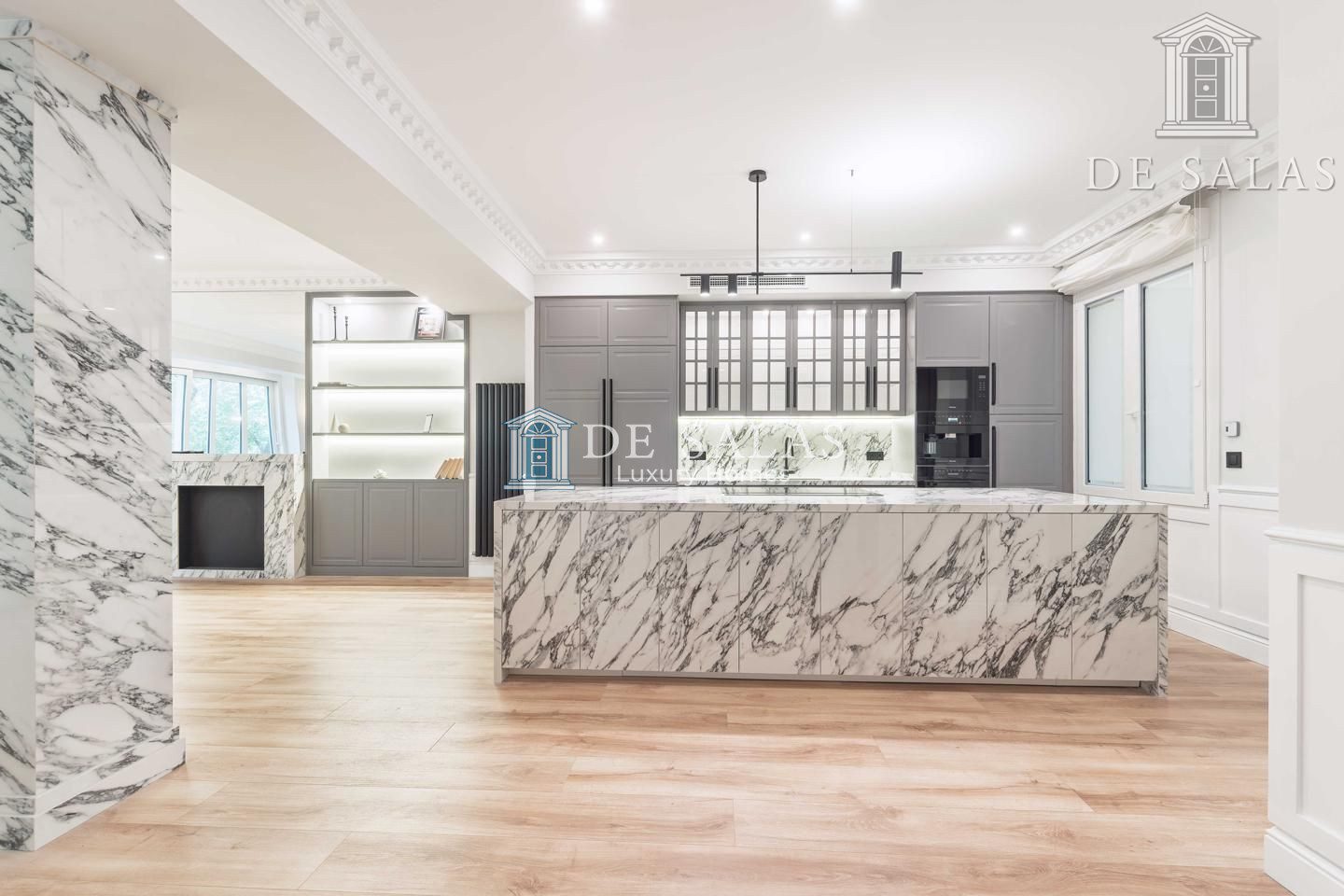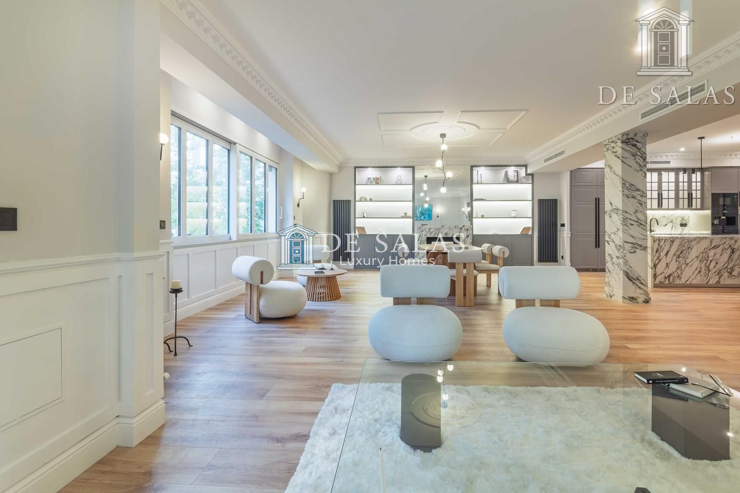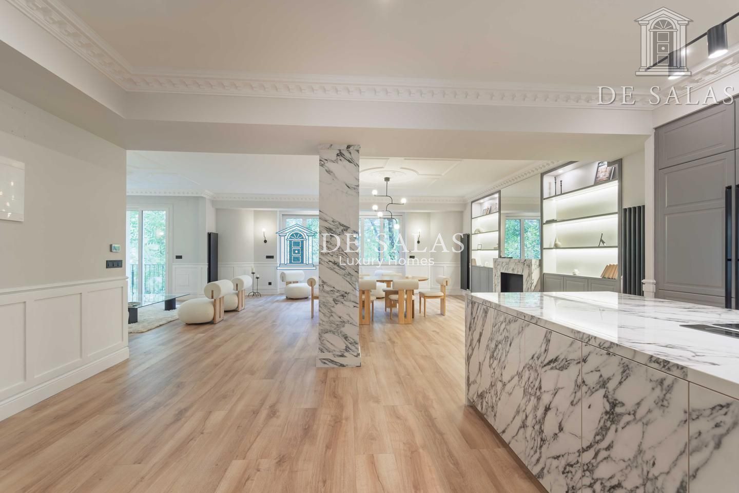 El salón-comedor destaca por su bonita chimenea ornamental y unos acertados muebles realizados a medida a cada lado. Llaman igualmente la atención las maravillosas molduras en los techos, de estilo clásico, que conjugan a la perfección con sus modernas lámparas.