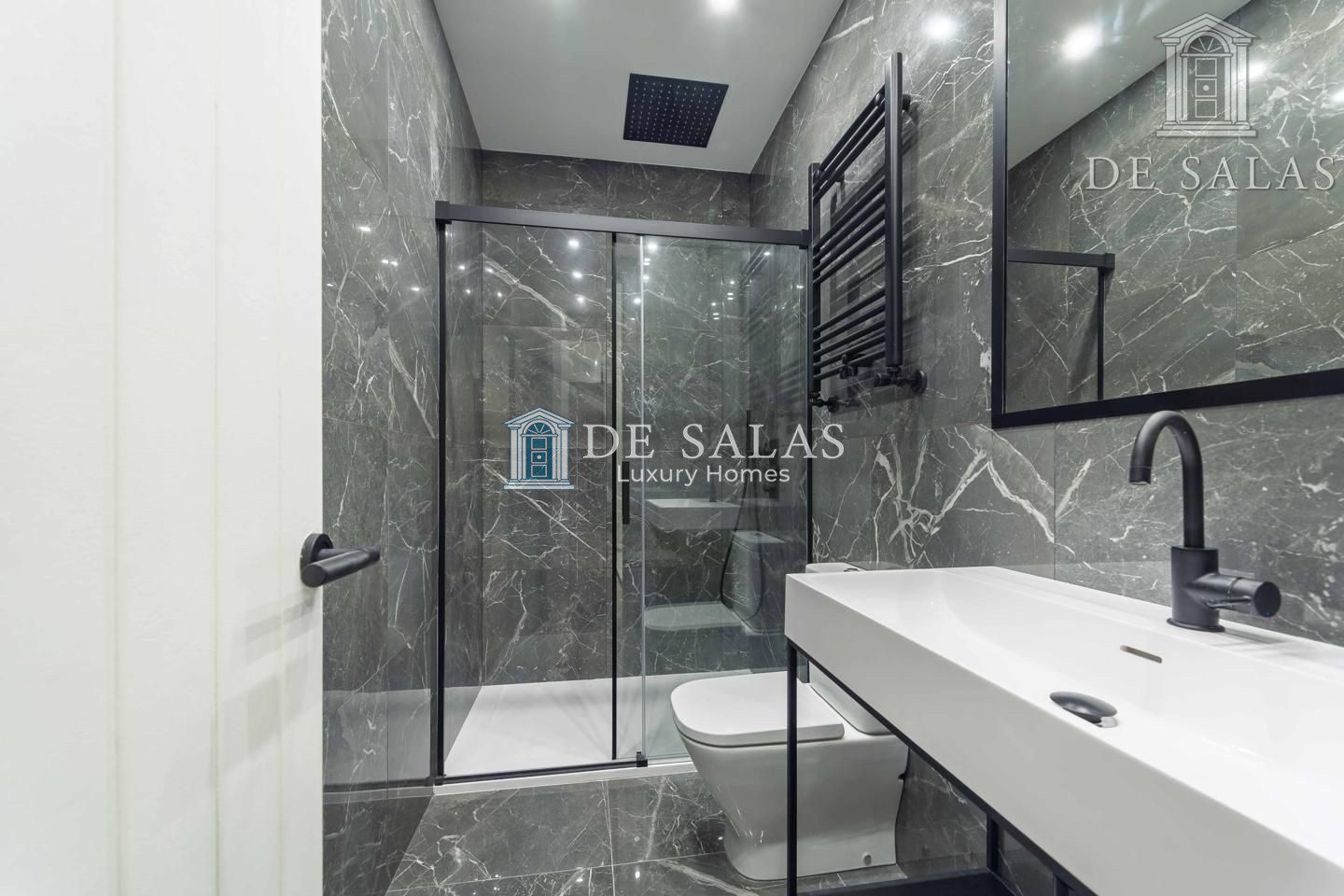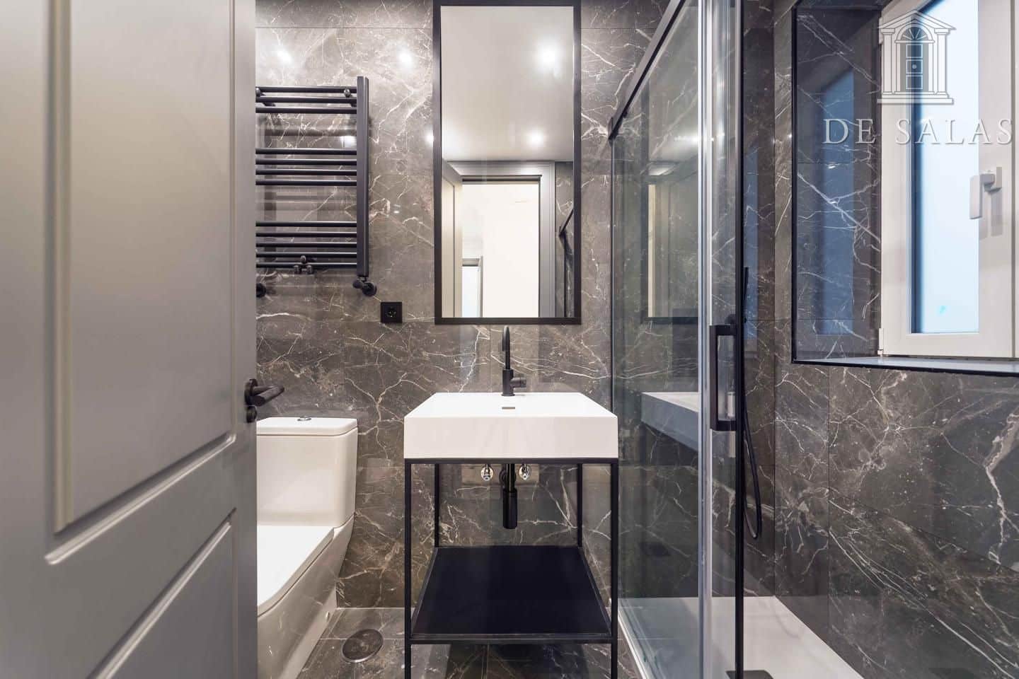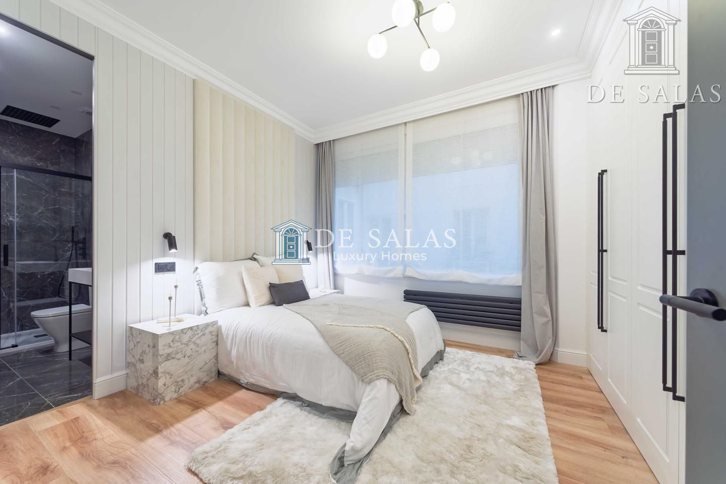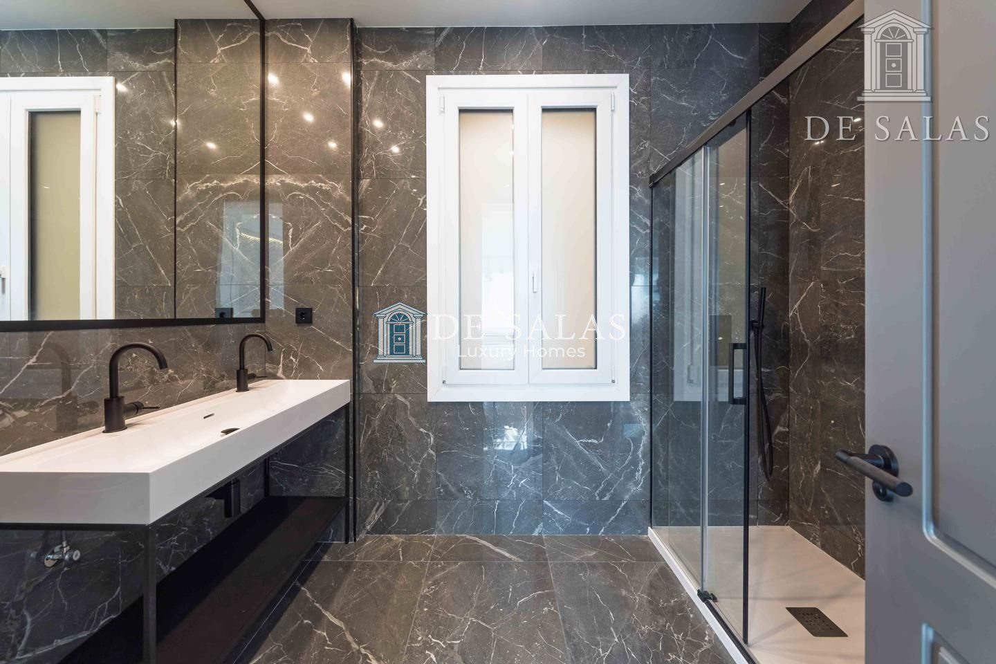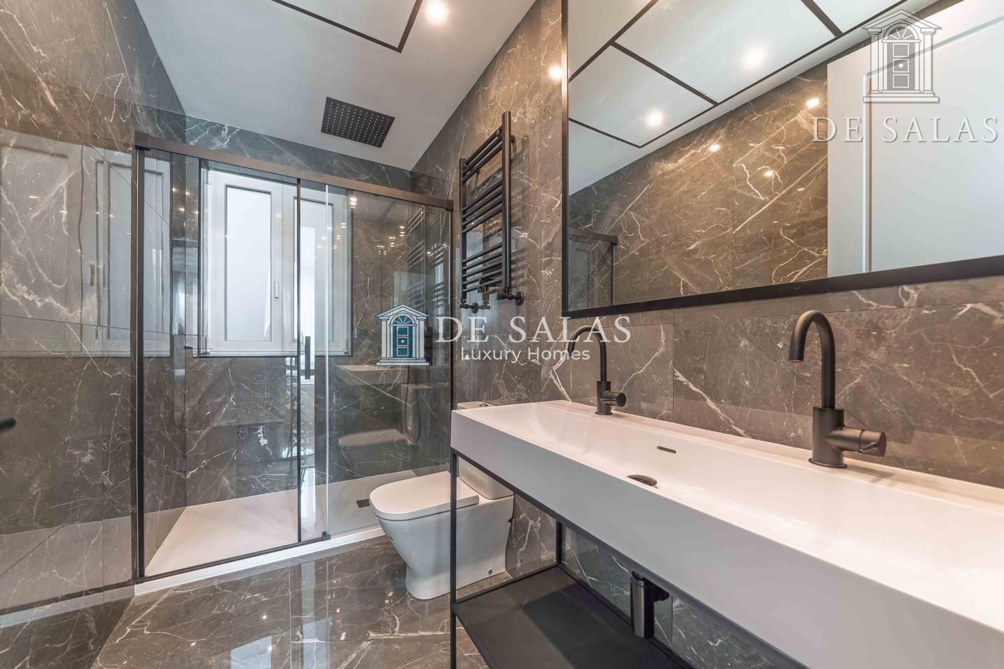 Dormitorio principal con ventanal mirador en esquina y muebles realizados a medida bajo las ventanas. Cuarto de baño con gran lavabo y dos grifos independientes. Estupenda ducha con mampara con perfilería en color negro.