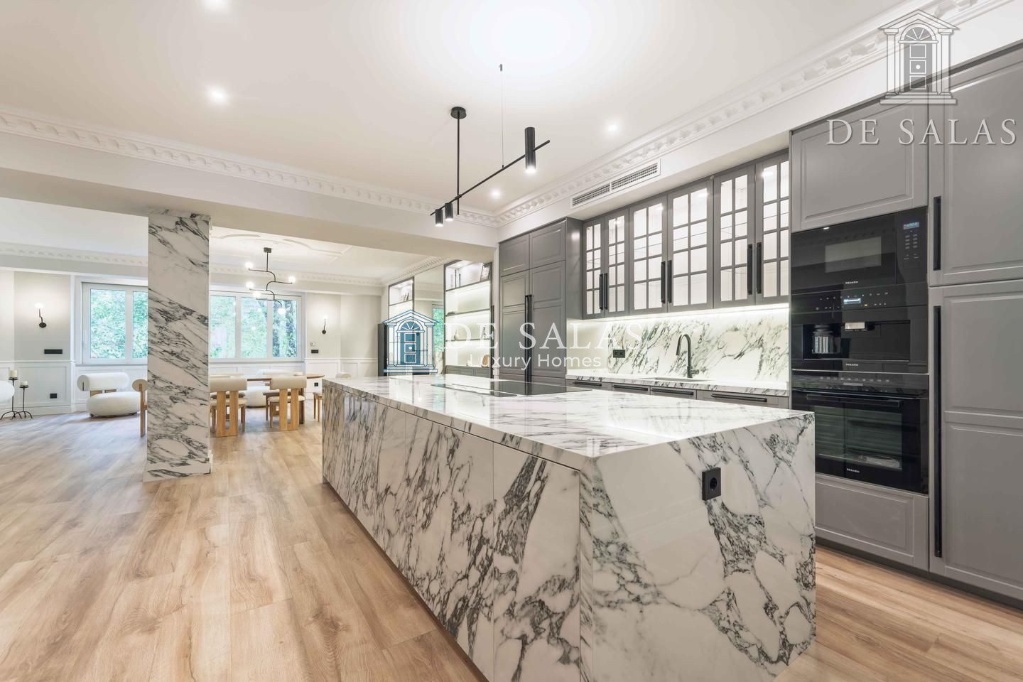 El salón-comedor, de 60m2 , con una pequeña terraza, se une a la cocina abierta (30m2) con gran isla central con encimera y extractor de humos integrado y con armarios y cajones en todo su alrededor para poder tener mayor capacidad de almacenaje. Los electrodomésticos se encuentran panelados (frigorífico) e integrados (horno, microondas y cafetera, Todo de la prestigiosa marca “Miele”.
