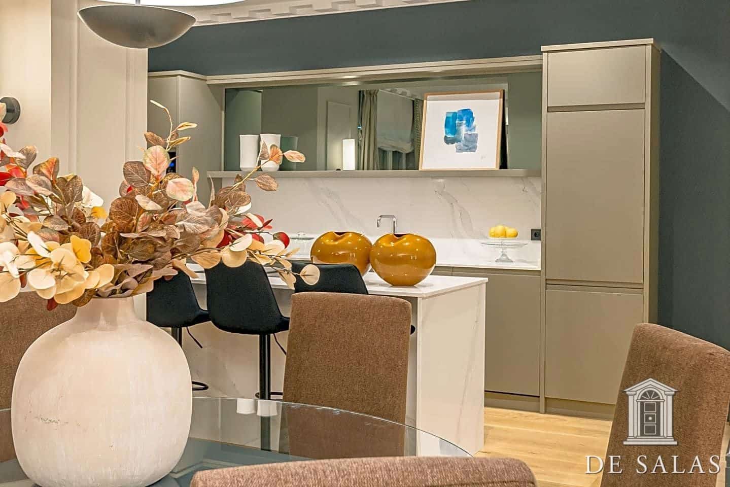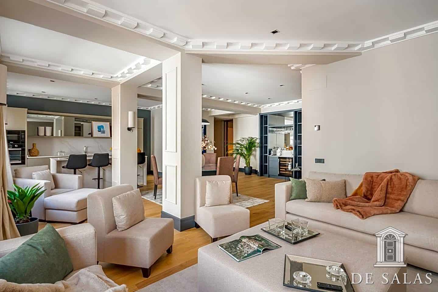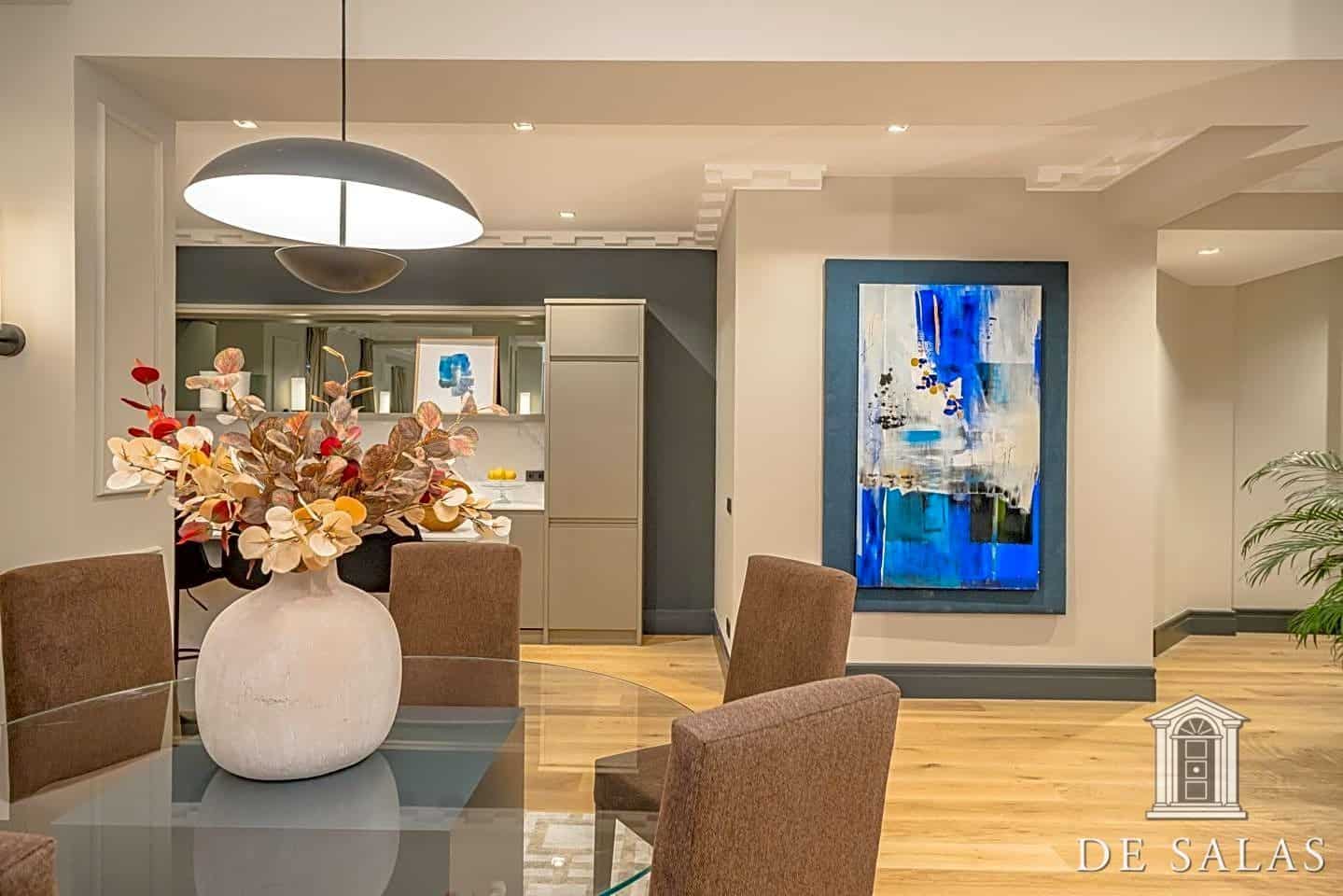 De Salas presenta esta excelente propiedad de lujo en Recoletos, junto a la calle Serrano. La vivienda tiene 225 m2 construidos. Desde el hall se accede a un amplio salón exterior en tres ambientes con gran cocina integrada con bonita isla y lavandería independiente. La zona de descanso se distribuye en tres amplios dormitorios en suite. La vivienda se ha reformado con altas calidades, cuenta con sistema de aerotermia y se entrega completamente amueblada y decorada con un cuidado estudio de interiorismo en tonos neutros. Cuenta además con aseo de cortesía. La finca tiene portero físico.