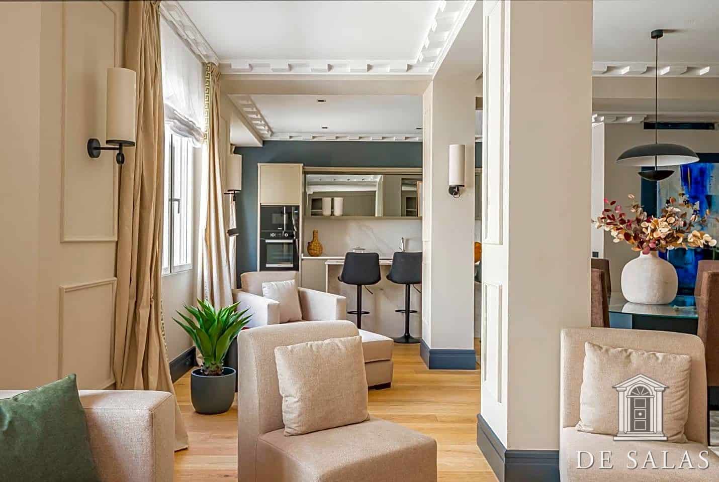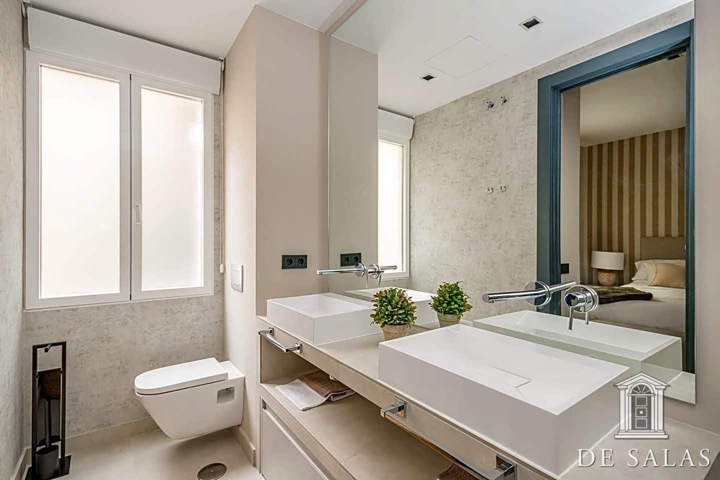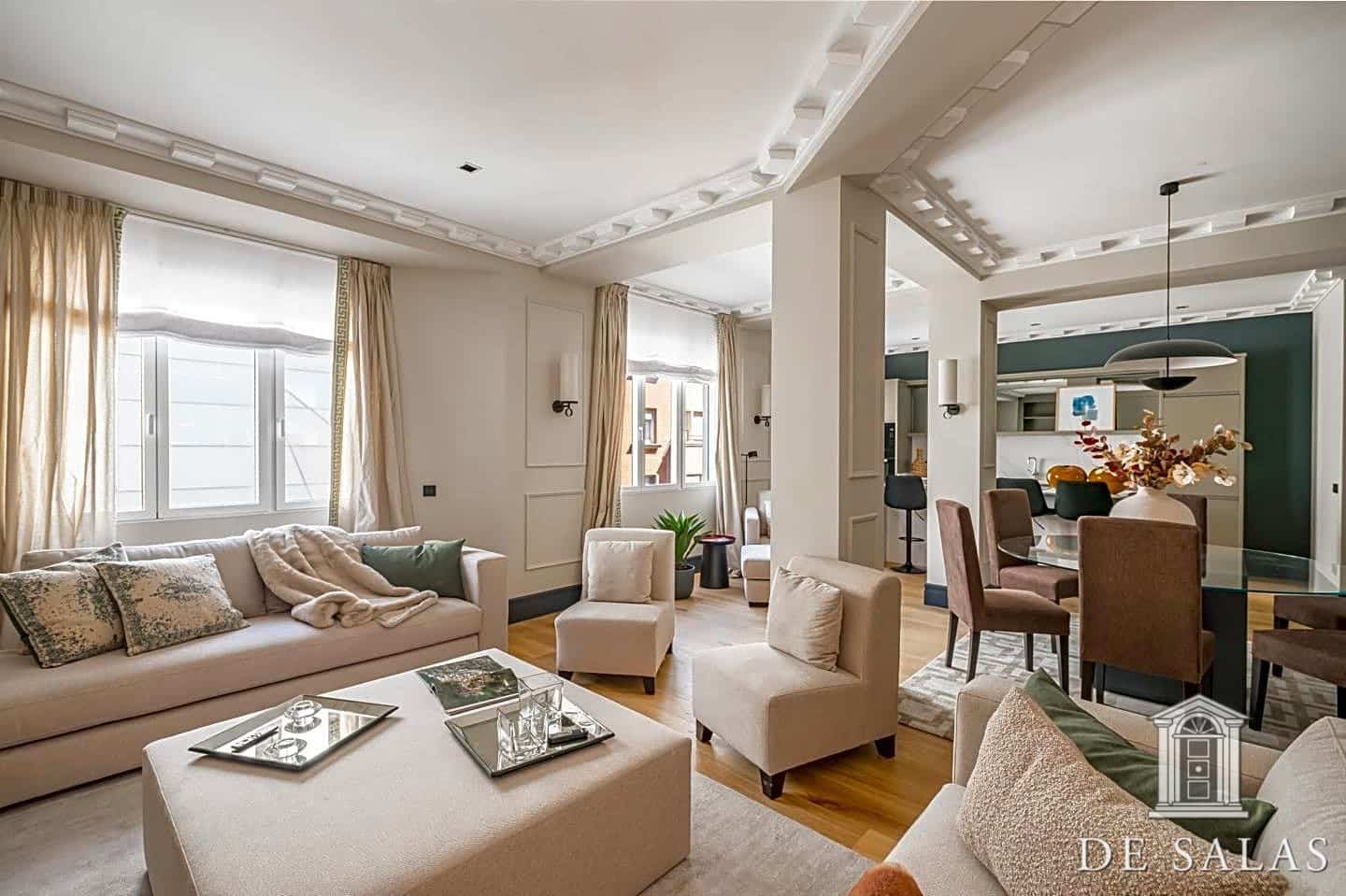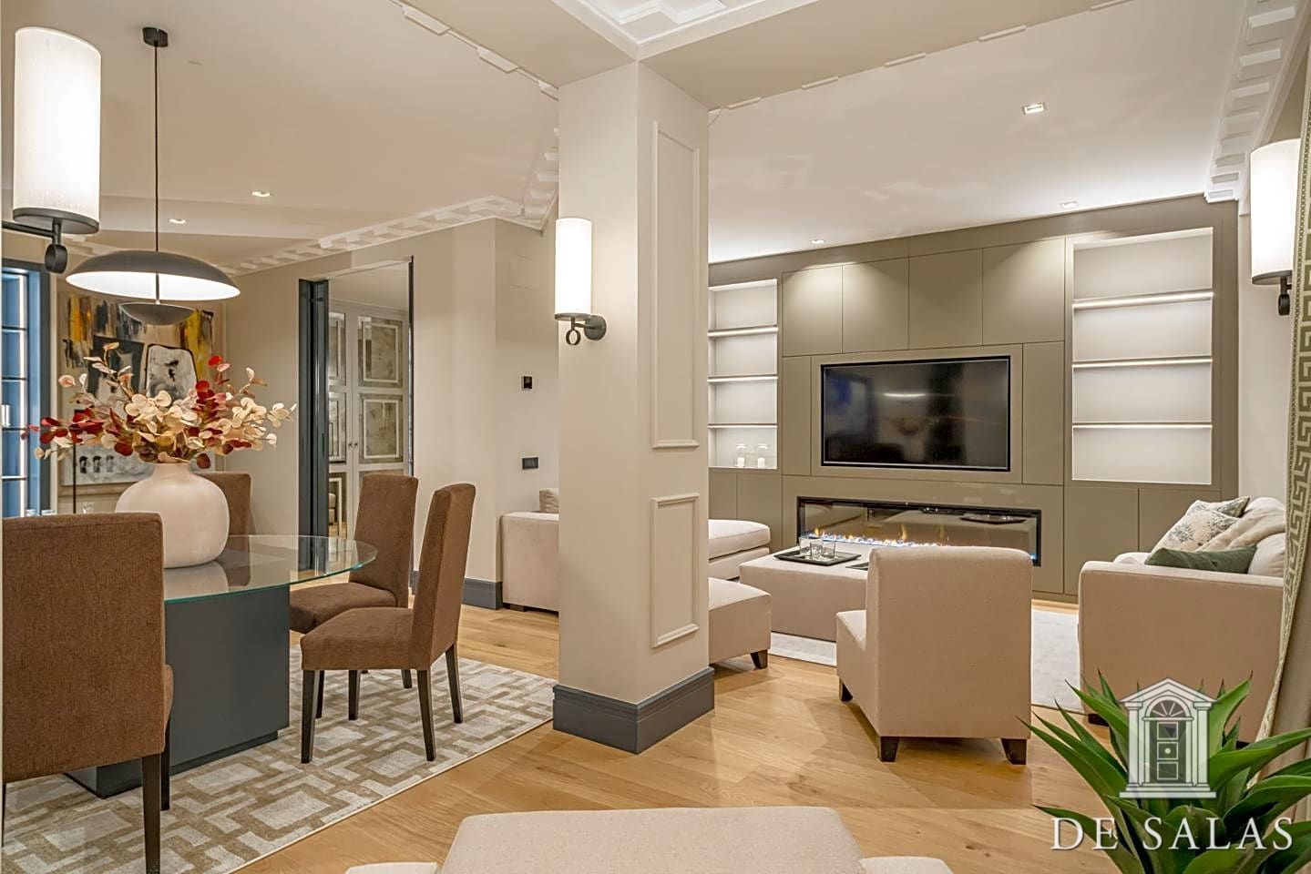 De Salas presenta esta excelente propiedad de lujo en Recoletos, junto a la calle Serrano. La vivienda tiene 225 m2 construidos. Desde el hall se accede a un amplio salón exterior en tres ambientes con gran cocina integrada con bonita isla y lavandería independiente. La zona de descanso se distribuye en tres amplios dormitorios en suite. La vivienda se ha reformado con altas calidades, cuenta con sistema de aerotermia y se entrega completamente amueblada y decorada con un cuidado estudio de interiorismo en tonos neutros. Cuenta además con aseo de cortesía. La finca tiene portero físico.