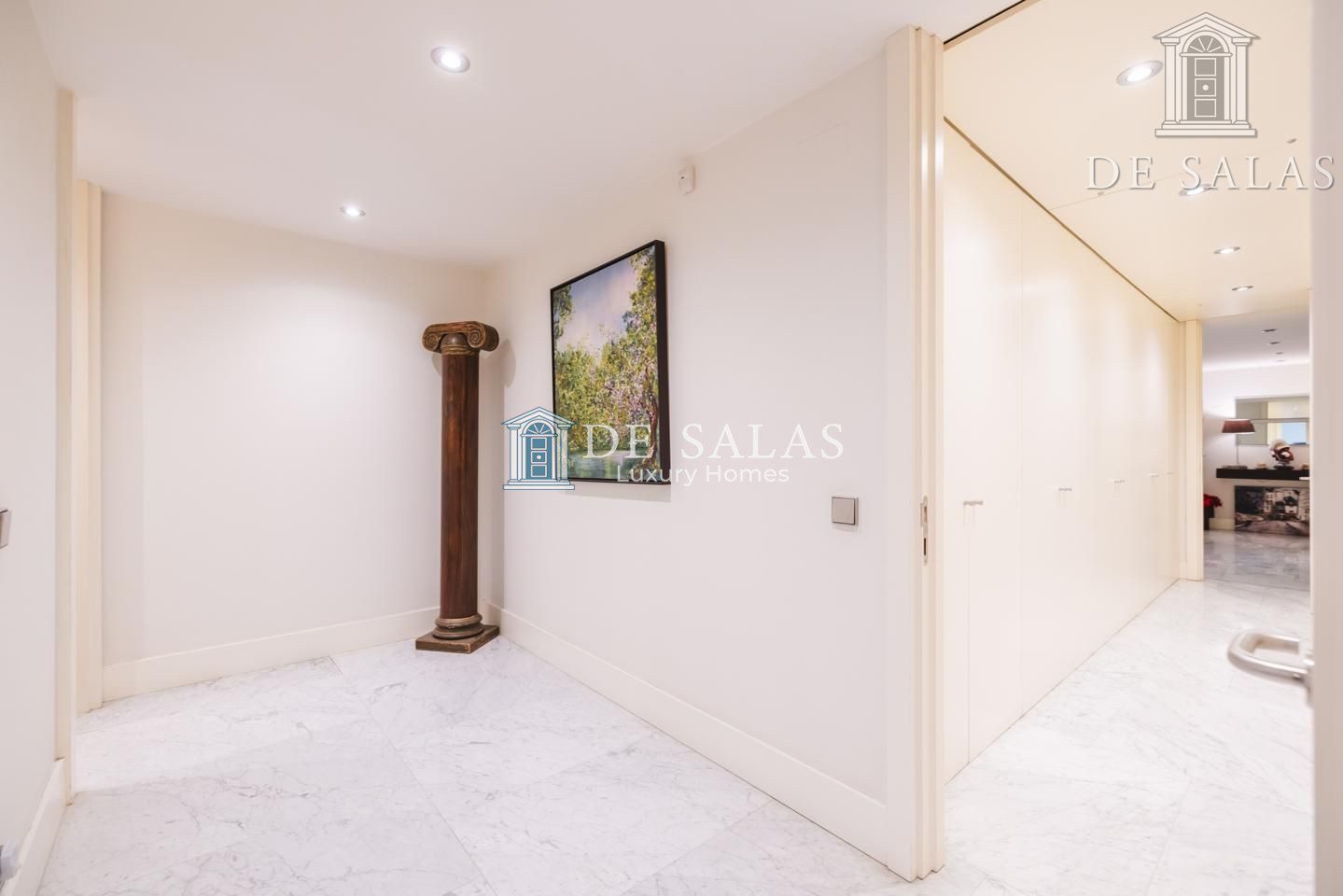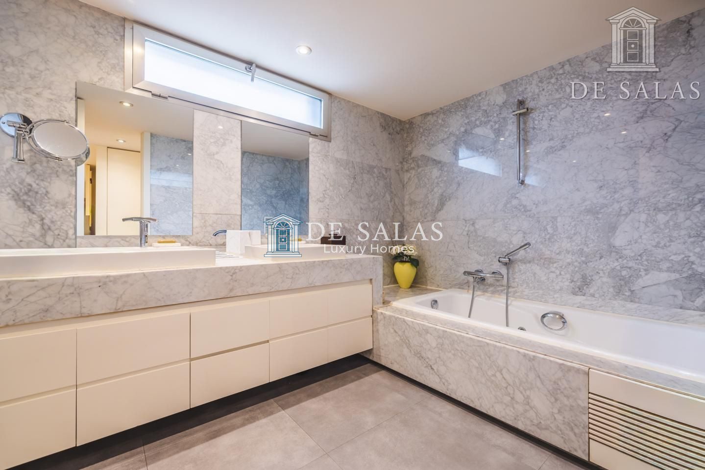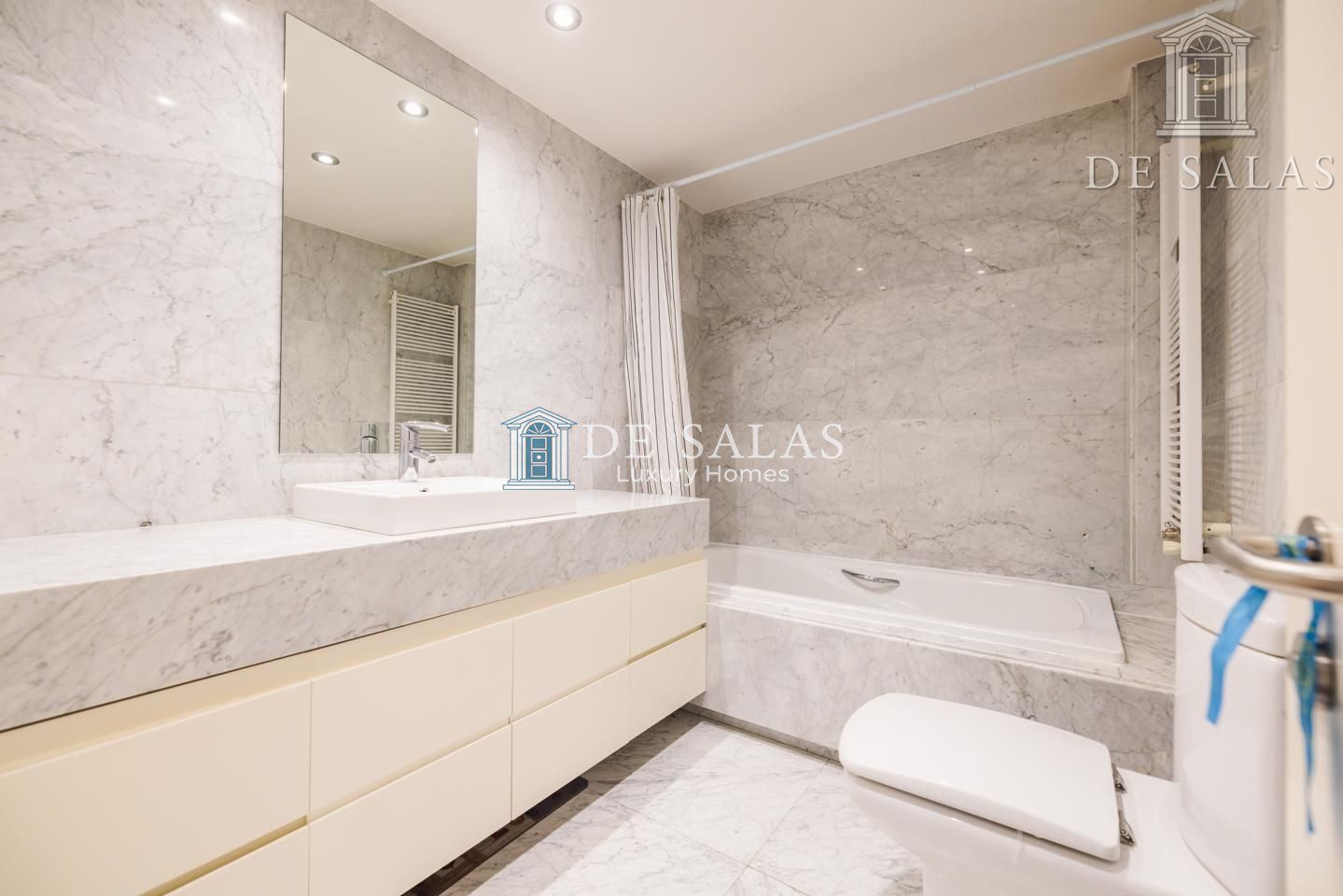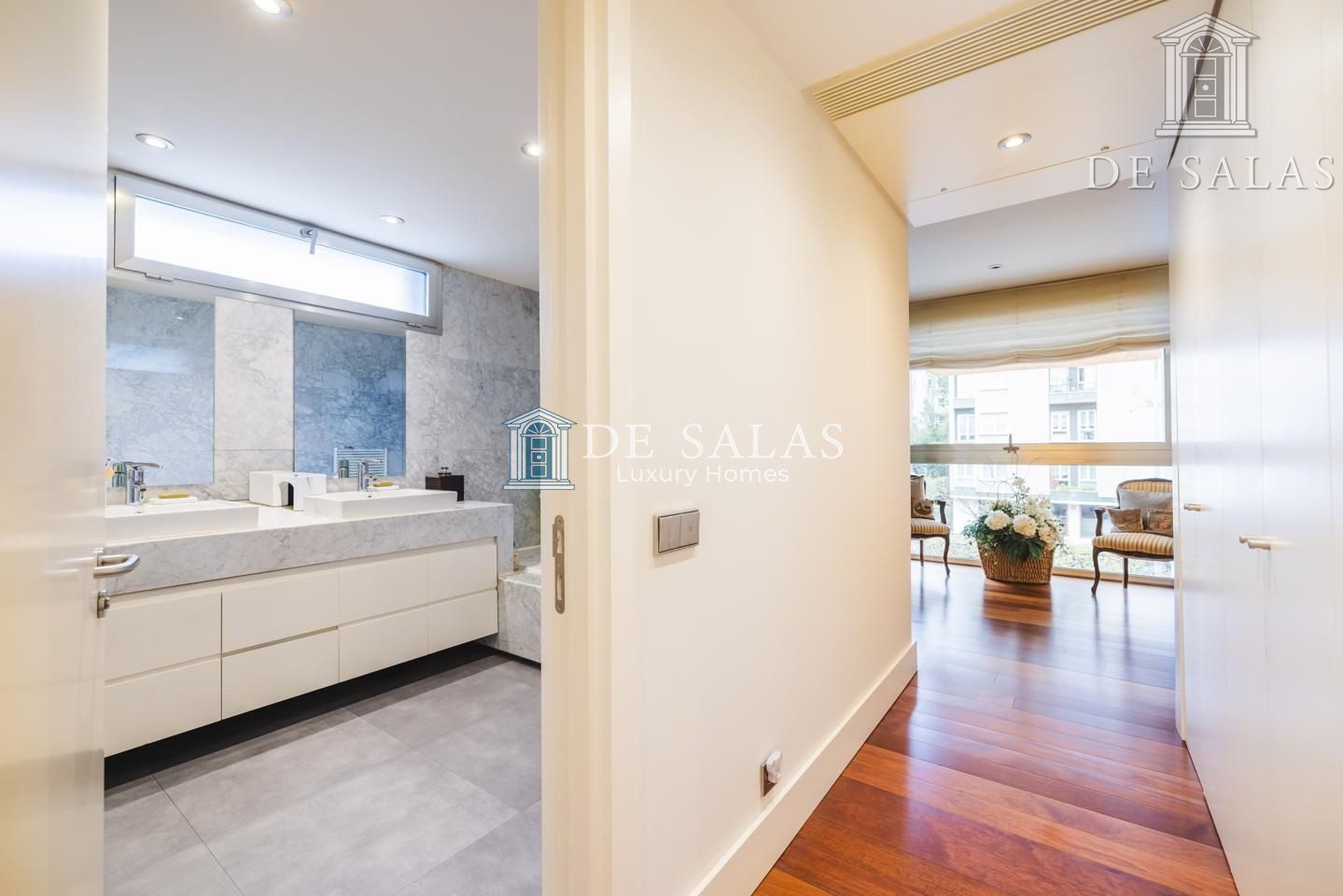 La zona de noche se encuentra completamente separada por una puerta que permite el descanso en cualquier momento. El dormitorio principal, de grandes dimensiones, cuenta con numerosos armario empotrados, además de un closet-vestidor y una zona de despacho tras una preciosa librería confeccionada a medida. El cuarto de baño en suite, de elegante mármol, tiene un amplio mueble lavabo de 2 senos, bañera y ducha, además del inodoro y bidé.