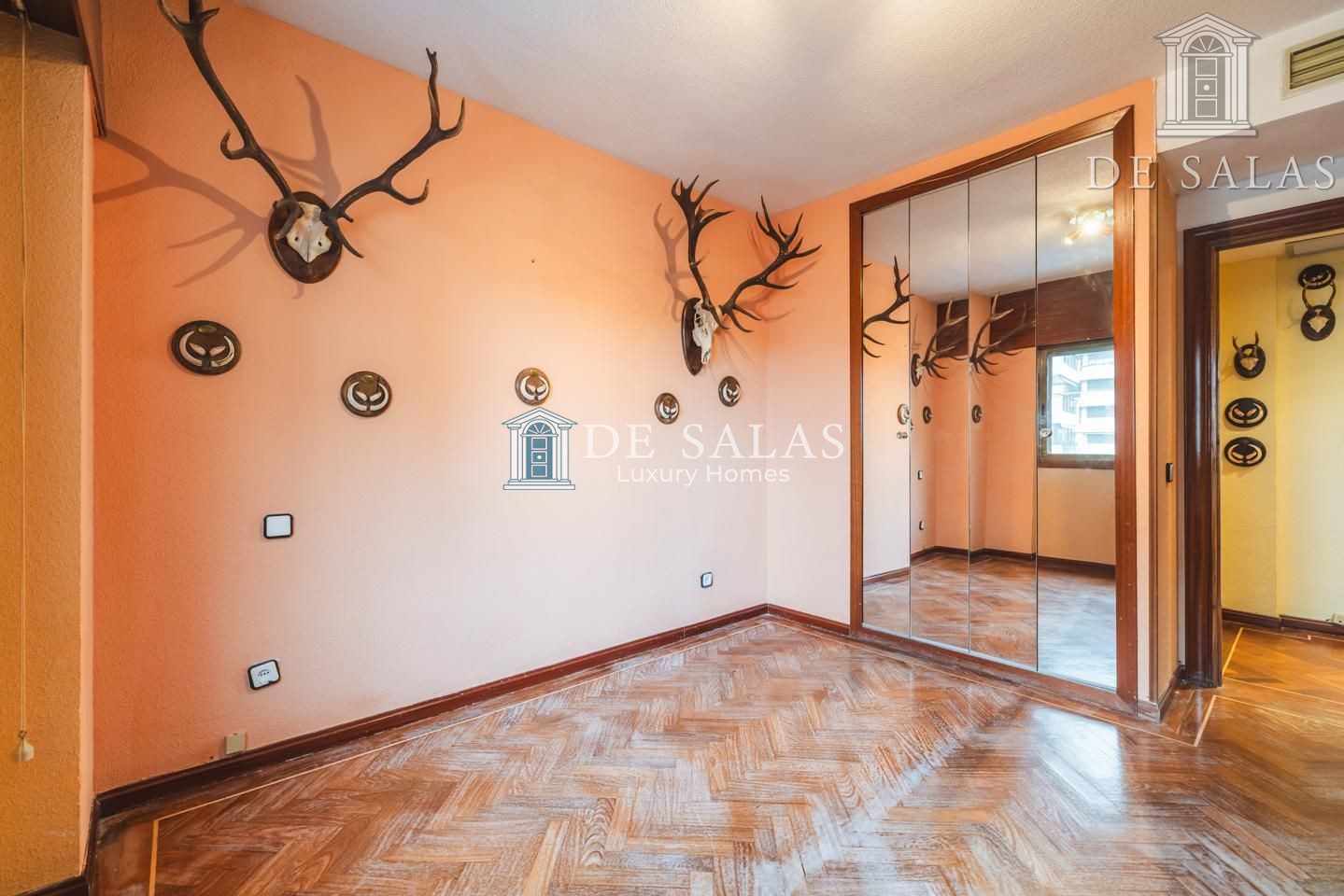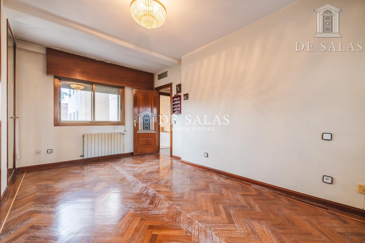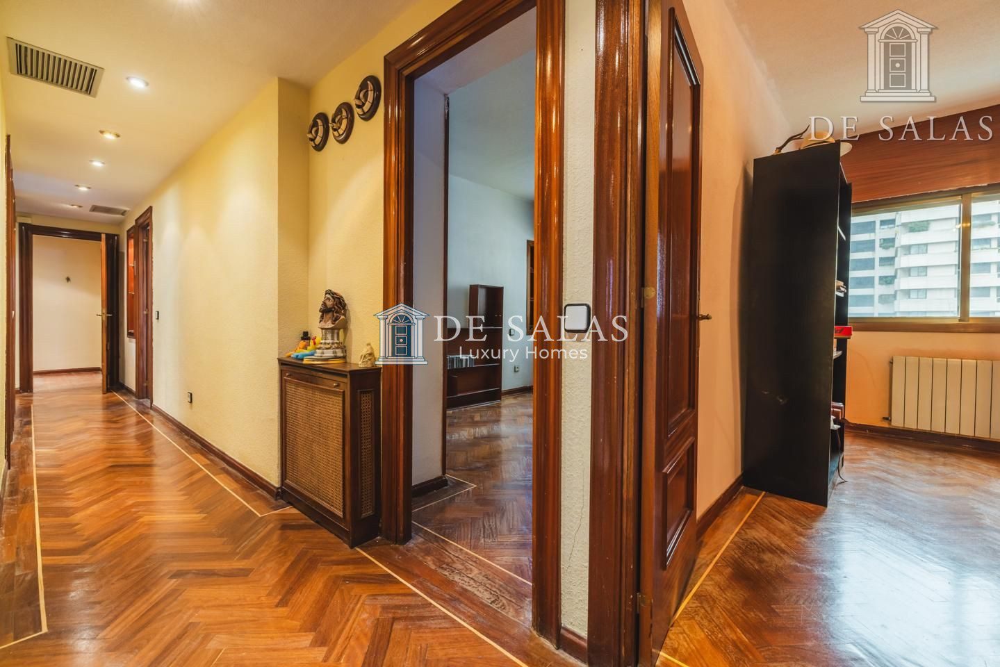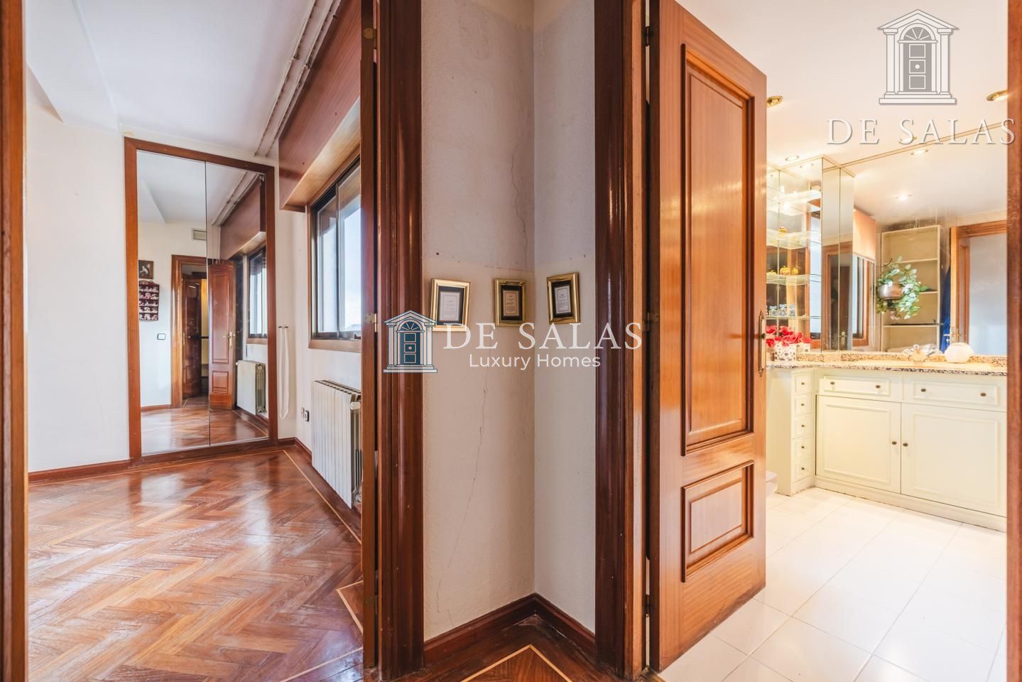 La distribución interior comienza con un hall de entrada principal que da paso al salón comedor amplio y acogedor que dispone de acceso directo a una estupenda terraza soleada, mientras que la cocina cuenta con entrada de servicio independiente y un práctico cuarto tendedero. La zona de descanso la configuran cuatro dormitorios de generoso tamaño, entre los que destaca la suite principal con su propio baño privado, además de contar con un segundo baño completo y un aseo de cortesía para las visitas. En cuanto a sus materiales, la vivienda está equipada con puerta acorazada, suelos de parquet de espiga, ventanas con doble climalit y carpintería de madera sapelí, todo ello complementado con aire acondicionado por conductos y calefacción individual de gas natural.