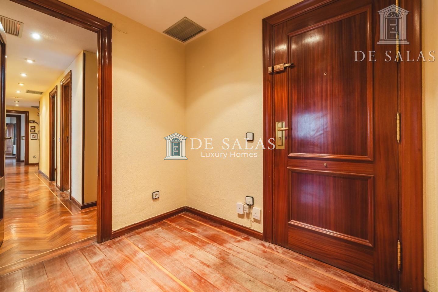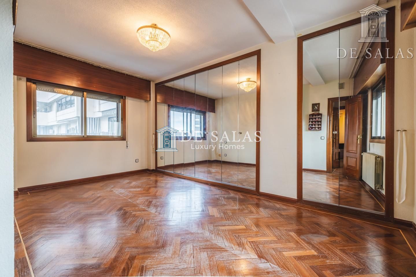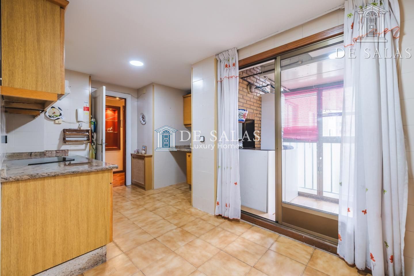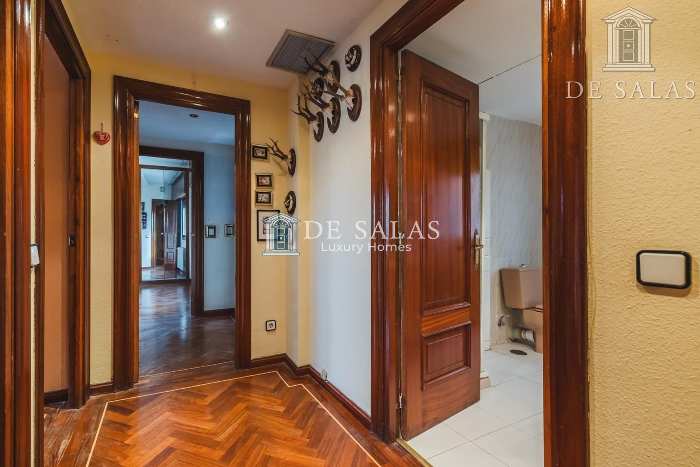 La distribución interior comienza con un hall de entrada principal que da paso al salón comedor amplio y acogedor que dispone de acceso directo a una estupenda terraza soleada, mientras que la cocina cuenta con entrada de servicio independiente y un práctico cuarto tendedero. La zona de descanso la configuran cuatro dormitorios de generoso tamaño, entre los que destaca la suite principal con su propio baño privado, además de contar con un segundo baño completo y un aseo de cortesía para las visitas. En cuanto a sus materiales, la vivienda está equipada con puerta acorazada, suelos de parquet de espiga, ventanas con doble climalit y carpintería de madera sapelí, todo ello complementado con aire acondicionado por conductos y calefacción individual de gas natural.