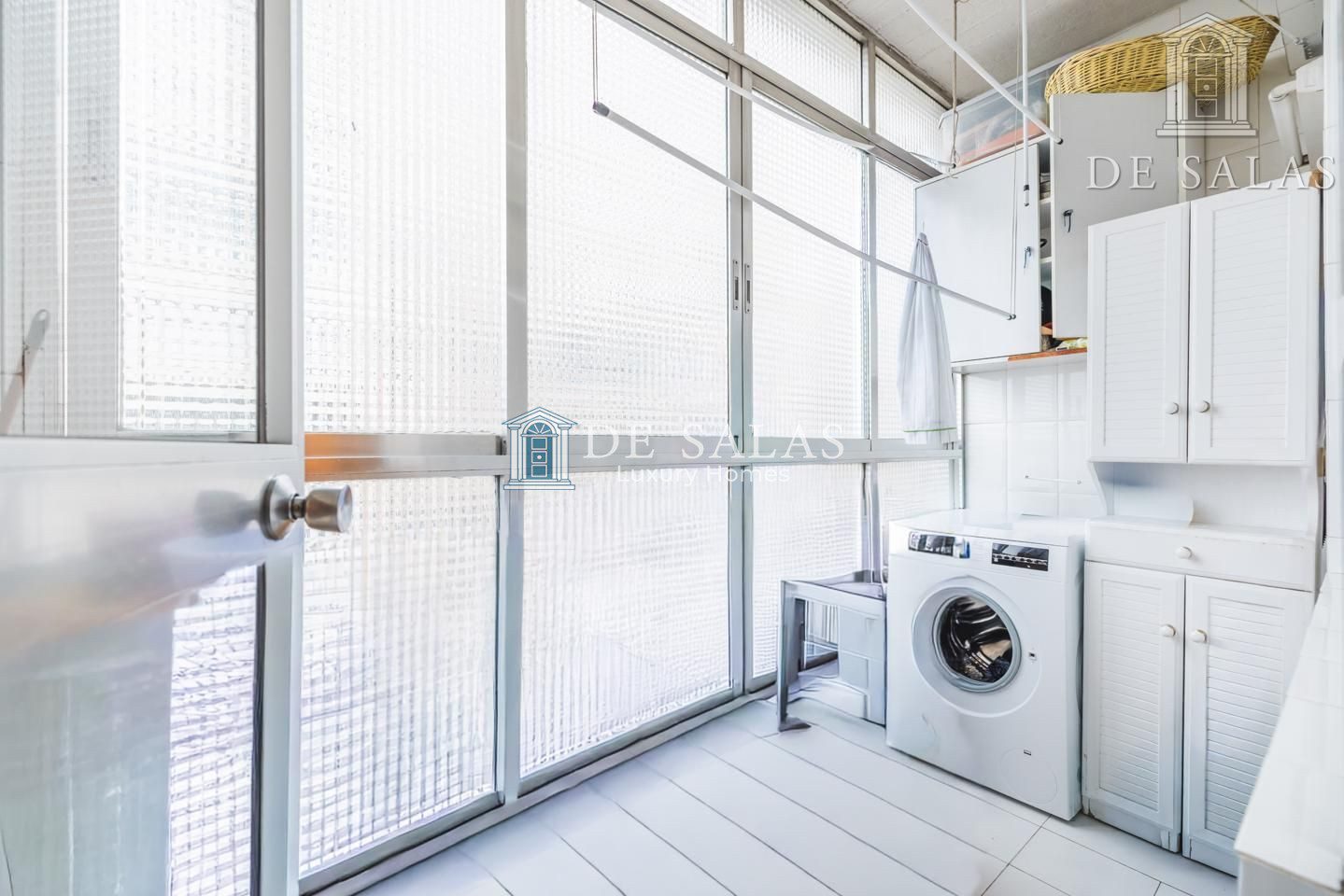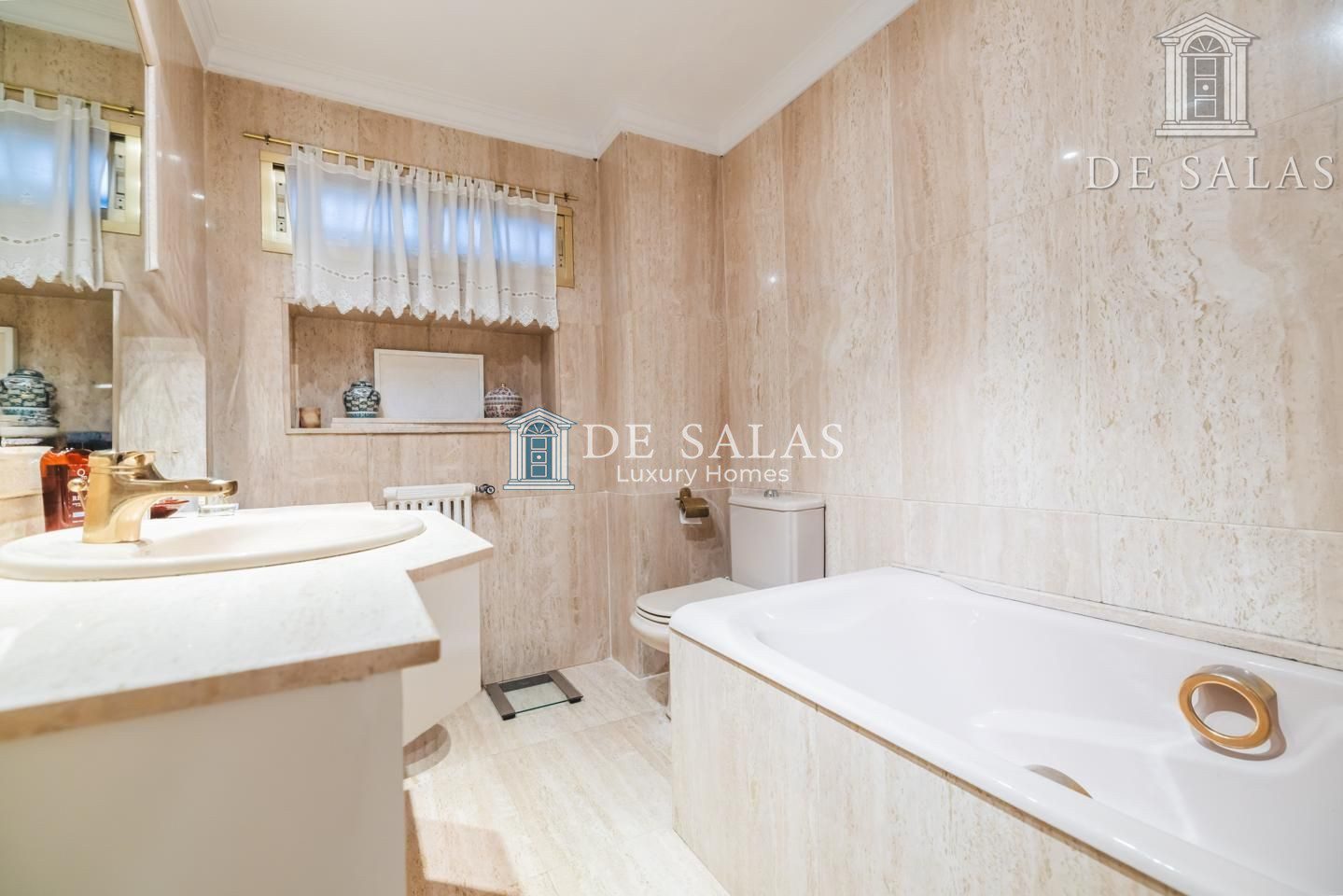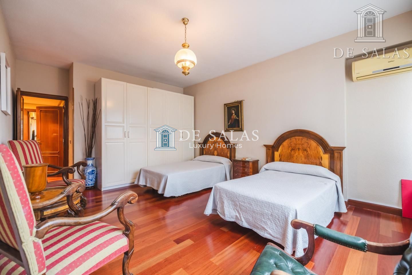 La distribución actual cuenta con cinco dormitorios de gran amplitud y tres baños. El salón es una de las piezas centrales de la propiedad debido a su gran tamaño y a sus generosos ventanales, que conectan directamente con una terraza de 21 m² orientada al sureste para aprovechar la luz del sol desde las primeras horas de la mañana. La vivienda cuenta también con comedor independiente. Entre sus detalles funcionales, la casa dispone de calefacción central con contador individual, aire acondicionado, sistema de alarma y un práctico cuarto tendedero.