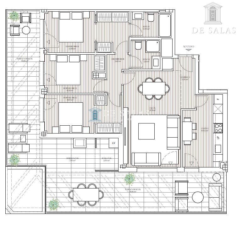 El Piso, dotado de las mejores calidades de construcción, cuenta con 166 m² catastrales, además de una maravillosa terraza de 55 m² perimetral a la que se accede tanto desde el salón como desde todos los dormitorios para disfrutar del espacio exterior durante muchos meses al año.